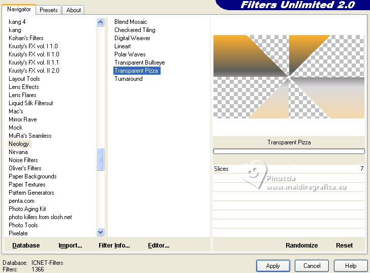 3. Effets>Modules Externes>Filters Unlimited 2.0 - Neology - Transparent Pizza, par défaut