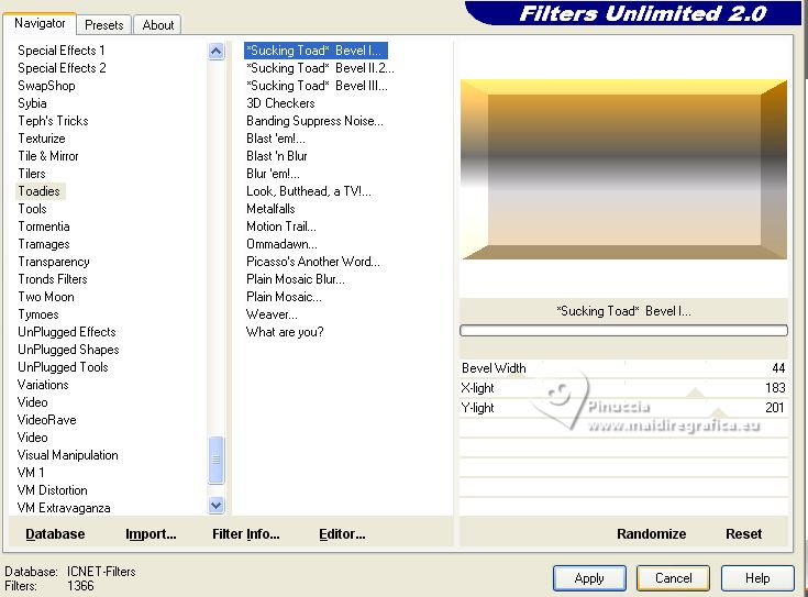 Effets>Modules Externes>Filters Unlimited 2.0 - Toadies - Sucking Toad Bevel I, par défaut