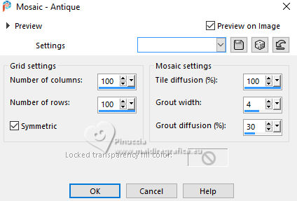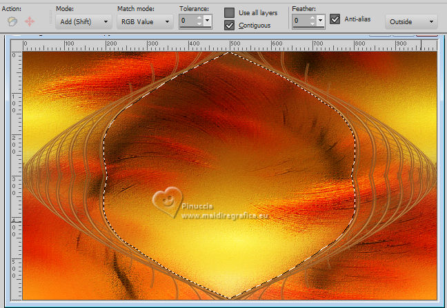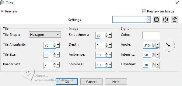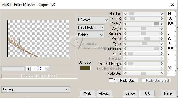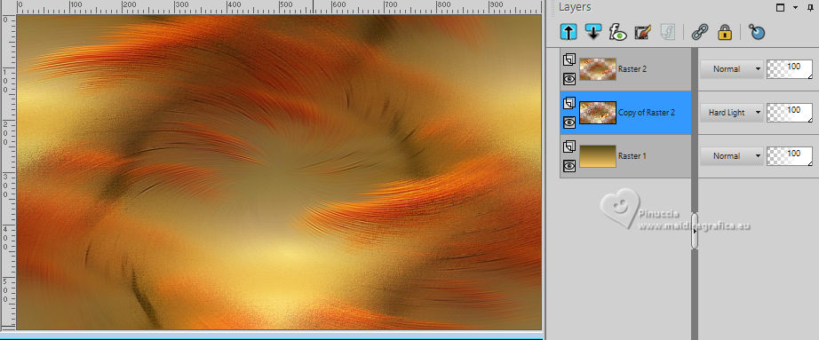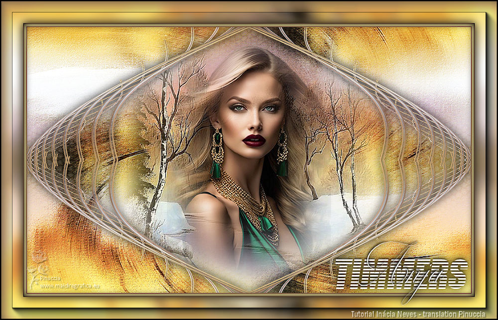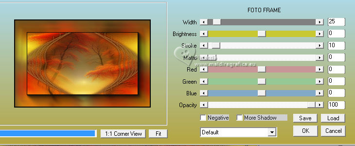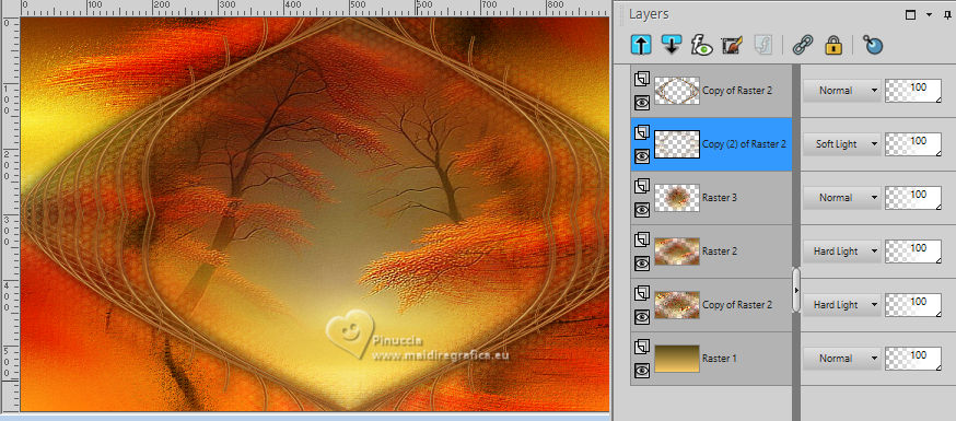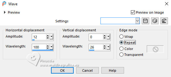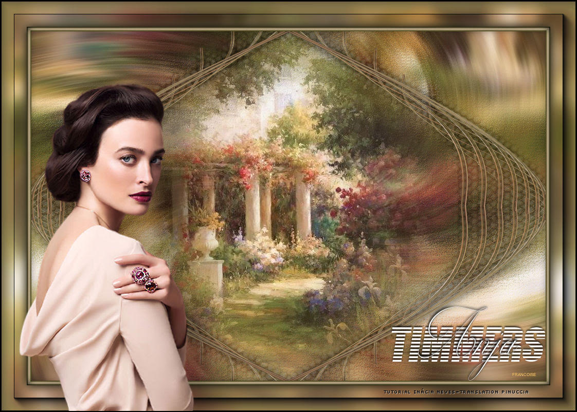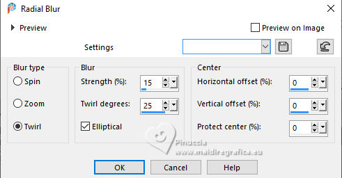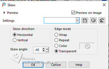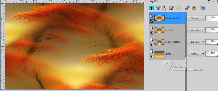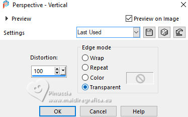 For this tutorial, you will need: ![]() The material is by Inácia Neves. (The links of the tubemakers here). Plugins consult, if necessary, my filter section here FM Tile Tools - Blend Emboss here Mura's Meister - Copies here AAA Frames - Foto Frame here ![]() You can change Blend Modes according to your colors. In the newest versions of PSP, you don't find the foreground/background gradient (Corel_06_029). You can use the gradients of the older versions. The Gradient of CorelX here ![]() 1. Choose 2 colors from your landscape tube. For me: Set your foreground color to the light color #fecd67, and your background color to the dark color #534619. ![]() Set your foreground color to a Foreground/Background Gradient, style Linear. ![]() 2. Open a new transparent image 1000 x 600 pixels. Flood Fill the transparent image with your Gradient.3. Layers>New Raster Layer. Selections>Select All. Open your landscape misted IN_078_MistedPaisagem ![]() Edit>Copy. Go back to your work and go to Edit>Paste into Selection. Selections>Select None. 4. Adjust>Sharpness>Sharpen More. Effects>Image Effects>Seamless Tiling, default settings. ![]() Adjust>Blur>Radial Blur. ![]() 5. Effects>Edge Effects>Enhance More. Layers>Duplicate. Effects>Texture Effects>Mosaic Antique ![]() 6. Effects>Plugins>FM Tile Tools - Blend Emboss, default settings. ![]() Layers>Arrange>Move Down. Change the Blend Mode of this layer to Hard Light, opacity 100%. ![]() 7. Activate your top layer Raster 2. Change the Blend Mode of this layer to Hard Light, opacity 100%. Layers>Duplicate. Change the Blend Mode of this layer to Normal. ![]() 8. Effects>Geometric Effects>Perspective Vertical ![]() Image>Flip>Flip Vertical. Repeat Effects>Geometric Effects>Perspective Vertical, same settings ![]() ![]() 9. Effects>Geometric Effects>Skew ![]() Effects>Distortion Effects>Wave ![]() 10. Effects>Plugins>Mura's Meister - Copies. ![]() Layers>Duplicate. Image>Mirror>Mirror Vertical. Layers>Merge>Merge Down. Layers>Duplicate. Image>Mirror>Mirror Horizontal. Layers>Merge>Merge Down. 11. Activate your Magic Wand Tool ![]() and click in the center of the Effect to select it. ![]() 12. Layers>New Raster Layer. Edit>Paste into Selection (the misted IN_078_MistedPaisagem is still in memory). Effects>Plugins>FM Tile Tools - Blend Emboss, default settings. Adjust>Sharpness>Sharpen More. Selections>Select None. Layers>Arrange>Move Down. 13. Activate your top layer. Effects>3D Effects>Drop Shadow, color black. ![]() Adjust>Sharpness>Sharpen. Layers>Duplicate. Adjust>Blur>Gaussian Blur - radius 30. ![]() Effects>Texture Effects>Tiles ![]() Change the Blend Mode of this layer to Soft Light Opacity 100%. Layers>Arrange>Move Down. 14. Your tag and the layers ![]() Note: In my second version, I placed the main Tube now, before making the edges, but in the original work I only included it later. The placement of the main tube is up to your taste. 15. Image>Add borders, 2 pixels, symmetric, dark color #534619. Image>Add borders, 5 pixels, symmetric, light color #fecd67. Image>Add borders, 2 pixels, symmetric, dark color #534619. 16. Edit>Copy Selections>Select All. Image>Add borders, 50 pixels, symmetric, whatever color. Selections>Invert. Edit>Paste into Selection Adjust>Blur>Gaussian Blur - radius 10. ![]() Effects>3D Effects>Drop Shadow, color black. ![]() 17. Effects>Plugins>AAA Frames - Foto Frame. ![]() Selections>Invert. Effects>3D Effects>Drop Shadow, color black. ![]() Selections>Select None. 18. Activate your main tube IN_077_Mulher ![]() Edit>Copy. Go back to your work and go to Edit>Paste as new layer. Resize, place and apply Effects and/or Drop Shadow at your choice. 19. Open WA_Anja_Inacia ![]() Edit>Copy. Go back to your work and go to Edit>Paste as new layer. Place and apply effects to your liking. 20. Image>Add Borders, 2 pixels, symmetric, color black #000000. 21. Image>Resize, if you want, resize all layers checked. Sign your work and save as jpg. For the tubes of these versions thanksz Silvie and Leny ![]() Luz Cristina and Guismo ![]() ![]() Your versions. Thanks![]() Françoise ![]() Jolcsi ![]() Louise ![]() ![]() If you have problems or doubts, or you find a not worked link, or only for tell me that you enjoyed this tutorial, write to me. |