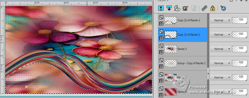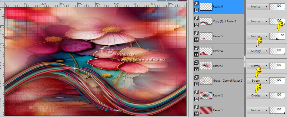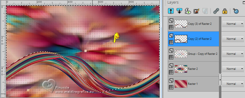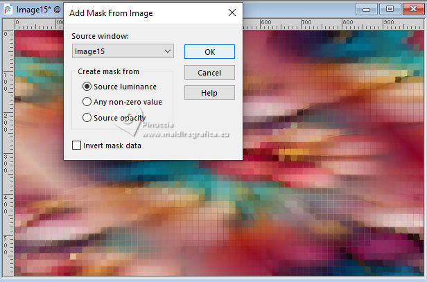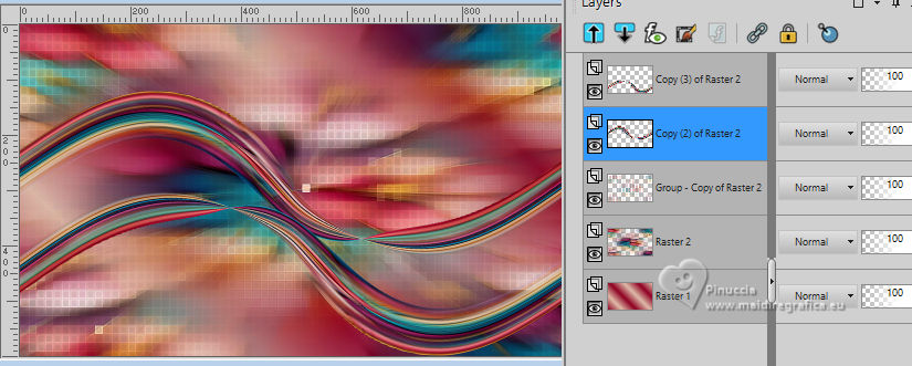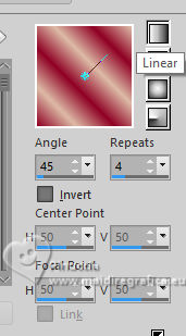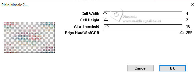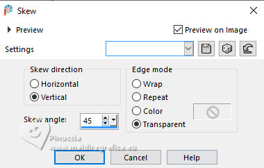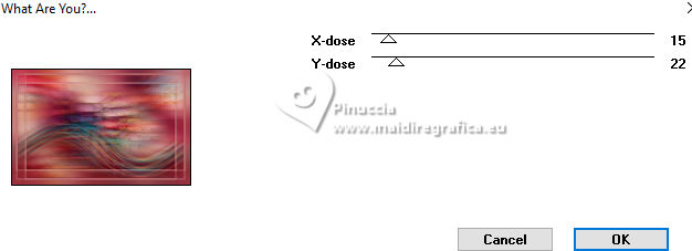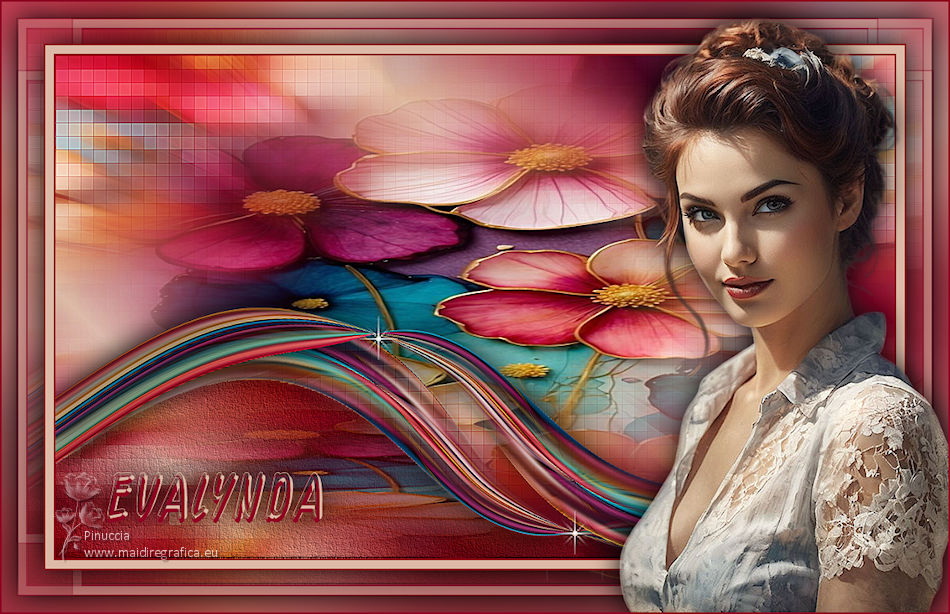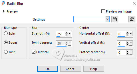 For this tutorial, you will need: ![]() The material is by Inácia Neves. (The links of the tubemakers here). Plugins consult, if necessary, my filter section here Filters Unlimited 2.0 here Toadies - What are you, Plain Mosaic2 here Flaming Pear - Flexify 2 here Filters Toadies can be used alone or imported into Filters Unlimited. (How do, you see here) If a plugin supplied appears with this icon ![]() You can change Blend Modes according to your colors. In the newest versions of PSP, you don't find the foreground/background gradient (Corel_06_029). You can use the gradients of the older versions. The Gradient of CorelX here ![]() Copy the Picture Tube Sparkle1 in the Picture Tubes Folder. 1. Choose 2 colors from your Flower or Landscape misted. For me: Set your foreground color to the dark color #8f0224, and your background color to the light color #ddbaa7. ![]() Set your foreground color to a Foreground/Background Gradient, style Linear. ![]() 2. Open a new transparent image 1000 x 600 pixels. Flood Fill the transparent image with your Gradient.3. Layers>New Raster Layer. Selections>Select All. Open your Flower misted IN_046_MistedFloracolorido ![]() Edit>Copy. Go back to your work and go to Edit>Paste Into Selection. Selections>Select None. 4. Adjust>Sharpness>Sharpen More. Effects>Image Effects>Seamless Tiling, default settings. ![]() Adjust>Blur>Radial Blur. ![]() 5. Effects>Edge Effects>Enhance. Layers>Duplicate - 2 times. Close the layer Copy(2) of Raster 2. Activate the layer above, Copy of Raster 2. Effects>Plugin>Toadies - Plain Mosaic2 ![]() 6. Layers>New Mask Layer>From Image ATTENTION: Use the image you are working with as a mask. The one I am working with is Image 15. If you have previously opened other images or duplicated your material, the name of your image may change. ![]() Layers>Merge>Merge Group. Adjust>Sharpness>Sharpen More. 7. Open and activate the layer Copy(2) of Raster 2. Effects>Geometric Effects>Skew. ![]() Effects>Plugin>Flaming Pear> - Flexify 2 ![]() 8. Layers>Duplicate. Layers>Merge>Merge Down. Effects>Edge Effects>Enhance. Effects>Distortion Effects>Wave ![]() 9. Layers>Duplicate. Image>Mirror>Mirror Horizontal. Image>Mirror>Mirror Vertical. Objects>Align>Bottom. 10. Activate the layer Copy(2) of Raster. ![]() Objects>Align>Bottom. Activate your Magic Wand Tool , tolerance 10![]() Click on the top zone of the effect to select it. ![]() 11. Layers>New Raster Layer. Edit>Paste into Selection (your Flower Misted is still in memory). Selections>Select None. Adjust>Sharpness>Sharpen More. Layers>Arrange>Move Down. 12. Activate the layer Copy(2) of Raster 2. Click with your Magic Wand Tool ![]() on the bottom zone of the effect. ![]() Layers>New Raster Layer. Flood Fill the layer with your Gradient.Effects>Texture Effects>Fine Leather, foreground color. ![]() 13. Keep selected. Layers>New Raster Layer. Edit>Paste Into Selection (your misted is always in memory). Adjust>Sharpness>Sharpen More. Reduce the opacity of this layer to 50%. Selections>Select None. 14. Activate the layer Raster 4. Layers>Arrange>Move Down. Activate the layer Raster 5. Layers>Arrange>Move Down. Activate the layer Copy (2) of Raster 2. Effects>3D Effects>Drop Shadow, color #000000 ![]() Activate the Copy(3) of Raster 2. Edit>Repeat Drop shadow. Layers>Merge>Merge Down. 15. Layer>New Raster Layer. Activate your Picture Tube Tool ![]() select the Picture tube Sparkle1 ![]() Apply 2 times the picture tube on your work, see my example. Effects>Edge Effects>Enhance More. Your tag and the layers: change the Blend Modes as below (of course, you may change to your liking or according to your colors). ![]() Layers>Merge>Merge All. 16. Image>Add Borders, 2 pixels, symmetric, dark color #8f0224. Image>Add Borders, 10 pixels, symmetric, light color #ddbaa7. Image>Add Borders, 2 pixels, symmetric, dark color #8f0224. Selections>Select All. Edit>Copy. 17. Image>Add Borders, 50 pixels, symmetric, whatever color. Selections>Invert. Edit>Paste>Into Selection. Adjust>Blur>Gaussian Blur - radius 20,00. ![]() Effects>Plugin>Toadies - What are You? ![]() 18. Selections>Invert. Effects>3D Effects>Drop Shadow, color #000000 ![]() 19. Selections>Select All. Selections>Modify>Contract - 20 pixels. ![]() Effects>3D Effects>Drop Shadow. ![]() Selection>Select None. 20. Open Evalynda_corclara_Inacia ![]() Colorize according to your colors. Edit>Copy. Go back to your work and go to Edit>Paste as New Layer. 21. Open Evalynda_corescura_Inacia ![]() Colorize according to your colors. Edit>Copy. Go back to your work and go to Edit>Paste as New Layer. Place the texts one over the other,lika a shadow effect. Layers>Merge>Merge Down. Move the text at the bottom left, or to your liking.Effects>3D Effects>Drop Shadow, at your choice. 22. Open your main tube IN_044_Mulherdelicada ![]() Edit>Copy. Go back to your work and go to Edit>Paste as New Layer. Resize, place and apply the effects to your liking. 23. Finish with a border: Image>Add Borders, 2 pixels, symmetric, dark color #8f0224. 24. If you want, resize at your choice. Sign your work and save as jpg. For the tubes of these versions Mentali and Silvie ![]() Luz Cristina and Silvie ![]() ![]() Your versions. Thanks![]() Jolcsi ![]() Gypsie ![]() Kika ![]() Marion ![]() Melodi ![]() Lynnette ![]() Aria ![]() ![]() If you have problems or doubts, or you find a not worked link, or only for tell me that you enjoyed this tutorial, write to me. |