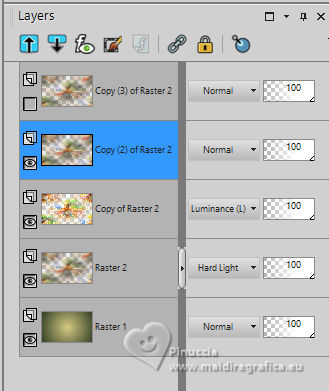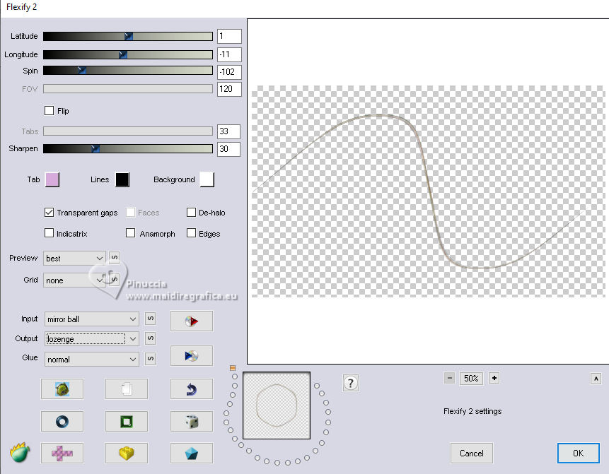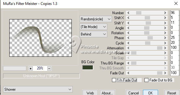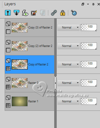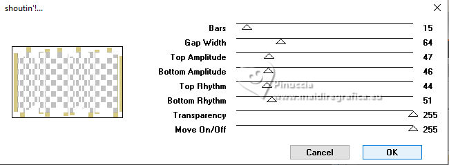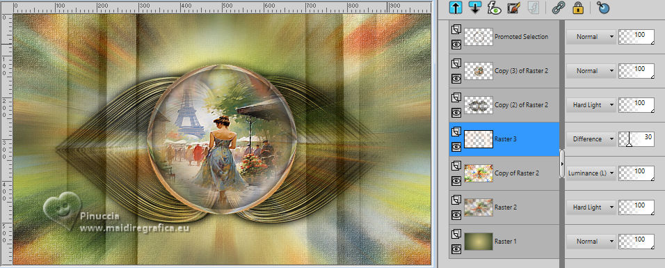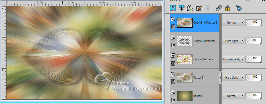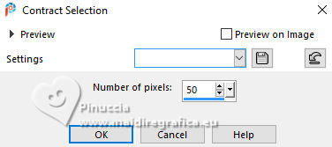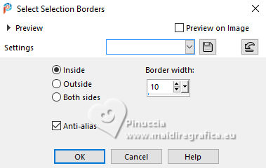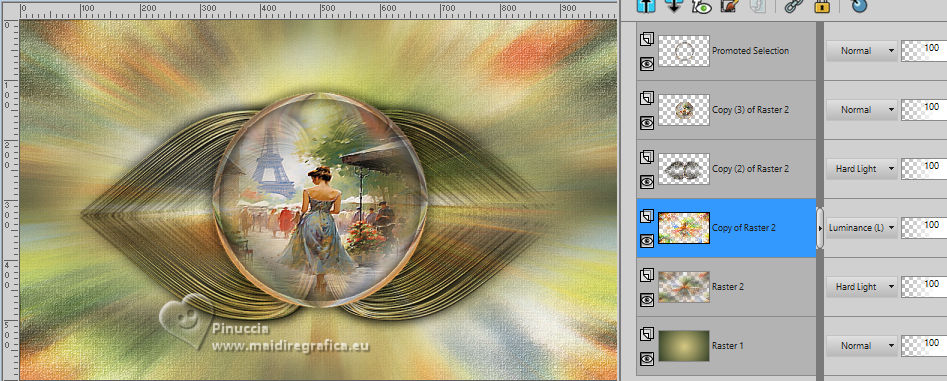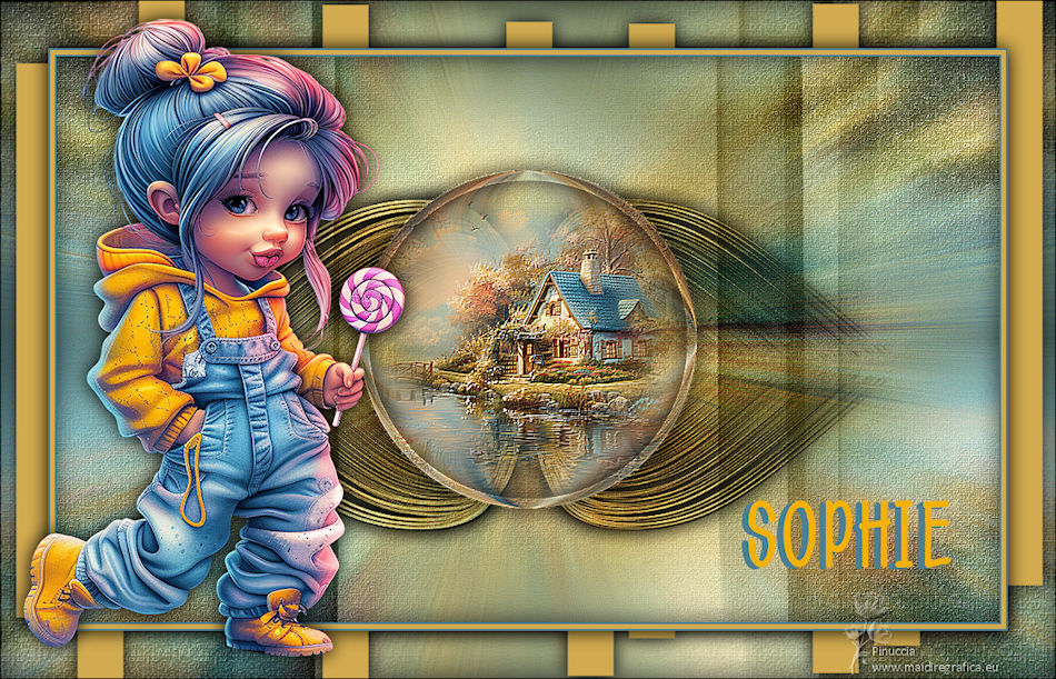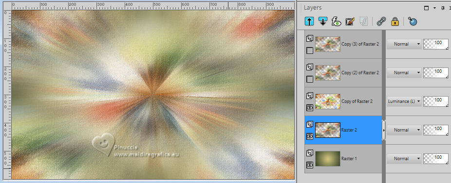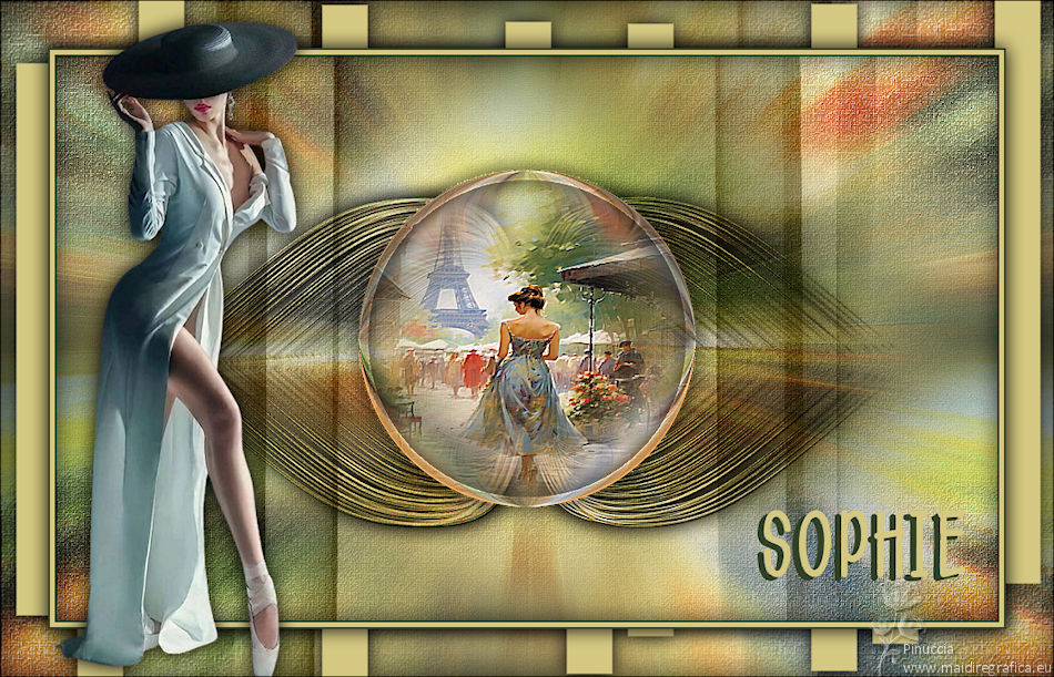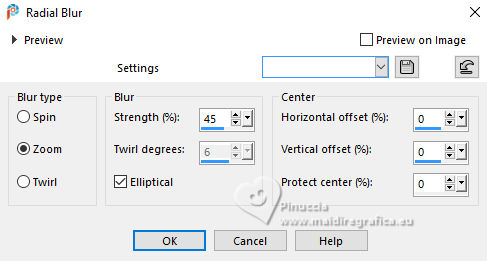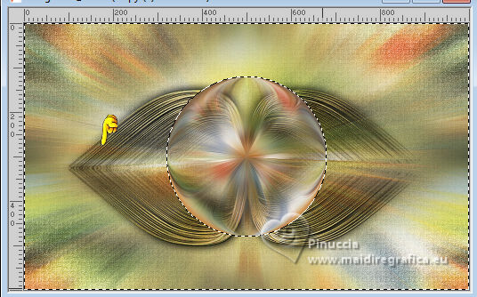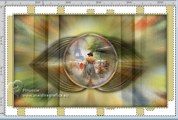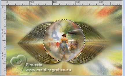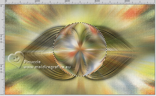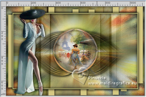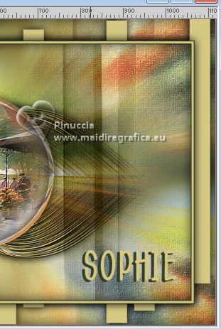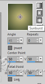 For this tutorial, you will need: ![]() The material is by Inácia Neves. (The links of the tubemakers here). Plugins consult, if necessary, my filter section here Filters Unlimited 2.0 here Virtual Painter - Virtual Painter 4 here FM Tile Tools - Blend Emboss here Flaming Pear - Flexify 2 here Mura's Meister - Copies here VM Extravaganza - Shoutin'! here Filters VM Extravaganza can be used alone or imported into Filters Unlimited. (How do, you see here) If a plugin supplied appears with this icon ![]() You can change Blend Modes according to your colors. In the newest versions of PSP, you don't find the foreground/background gradient (Corel_06_029). You can use the gradients of the older versions. The Gradient of CorelX here ![]() 1. Choose 2 colors from your landscape tube. For me: Set your foreground color to the light color #d5c882, and your background color to the dark color #324027. ![]() Set your foreground color to a Foreground/Background Gradient, style Sunburst. ![]() 2. Open a new transparent image 1000 x 600 pixels. Flood Fill the transparent image with your Gradient.3. Layers>New Raster Layer. Selections>Select All. Open your misted IN_081_MistedPaisagem ![]() Edit>Copy. Go back to your work and go to Edit>Paste into Selection. Selections>Select None. 4. Adjust>Sharpness>Sharpen More. Effects>Image Effects>Seamless Tiling, default settings. ![]() Adjust>Blur>Radial Blur. ![]() 5. Effects>Edge Effects>Enhance More. Layers>Duplicate - 3 times. Close the layers Copy(2) of Raster 2 and Copy (3) of Raster 2. Activate the layer Copy of Raster 2. ![]() 6. Effects>Plugins>Virtual Painter - Virtual Painter 4. Filter - Pastel - Material - Canvas (Fine) ![]() 7. Effects>Plugins>FM Tile Tools - Blend Emboss, default settings. ![]() Change the Blend Mode of this layer to Luminance (L), opacity 100%. 8. Activate the layer Raster 2. ![]() Change the Blend Mode of this layer to Hard Light, opacity 100%. 9. Open the layer Copy (2) of Raster 2. ![]() Effects>Geometric Effects>Perspective Horizontal. ![]() Image>Mirror>Mirror Horizontal. Repeat Effects>Geometric Effects>Perspective Horizonta, same settings. ![]() 10. Effects>Plugins>Flaming Pear - Flexify 2. ![]() 11. Effects>Plugins>Mura's Meister - Copies. ![]() 12. Image>Resize, to 80%, resize all layers not checked. Layers>Duplicate. Image>Flip>Flip Vertical. Layers>Merge>Merge Down. Effects>3D Effects>Drop Shadow, color black. ![]() Effects>3D Effects>Drop Shadow, color black. ![]() Adjust>Sharpness>Sharpen More. Change the Blend Mode of this layer to Hard Light. 13. Open and activate the layer Copy(3) of Raster 2. ![]() Effects>Geometric Effects>Circle. ![]() Image>Resize, to 60%, resize all layers not checked. Activate your Magic Wand Tool ![]() ![]() Click outside the circle to select it ![]() Selections>Invert. ![]() 14. Layers>New Raster Layer. The landscape misted IN_081_MistedPaisagem is still in memory. Edit>Paste into Selection. ![]() Adjust>Sharpness>Sharpen More. Effects>Plugins>FM Tile Tools - Blend Emboss, default settings. Layers>Arrange>Move Down. Keep selected. 15. Selections>Modify>Select Selection Borders. ![]() Selections>Promote Selection to Layer. Effects>3D Effects>Drop Shadow, color black. ![]() Adjust>Sharpness>Sharpen. Selections>Select None. 16. Activate the layer Copy of Raster 2. ![]() Open Decor_Sophie_Inacia ![]() Edit>Copy. Go back to your work and go to Edit>Paste as new layer. Change the Blend Mode of this layer to Difference and reduce the opacity to 30%. 17. Your tag and the layers. ![]() 18. Layers>Merge>Merge visible. Selections>Select None. Edit>Copy 19. Image>Add borders, 2 pixels, symmetric, dark color #324027. Image>Add borders, 5 pixels, symmetric, light color #d5c882. Image>Add borders, 2 pixels, symmetric, dark color #324027. Selections>Select All. Image>Add borders, 50 pixels, symmetric, whatever color. Selections>Invert. Edit>Paste into Selection Keep Selected. 20. Layers>New Raster Layer. Set your foreground color to Color. Flood Fill with your light foreground color #d5c882.Effects>Plugins>VM Extravaganza - Shoutin', default settings. ![]() 21. Selections>Select None. Activate your Magic Wand Tool ![]() and click in the white zones to select them ![]() Press CANC on the keyboard ![]() Selections>Invert. Effects>3D Effects>Drop Shadow, color black. ![]() Selections>Select None. 22. Selections>Select All. Selections>Modify>Contract - 50 pixels. ![]() Effects>3D Effects>Drop Shadow, color black #000000. ![]() Selections>Select None. 23. Activate your main tube IN_082_Mulher ![]() Edit>Copy. Go back to your work and go to Edit>Paste as new layer. Resize, Place and apply the effects to your liking. For me ![]() 24. Open TituloSophie_Inacia ![]() Edit>Copy. Go back to your work and go to Edit>Paste as new layer. Resize, Place and apply the effects to your liking. For me ![]() 25. Image>Add Borders, 1 pixels, symmetric, color black #000000. 26. Resize if you want. Sign your work and save as jpg. For the tubes of this version thanks Adrienne. ![]() ![]() Your versions. Thanks![]() Lynnette ![]() Jolcsi ![]() Marion ![]() Louise ![]() ![]() If you have problems or doubts, or you find a not worked link, or only for tell me that you enjoyed this tutorial, write to me. |