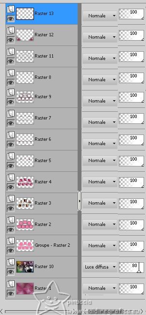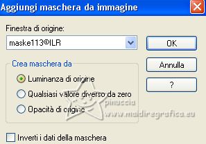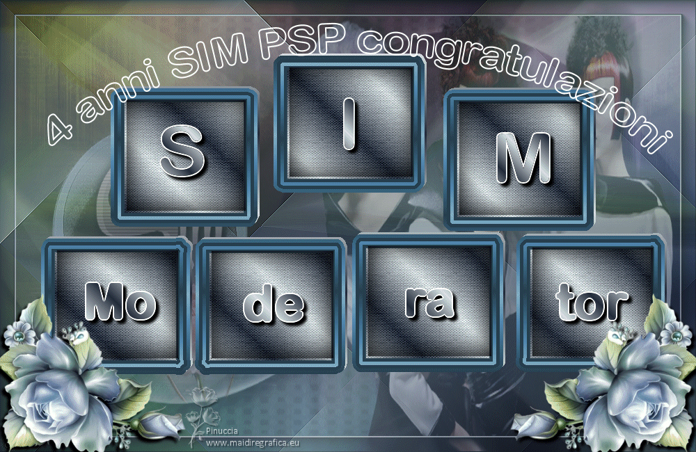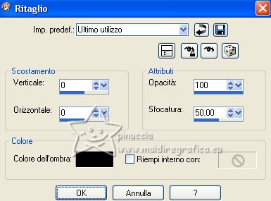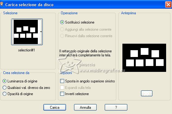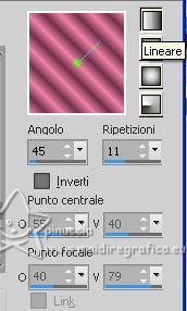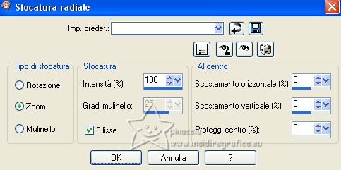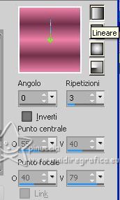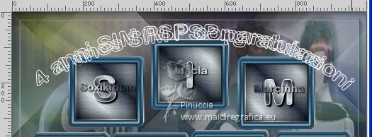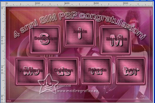 qui puoi trovare qualche risposta ai tuoi dubbi. Se l'argomento che ti interessa non è presente, ti prego di segnalarmelo. Questo tutorial è stato realizzato con PSP2019 e tradotto con PSPX7, ma può essere realizzato anche con le altre versioni di PSP. Dalla versione X4, il comando Immagine>Rifletti è stato sostituito con Immagine>Capovolgi in orizzontale, e il comando Immagine>Capovolgi con Immagine>Capovolgi in verticale. Nelle versioni X5 e X6, le funzioni sono state migliorate rendendo disponibile il menu Oggetti. Con la nuova versione X7, sono tornati Rifletti>Capovolgi, ma con nuove varianti. Vedi la scheda sull'argomento qui Grazie ai creatori dei tubes che mettono a disposizione il loro lavoro in vari gruppi di condivisione. Rispetta il lavoro degli autori, non cambiare il nome del file e non cancellare il watermark. traduzione francese qui traduzione inglese qui Le vostre versioni qui![]() Occorrente: Tubes a scelta (il tube usato dall'autore è sotto licenza). Il resto del materiale qui Per le maschere grazie Narah. Per il tube usato per la mia traduzione grazie Chris Pastel. (in questa pagina trovi i links ai siti dei creatori di tubes) Filtri: in caso di dubbi, ricorda di consultare la mia sezione filtri qui Filters Unlimited 2.0 qui Mehdi - Sorting Tiles qui AAA Frames - Foto Frame qui Animation Shop qui ![]() non esitare a cambiare modalità di miscelatura e opacità secondo i colori utilizzati. Nelle ultime versioni di PSP non c'é il gradiente di primo piano/sfondo (Corel_06_029) Puoi usare i gradienti delle versioni precedenti. Trovi qui i gradienti Corel X. ![]() Metti la selezione nella cartella Selezioni. Apri la maschera in PSP e minimizzala con il resto del materiale. 1. Scegli due colori dal tuo tube imposta il colore di primo piano con il colore chiaro, per l'esempio #ee81a8 e il colore di sfondo con il colore scuro, per l'esempio #713149. ![]() Apri una nuova immagine trasparente 1000 x 650 pixels, e riempila con il colore scuro.Livelli>Nuovo livello raster. Selezione>Seleziona tutto. Apri il tube dei fiori 1 ![]() Modifica>Copia. Torna al tuo lavoro e vai a Modifica>Incolla nella selezione. Selezione>Deseleziona. Effetti>Effetti di immagine>Motivo unico, con i settaggi standard. ![]() Regola>Sfocatura>Sfocatura radiale. ![]() 2. Effetti>Effetti di riflesso>Specchio rotante, con i settaggi standard. ![]() Livelli>Unisci>Unisci giù. Effetti>Plugins>Mehdi - Sorting Tiles. ![]() Effetti>Effetti di bordo>Aumenta. Livelli>Nuovo livello raster. Riempi il livello con il colore chiaro.Livelli>Nuovo livello maschera>Da immagine. Apri il menu sotto la finestra d'origine e vedrai la lista dei files aperti. Seleziona la maschera maske113©ILR ![]() Effetti>Effetti di bordo>Aumenta. Livelli>Unisci>Unisci gruppo. 3. Passa il colore di primo piano a Gradiente di primo piano/sfondo, stile Lineare ![]() Attiva lo strumento Bacchetta magica ![]() e clicca nei quadri per selezionarli. ![]() Selezione>Modifica>Espandi - 10 pixels. ![]() Livelli>Nuovo livello raster. Riempi la selezione con il gradiente.Selezione>Modifica>Contrai - 5 pixels. ![]() Premi sulla tastiera il tasto CANC ![]() 4. Livelli>Nuovo livello raster. Riempi con il colore scuro di sfondo.Selezione>Modifica>Contrai - 5 pixels. Riempi la selezione con il gradiente.Selezione>Modifica>Contrai - 5 pixels. Riempi la selezione con il colore scuro di sfondo.Selezione>Modifica>Contrai - 5 pixels. Passa il colore di primo piano a Colore. Riempi la selezione con il colore chiaro di primo piano.Selezione>Deseleziona. ![]() Apri deko-1 ![]() Modifica>Copia. Torna al tuo lavoro e vai a Modifica>Incolla come nuovo livello. Tasto K per attivare lo strumento Puntatore ![]() Imposta Posizione X: 82,00 e Posizione Y: 96,00. ![]() 5. Apri deko-2 ![]() Modifica>Copia. Torna al tuo lavoro e vai a Modifica>Incolla come nuovo livello. Imposta Posizione X: 73,00 e Posizione Y: 88,00. ![]() Selezione>Seleziona tutto. Selezione>Mobile. Selezione>Immobilizza. Passa nuovamente il colore di primo piano a Gradiente e cambia i settaggi: ![]() Riempi la selezione con il gradiente.Effetti>Plugins>Filters Unlimited 2.0 - Paper Texture - Canvas,Fine, con i settaggi standard. ![]() Selezione>Deseleziona. Apri deko-3 ![]() Modifica>Copia. Torna al tuo lavoro e vai a Modifica>Incolla come nuovo livello. Imposta Posizione X: 229,00 e Posizione Y: 139,00. ![]() 6. Attiva nuovamente lo strumento Bacchetta magica ![]() e clicca nelle lettere per selezionarle. ![]() Riempi la selezione con il gradiente.Selezione>Deseleziona. Effetti>Effetti 3D>Sfalsa ombra. ![]() Apri deko-4 ![]() Modifica>Copia. Torna al tuo lavoro e vai a Modifica>Incolla come nuovo livello. Tasto K per attivare lo strumento Puntatore ![]() Imposta Posizione X: 124,00 e Posizione Y: 407,00. ![]() Selezione>Seleziona tutto. Selezione>Mobile. Selezione>Immobilizza. 7. Selezione>Modifica>Espandi - 2 pixels. ![]() Imposta il colore di sfondo con il colore bianco. Riempi la selezione con il colore bianco.Riporta nuovamente il colore di sfondo al colore scuro iniziale ![]() Selezione>Modifica>Contrai - 2 pixels. Riempi la selezione con il gradiente.Selezione>Deseleziona. Effetti>Effetti 3D>Sfalsa ombra, con i settaggi precedenti. Apri deko-5 ![]() Modifica>Copia. Torna al tuo lavoro e vai a Modifica>Incolla come nuovo livello. Tasto K per attivare lo strumento Puntatore ![]() Imposta Posizione X: 93,00 e Posizione Y: 154,00. ![]() 8. Selezione>Seleziona tutto. Selezione>Mobile. Selezione>Immobilizza. Riempi la selezione con il gradiente.Selezione>Deseleziona. Effetti>Effetti 3D>Sfalsa ombra. ![]() Apri deko-6 (o un testo nella tua lingua)Modifica>Copia. Torna al tuo lavoro e vai a Modifica>Incolla come nuovo livello. Tasto K per attivare lo strumento Puntatore ![]() Imposta Posizione X: 91,00 e Posizione Y: 30,00. ![]() se usi il testo con la tua lingua, adatta i settaggi al tuo testo ![]() Effetti>Effetti 3D>Sfalsa ombra. ![]() 9. Apri deko-7 ![]() Modifica>Copia. Torna al tuo lavoro e vai
