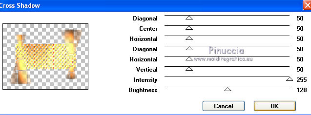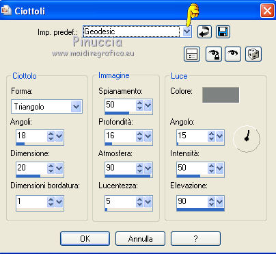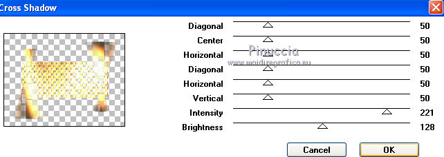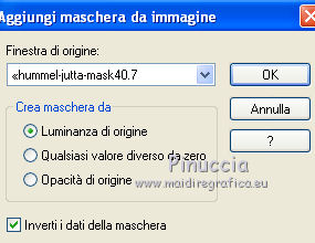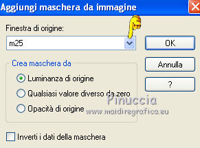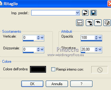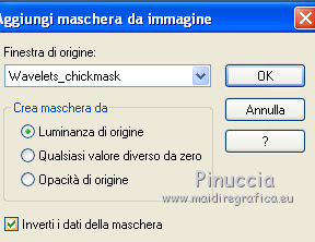 qui puoi trovare qualche risposta ai tuoi dubbi. Se l'argomento che ti interessa non è presente, ti prego di segnalarmelo. Questo tutorial è stato creato con PSP X2, ma può essere eseguito anche con le altre versioni di PSP. Per tradurlo, ho usato PSP X. Il materiale viene da vari gruppi di condivisione. Il copyright appartiene ai rispettivi autori. Grazie ai creatori dei tubes che mettono a disposizione il loro lavoro in vari gruppi di condivisione. Rispetta il lavoro degli autori, non cambiare il nome del file e non cancellare il watermark. Occorrente: Due tubes a scelta. Il resto del materiale qui I poser che ho usato sono ©Laguna Azul. Filtri: Mura's Seamless - Emboss at Alpha qui Xero - Improver qui Graphics Plus - Cross Shadow qui Animation Shop qui Metti il preset Geodesic nella cartella Impostazioni Predefinite. Apri le maschere in PSP e minimizzale con il resto del materiale. 1. Scegli due colori dai tuoi tubes. Imposta il colore di primo piano con il colore chiaro, e il colore di sfondo con il colore scuro. Passa il colore di primo piano a Gradiente. ![]() Apri una nuova immagine trasparente 800 x 600 pixels, e riempila con il gradiente.Regola>Sfocatura>Sfocatura gaussiana - raggio 20. ![]() Apri il tube di sfondo e vai a Modifica>Copia. Torna al tuo lavoro e vai a Modifica>Incolla come nuovo livello. Immagine>Ridimensiona, se e quanto necessario, in modo che riempia la tela. Regola>Messa a fuoco>Metti a fuoco. 2. Livelli>Nuovo livello raster. Riempi il livello con il colore di primo piano.Livelli>Nuovo livello maschera>Da immagine. Apri il menu sotto la finestra di origine e vedrai la lista dei files aperti. Seleziona la maschera m25, con i seguenti settaggi. ![]() Livelli>Unisci>Unisci gruppo. Effetti>Plugins>Mura's Seamless - Emboss at Alpha, con i settaggi standard. ![]() Effetti>Effetti 3D>Sfalsa ombra. ![]() Rinomina questo livello "animazione". Livelli>Nuovo livello raster. Riempi ancora con il colore di primo piano.Livelli>Nuovo livello maschera>Da immagine. Apri il menu sotto la finestra di origine, e seleziona la maschera "hummel-jutta-mask40.7". ![]() Livelli>Unisci>Unisci gruppo. Effetti>Plugins>Mura's Seamless - Emboss at Alpha, con i settaggi standard. Effetti>Effetti 3D>Sfalsa ombra, con i settaggi precedenti. 3. Apri "animaux" e vai a Modifica>Copia. Torna al tuo lavoro e vai a Modifica>Incolla come nuovo livello. Immagine>Rifletti. Immagine>Ridimensiona, al 40%, tutti i livelli non selezionato. Regola>Messa a fuoco>Metti a fuoco. Effetti>Effetti 3D>Sfalsa ombra. ![]() Sposta il tube in alto o dove preferisci.Apri il tube "fafatube1200-diversas-aviao" e vai a Modifica>Copia. Torna al tuo lavoro e vai a Modifica>Incolla come nuovo livello. Immagine>Rifletti. Immagine>Ridimensiona, al 50%, tutti i livelli non selezionato. Regola>Messa a fuoco>Metti a fuoco. Effetti>Effetti 3D>Sfalsa ombra, con i settaggi precedenti. Sposta il tube nell'angolo in alto a destra.4. Copia e incolla i due tubes principali. Immagine>Ridimensiona, se e quanto necessario. Regola>Messa a fuoco>Metti a fuoco. Effetti>Effetti 3D>Sfalsa ombra, con i settaggi precedenti. Posiziona correttamente i due tubes,vedi il mio esempio per orientarti. Livelli>Nuovo livello raster. Riempi con il gradiente.Livelli>Nuovo livello maschera>Da immagine. Apri il menu sotto la finestra di origine, e seleziona la maschera "Wavelets_chickmask". ![]() Livelli>Unisci>Unisci gruppo. Effetti>Effetti 3D>Sfalsa ombra. ![]() 5. Attiva il livello superiore. Livelli>Nuovo livello raster. Selezione>Seleziona tutto. Immagine>Ritaglia la selezione. Selezione>Seleziona tutto. Immagine>Dimensioni tela - 872 x 672 pixels. ![]() Selezione>Inverti. Riempi la selezione con il colore di sfondo.Selezione>Modifica>Contrai - 2 pixels. Riempi con il colore di primo piano.Selezione>Modifica>Contrai - 2 pixels. Riempi con il colore di sfondo.Selezione>Modifica>Contrai - 2 pixels. Riempi con il colore di primo piano.Effetti>Effetti di trama>Ciottoli; apri il menu delle impostazioni predefinite e seleziona il preset Geodesic, e clicca ok. se preferisci, puoi copiare manualmente i settaggi che vedi nella schermata ![]() Livelli>Nuovo livello raster. Effetti>Effetti 3D>Ritaglio. ![]() Selezione>Deseleziona. Scrivi il tuo testo e aggiungi il tuo nome e/o il tuo watermark, senza dimenticare eventuali copyright delle immagini usate. Immagine>Ridimensiona, a 800 pixels di larghezza, tutti i livelli selezionato. 6. Animazione. Attiva il livello "animazione". Effetti>Plugins>Graphics Plus - Cross Shadow. ![]() Modifica>Copia Unione. Apri Animation Shop e vai a Modifica>Incolla>Incolla come nuova animazione. Torna in PSP. Modifica>Annulla azione Cross Shadow. Effetti>Plugins>Graphics Plus - Cross Shadow. ![]() Modifica>Copia Unione. Torna in Animation Shop e vai a Modifica>Incolla>Incolla dopo il fotogramma corrente. Di nuovo in PSP. Modifica>Annulla azione Cross Shadow. Effetti>Plugins>Graphics Plus - Cross Shadow. ![]() Modifica>Copia Unione. In Animation Shop: Modifica>Incolla>Incolla dopo il fotogramma corrente. Modifica>Seleziona tutto. Animazione>Proprietà fotogramma, e imposta la velocità a 50. ![]() Controlla il risultato cliccando su Visualizza e salva in formato gif.![]() Se hai problemi o dubbi, o trovi un link non funzionante, o anche soltanto per un saluto, scrivimi. 6 Novembre 2011 |