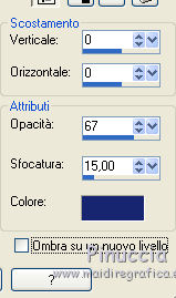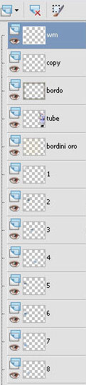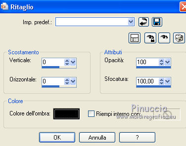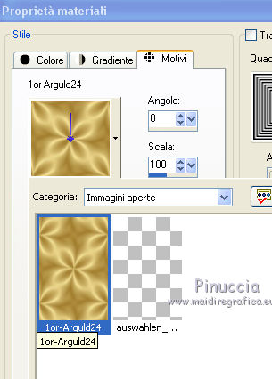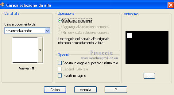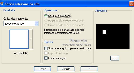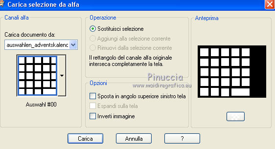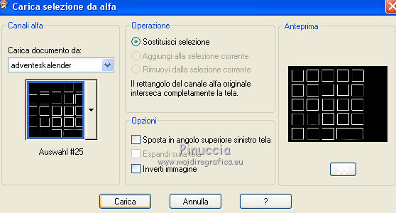 qui puoi trovare qualche risposta ai tuoi dubbi. Questo tutorial é stato realizzato con PSPX2 e tradotto con PSPX e PSPX2, ma può essere realizzato anche con le altre versioni di PSP. Dalla versione X4, il comando Immagine>Rifletti é stato sostituito con Immagine>Capovolgi in orizzontale, e il comando Immagine>Capovolgi con Immagine>Capovolgi in verticale. Nelle versioni X5 e X6, le funzioni sono state migliorate rendendo disponibile il menu Oggetti. Con la nuova versione X7, sono tornati Rifletti>Capovolgi, ma con nuove varianti. Vedi la scheda sull'argomento qui Grazie ai creatori dei tubes che mettono a disposizione il loro lavoro in vari gruppi di condivisione. Rispetta il lavoro degli autori, non cambiare il nome del file e non cancellare il watermark. traduzione francese qui traduzione inglese qui Le vostre versioni qui![]() Occorrente: Per questo tutorial ho usato lo scrapkit di Gerda Blue Christmas Scrap 2013 (19, Oktober 2013) ![]() ![]() Per il tube della seconda versione grazie Luz Cristina. ![]() Xero - Improver qui Animation Shop qui ![]() ![]() Apri il motivo oro in PSP e minimizzalo con il resto del materiale. 1. Passa il colore di primo piano a Motivi, apri il menu, e nella categoria Immagini aperte, seleziona il motivo 1or-Arguld24 con i seguenti settaggi. ![]() Scegli dal tuo tube un colore medio e impostalo come colore di sfondo. ![]() Apri Auswahl-Datei. Duplica l'immagine usando la combinazione di tasti maiuscola+D e chiudi l'originale. La copia, che sarà la base del tuo lavoro, non è vuota, ma contiene le selezioni salvate sul canale alfa. Riempi l'immagine trasparente con il colore di sfondo.Apri il tuo tube del paesaggio e vai a Modifica>Copia. Torna al tuo lavoro e vai a Modifica>Incolla come nuovo livello. Immagine>Ridimensiona, se e quanto necessario, tutti i livelli non selezionato. Posiziona l'immagine in modo che riempia tutta l'area della tela.![]() 2. Livelli>Unisci>Unisci visibile. Livelli>Duplica, e chiudi questo livello. Attiva il livello sottostante dell'originale. Selezione>Carica/Salva selezione>Carica selezione da canale alfa. Apri il menu delle selezioni e carica la selezione Auswahl#00. ![]() Livelli>Nuovo livello raster. Riempi la selezione con il tuo colore di sfondo.per riempire le selezioni con un solo clic, imposta la modalità di corrispondenza dello strumento Riempimento in Nessuno. ![]() Se vuoi alternare le righe con un colore più chiaro e/o riempire singolarmente ogni casella, imposta la modalità di corrispondenza in Valore RGB. Selezione>Deseleziona. *** 3. Apri uno dei tube che intendi utilizzare per le caselle del calendario, e vai a Modifica>Copia. Torna al tuo lavoro e vai a Modifica>Incolla come nuovo livello. Immagine>Ridimensiona, se e quanto necessario, tutti i livelli non selezionato. Posiziona correttamente il tube in una delle caselle.se hai problemi a vedere bene la casella, puoi momentaneamente ridurre l'opacità del livello di sfondo Effetti>Plugins>Xero - Improver, clicca su Landscape e ok. ![]() Effetti>Effetti 3D>Sfalsa ombra, con un colore molto scuro scelto dalla tua immagine di sfondo. ![]() **** Ripeti 23 volte da **** a **** con gli altri tubes necessari a riempire tutte le caselle. 4. Quando hai posizionato le 24 piccole immagini nelle caselle: Livelli>Unisci>Unisci visibile. Riapri e attiva il livello superiore. Rinomina questo livello "sfondo 2". 5. Selezione>Carica/Salva selezione>Carica selezione da canale alfa. La selezione Auswahl#1 è subito disponibile. Devi soltanto cliccare Carica. ![]() Selezione>Innalza selezione a livello. Selezione>Deseleziona. Attiva lo strumento Testo e scegli un font.Chiudi il colore di primo piano e imposta il colore di sfondo con il motivo oro. ![]() Scrivi il numero 1 nel piccolo rettangolo. Livelli>Converti in livello raster. Effetti>Effetti 3D>Sfalsa ombra, colore nero. ![]() Posiziona correttamente il numero.Livelli>Unisci>Unisci giù. Rinomina questo livello "1". 6. Attiva nuovamente il livello "sfondo 2". Selezione>Carica/Salva selezione>Carica selezione da canale alfa. Apri il menu delle selezioni e carica la selezione Auswahl #2 ![]() Selezione>Innalza selezione a livello. Selezione>Deseleziona. Scrivi il numero 2.Livelli>Converti in livello raster. Effetti>Effetti 3D>Sfalsa ombra, con i settaggi precedenti. ![]() Posiziona correttamente il numero.Livelli>Unisci>Unisci giù. Rinomina questo livello "2". 7. Ripeti il punto 6 ancora 22 volte, caricando la selezione successiva ![]() Non dimenticare ogni volta di riposizionarti sul livello "sfondo 2". 8. Quando hai finito, puoi eliminare il livello "sfondo 2". Dovresti avere questo. ![]() 9. Attiva il livello superiore. Livelli>Nuovo livello raster. Selezione>Carica/Salva selezione>Carica selezione da canale alfa. Apri il menu delle selezioni e carica la selezione Auswahl#25. ![]() Riempi la selezione con il motivo oro.Effetti>Effetti 3D>Smusso a incasso. ![]() Selezione>Deseleziona. 10. Attiva il livello inferiore. Livelli>Nuovo livello raster. Selezione>Carica/Salva selezione>Carica selezione da canale alfa. Apri il menu delle selezioni e carica nuovamente Auswahl#00. ![]() Effetti>Effetti 3D>Sfalsa ombra. ![]() Selezione>Deseleziona. Livelli>Unisci>Unisci giù. 11. Attiva ancora il livello superiore. Apri il tuo tube e vai a Modifica>Copia. Torna al tuo lavoro e vai a Modifica>Incolla come nuovo livello. Immagine>Ridimensiona, se e quanto necessario, tutti i livelli non selezionato. Effetti>Plugins>Xero - Improver, con i settaggi precedenti. Effetti>Effetti 3D>Sfalsa ombra, colore nero. ![]() Sposta il tube a destra, contro il bordo.12. Livelli>Nuovo livello raster. Selezione>Seleziona tutto. Riempi con il motivo oro.Selezione>Modifica>Contrai - 5 pixels. ![]() Effetti>Effetti 3D>Ritaglio. ![]() Selezione>Inverti. Effetti>Effetti 3D>Smusso a incasso. ![]() Selezione>Deseleziona. 13. Aggiungi il tuo nome e/o il tuo watemark su un nuovo livello, senza dimenticare eventuali copyright delle immagini usate. Questa dovre