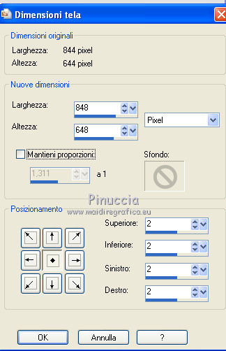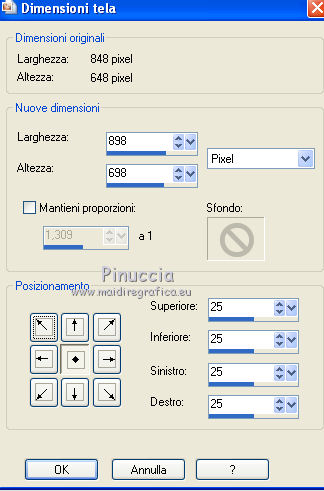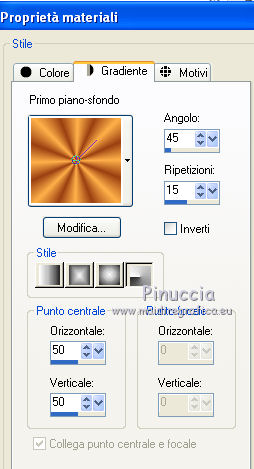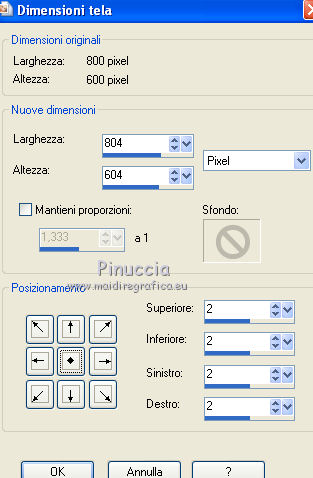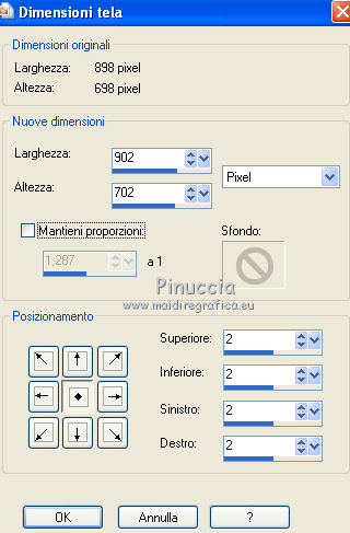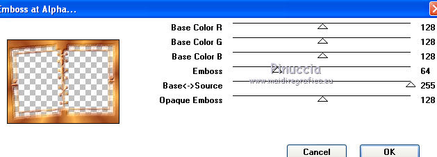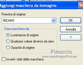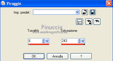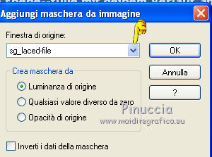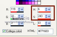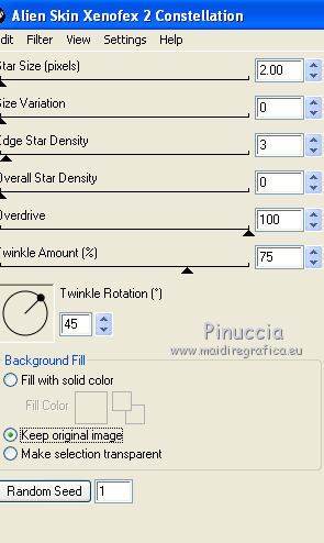 qui puoi trovare qualche risposta ai tuoi dubbi. Se l'argomento che ti interessa non è presente, ti prego di segnalarmelo. Questo tutorial è stato creato con PSP X2, ma può essere eseguito anche con le altre versioni di PSP. Per tradurlo, ho usato PSP X. Il materiale viene da vari gruppi di condivisione. Il copyright appartiene ai rispettivi autori. Grazie ai creatori dei tubes che mettono a disposizione il loro lavoro in vari gruppi di condivisione. Rispetta il lavoro degli autori, non cambiare il nome del file e non cancellare il watermark. Occorrente: Un tube a scelta. Il resto del materiale qui Il tube che ho usato è di Katrina. Filtri: Mura's Seamless - Emboss at Alpha qui Xero - Fritillary qui Alien Skin Xenofex 2.0 - Constellation qui Animation Shop qui 1. Scegli due colori dal tuo tube di sfondo. Imposta il colore di primo piano con il colore chiaro, e il colore di sfondo con il colore scuro. Passa il colore di primo piano a Gradiente. ![]() Apri una nuova immagine trasparente 800 x 600 pixels, e riempila con il gradiente.Regola>Sfocatura>Sfocatura gaussiana - raggio 15. ![]() Livelli>Nuovo livello raster. Selezione>Seleziona tutto. Apri il tube "519787_R_K_B_by_Walter Grab" e vai a Modifica>Copia. Torna al tuo lavoro e vai a Modifica>Incolla nella selezione. Selezione>Deseleziona. Apri il tube "african_scenery_283101" e vai a Modifica>Copia. Torna al tuo lavoro e vai a Modifica>Incolla come nuovo livello. Prendi nota dei valori di tonalità (H) e Saturazione (S) del tuo colore di sfondo. ![]() Regola>Tonalità e saturazione>Viraggio, e trascrivi i valori annotati nelle rispettive caselle. ![]() Sposta il tube a sinistra.![]() Cambia la modalità di miscelatura di questo livello in Luce diffusa. Livelli>Nuovo livello raster. Inverti i colori del gradiente, cliccando sulla freccia tra le due palettine. ![]() Riempi il livello con il gradiente.Livelli>Nuovo livello maschera>Da immagine. Apri il menu sotto la finestra di origine e vedrai la lista dei files aperti. Seleziona la maschera sg_laced-file, con i seguenti settaggi. ![]() Livelli>Unisci>Unisci gruppo. Effetti>Plugins>Mura's Seamless - Emboss at Alpha. ![]() Effetti>Effetti di bordo>Aumenta. Effetti>Effetti 3D>Sfalsa ombra. ![]() Apri il tube "DBKAADecor-103" e vai a Modifica>Copia. Torna al tuo lavoro e vai a Modifica>Incolla come nuovo livello. Immagine>Ridimensiona, una volta al 50% e una volta al 90%, tutti i livelli non selezionato. Regola>Messa a fuoco>Metti a fuoco. Effetti>Effetti 3D>Sfalsa ombra. ![]() Sposta il tube nell'angolo in basso a sinistra.3. Apri il tuo tube e vai a Modifica>Copia. Torna al tuo lavoro e vai a Modifica>Incolla come nuovo livello. Immagine>Ridimensiona, se e quanto necessario; in questo caso: Regola>Messa a fuoco>Metti a fuoco. Regola>Rimozione disturbo in un passaggio. Effetti>Effetti 3D>Sfalsa ombra, con i settaggi precedenti. Sposta il tube a destra, contro il bordo.Scrivi il tuo testo e aggiungi il tuo nome e/o il tuo watermark, senza dimenticare eventuali copyright delle immagini usate. Livelli>Nuovo livello raster. Riempi con il colore di sfondo.Livelli>Nuovo livello maschera>Da immagine. Apri il menu sotto la finestr di origine, e seleziona la maschera "!Beams". ![]() Livelli>Unisci>Unisci gruppo. Cambia la modalità di miscelatura di questo livello in Luce diffusa. Modifica>Copia Unione. 4. Livelli>Nuovo livello raster. Immagine>Dimensioni tela - 804 x 604. ![]() Selezione>Inverti. Riempi la selezione con il colore di primo piano.Selezione>Seleziona tutto. Immagine>Dimensioni tela - 844 x 644. ![]() Selezione>Inverti. Riempi con il gradiente.Effetti>Plugins>Xero - Fritillary. ![]() Effetti>Effetti di bordo>Aumenta. Selezione>Seleziona tutto. Immagine>Dimensioni tela - 848 x 648 pixels. ![]() Selezione>Inverti. Riempi con il colore di primo piano.Selezione>Seleziona tutto. Immagine>Dimensioni tela - 898 x 698 pixels. ![]() Selezione>Inverti. Riempi con il gradiente.5. Livelli>Nuovo livello raster. Modifica>Incolla nella selezione. Regola>Sfocatura>Sfocatura radiale. ![]() Effetti>Effetti di bordo>Aumenta. Livelli>Nuovo livello raster. Effetti>Effetti 3D>Ritaglio. ![]() Livelli>Unisci>Unisci giù - 2 volte. Livelli>Nuovo livello raster. Immagine>Dimensioni tela - 902 x 702 pixels. ![]() Selezione>Inverti. Riempi con il colore di primo piano.Selezione>Seleziona tutto. Immagine>Dimensioni tela - 942 x 742 pixels. ![]() Selezione>Inverti. Inverti nuovamente i colori del gradiente. Riempi con il gradiente.Effetti>Plugins>Xero - Fritillary, con i settaggi precedenti. Effetti>Effetti di bordo>Aumenta. 6. Selezione>Seleziona tutto. Immagine>Dimensioni tela 946 x 746 pixels. ![]() Selezione>Inverti. Riempi con il colore di primo piano.Selezione>Deseleziona. Immagine>Ridimensiona, a 800 pixels di larghezza. ![]() Livelli>Nuovo livello raster. Riempi con il colore di sfondo.Cambia la modalità di miscelatura di questo livello in Luce diffusa, e abbassa l'opacità al 35%. Attiva il livello della maschera (dovrebbe essere il quarto livello dal basso). ![]() Effetti>Plugins>Alien Skin Xenofex 2.0 - Constellation. ![]() Modifica>Copia Unione. Apri Animation Shop e vai a Modifica>Incolla>Incolla come nuova animazione. Torna in PSP. Modifica>Annulla azione Constellation. Ripeti l'Effetto Constellation, cliccando una volta su Random Seed. Modifica>Copia Unione. Torna in Animation Shop e vai a Modifica>Incolla>Incolla dopo il fotogramma corrente. Di nuovo in PSP. Modifica>Annulla azione Constellation. Ripeti l'Effetto Constellation, clicca una volta su Random Seed e ok. Modifica>Copia Unione. In Animation Shop: Modifica>Incolla>Incolla dopo il fotogramma corrente. Modifica>Seleziona tutto. Animazione>Proprietà fotogramma, e imposta la velocità a 25. ![]() Controlla il risultato cliccando su Visualizza e salva in formato gif.![]() Se hai problemi o dubbi, o trovi un link non funzionante, o anche soltanto per un saluto, scrivimi 6 Novembre 2011 |
