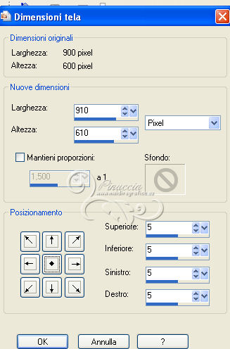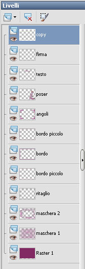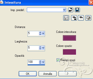 qui puoi trovare qualche risposta ai tuoi dubbi. Se l'argomento che ti interessa non è presente, ti prego di segnalarmelo. Questo tutorial è stato creato con PSP X2, ma può essere eseguito anche con le altre versioni di PSP. Per tradurlo, ho usato PSP X. Grazie ai creatori dei tubes che mettono a disposizione il loro lavoro in vari gruppi di condivisione. Rispetta il lavoro degli autori, non cambiare il nome del file e non cancellare il watermark. Occorrente: Un tube a scelta. Il resto del materiale qui Per il poser usato grazie Romana Filtri Xero - Improver qui Animation Shop qui ![]() Apri le maschere in PSP e minimizzale con il resto del materiale. 1. Scegli due colori dal tuo tube. Imposta il colore di primo piano con il colore chiaro, e il colore di sfondo con il colore scuro. I miei colori. ![]() Apri una nuova immagine trasparente 900 x 600 pixels, e riempila con il colore di sfondo.Livelli>Nuovo livello raster. Riempi con il colore chiaro di primo piano.Livelli>Nuovo livello maschera>Da immagine. Apri il menu sotto la finestra di origine e vedrai la lista dei files aperti. Seleziona la maschera "14_sharev_msk", con i seguenti settaggi: ![]() Livelli>Unisci>Unisci gruppo. Effetti>Effetti di bordo>Aumenta. Effetti>Effetti 3D>Sfalsa ombra. ![]() Livelli>Nuovo livello raster. Riempi con il colore di primo piano.Livelli>Nuovo livello maschera>Da immagine. Apri il menu sotto la finestra di origine e seleziona la maschera sdtMask286. ![]() Livelli>Unisci>Unisci gruppo. Effetti>Effetti di bordo>Aumenta. Effetti>Effetti 3D>Sfalsa ombra. ![]() 2. Selezione>Seleziona tutto. Livelli>Nuovo livello raster. Effetti>Effetti 3D>Ritaglio. ![]() Immagine>Dimensioni tela - 910 x 610 pixels. ![]() Selezione>Inverti. Livelli>Nuovo livello raster. Riempi con il colore di primo piano.Selezione>Seleziona tutto. Livelli>Nuovo livello raster. Immagine>Dimensioni tela - 950 x 650 pixels. ![]() Selezione>Inverti. Riempi con il colore di primo piano.Effetti>Effetti di trama>Intessitura entrambi i colori impostati con il tuo colore di sfondo. ![]() Effetti>Effetti 3D>Smusso a incasso. ![]() Selezione>Seleziona tutto. Immagine>Dimensioni tela - 960 x 660 pixels. ![]() Livelli>Nuovo livello raster. Selezione>Inverti. Riempi la selezione con il colore di sfondo.Selezione>Deseleziona. 3. Apri "ccd-corner19" e vai a Modifica>Copia. Torna al tuo lavoro e vai a Modifica>Incolla come nuovo livello. Immagine>Ridimensiona, al 65%, tutti i livelli non selezionato. ![]() Spostalo in alto a sinistra.Livelli>Duplica. Immagine>Rifletti. Livelli>Unisci>Unisci giù. Livelli>Duplica. Immagine>Capovolgi. Livelli>Unisci>Unisci giù. Effetti>Effetti 3D>Sfalsa ombra. ![]() Apri il tuo tube e e vai a Modifica>Copia. Torna al tuo lavoro e vai a Modifica>Incolla come nuovo livello. Immagine>Ridimensiona, se e quanto necessario, tutti i livelli non selezionato. Spostalo a destra o dove preferisci.Effetti>Plugins>Xero - Improver. ![]() Effetti>Effetti 3D>Sfalsa ombra, con i settaggi precedenti. 4. Apri il wordart Always. Se vuoi cambiare il colore al wordart, il modo più semplice è di attivare lo strumento Trasforma in destinaziona ![]() attiva il livello superiore e passa il mouse sul testo tenendo premuto il tasto sinistro del mouse per usare il tuo colore di primo piano, e il tasto destro per usare il tuo colore di sfondo. per il mio esempio, sul livello superiore del testo ho applicato: Effetti>Effetti 3D>Smusso a incasso. ![]() Modifica>Copia Unione. Torna al tuo lavoro e vai a Modifica>Incolla come nuovo livello. Sposta il testo in alto.Effetti>Effetti 3D>Sfalsa ombra. ![]() Aggiungi il tuo nome e/o il tuo watermark su un nuovo livello, senza dimenticare eventuali copyright delle immagini usate. Immagine>Ridimensiona, a 900 pixels di larghezza, tutti i livelli selezionato. Questa dovrebbe essere la tua paletta dei livelli. ![]() 5. Se stai usando altri colori, prima di passare il tuo lavoro in Animation Shop, apri in PSP l'animazione "ani-Rad©ILR", composta da 5 livelli. ![]() Prendi nota dei valori di Tonalità (H) e Saturazione (S) del colore che intendi usare. ![]() Regola>Tonalità e saturazione>Viraggio, e trascrivi i valori annotati nelle rispettive caselle. ![]() Attiva il livello "2" e vai a Modifica>Ripeti Viraggio. ![]() E così via, fino al livello "5". Salva l'immagine in formato Animation Shop (*psp). ![]() 6. Torna al tuo lavoro. Livelli>Unisci>Unisci tutto. Modifica>Copia. Apri Animation Shop e vai a Modifica>Incolla>Incolla come nuova animazione. Modifica>Duplica, 3 volte, e avrai una animazione composta da 5 fotogrammi. oppure clicca 3 volte sull'icona corrispondente nella barra superiore degli strumenti Clicca sul primo fotogramma per selezionarlo e vai a Modifica>Seleziona tutto. Apri l'animazione "ani-Rad©ILR" (o l'animazione salvata con il tuo colore). Modifica>Seleziona tutto. Modifica>Copia. Attiva il tuo lavoro e vai a Modifica>Incolla>Incolla nel fotogramma selezionato. Posiziona l'animazione al centro. Controlla il risultato cliccando su Visualizza e salva in formato jpg.![]() Se hai problemi o dubbi, o trovi un link non funzionante, o anche soltanto per un saluto, scrivimi. 6 Maggio 2013 |