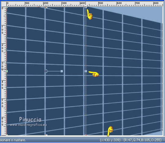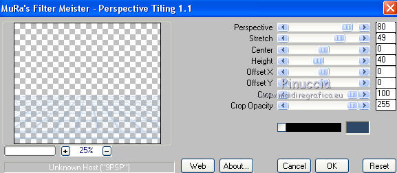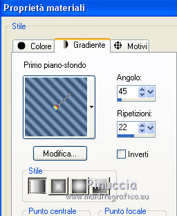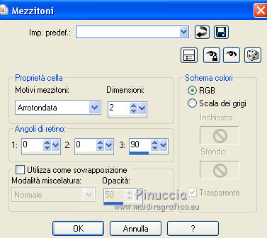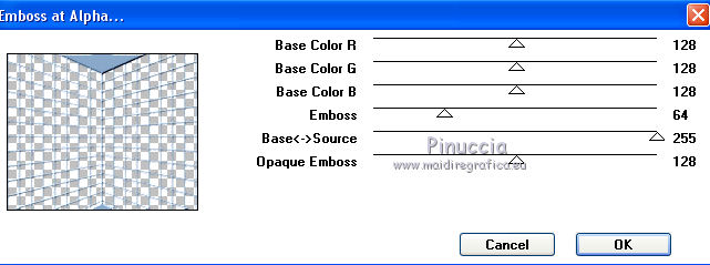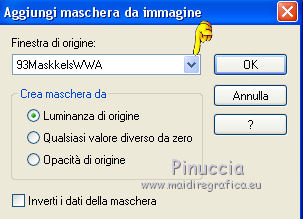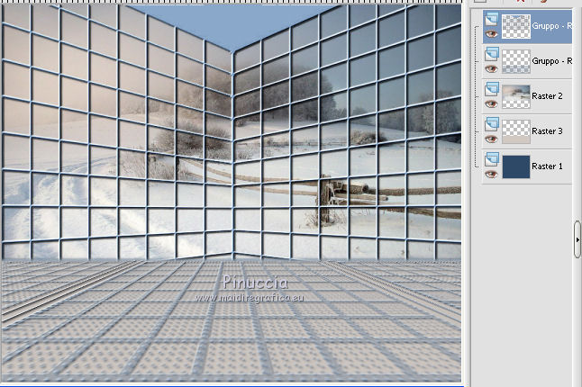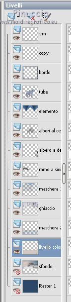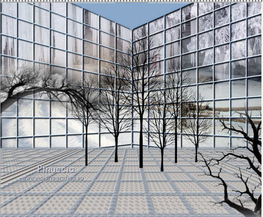 qui puoi trovare qualche risposta ai tuoi dubbi. Se l'argomento che ti interessa non è presente, ti prego di segnalarmelo. Questo tutorial è stato creato con PSP X3, ma può essere eseguito anche con le altre versioni di PSP. Per tradurlo, ho usato PSP X. Se stai usando le nuove versioni di PSP, a proposito delle funzioni Rifletti/Capovolgi, vedi la mia scheda qui Grazie ai creatori dei tubes che mettono a disposizione il loro lavoro in vari gruppi di condivisione. Rispetta il lavoro degli autori, non cambiare il nome del file e non cancellare il watermark. Occorrente: A scelta: il tube di un personaggio, due o tre paesaggi invernali. Il resto del materiale qui Per il poser usato grazie Batschi Filtri: Xero - Improver qui Mura's Meister - Cloud qui Mura's Meister - Perspective Tiling qui Mura's Seamless - Emboss at Alpha qui Animation shop qui Apri le maschere in PSP e minimizzale con il resto del materiale. 1. Scegli due colori dal tuo materiale, e imposta il colore di primo piano con il colore chiaro, e il colore di sfondo con il colore scuro. ![]() Apri una nuova immagine trasparente 850 x 700 pixels, e riempila con il colore scuro di sfondo.Livelli>Nuovo livello raster. Riempi con il colore chiaro di primo piano.Livelli>Nuovo livello maschera>Da immagine. Apri il menu sotto la finestra di origine e vedrai la lista dei files aperti. Seleziona la maschera 35 masker, con i seguenti settaggi. ![]() Livelli>Unisci>Unisci gruppo. Premi il tasto K per attivare lo strumento Puntatore ![]() se stai usando PSP 9 il tasto D per attivare lo strumento Deformazione ![]() in modalità Scala, spingi il nodo a destra verso sinistra, fino a 430 pixels. (se non visualizzi i Righelli, vai a Visualizza>Righelli) ![]() ![]() Premi il tasto M per deselezionare lo strumento. Livelli>Duplica. Immagine>Capovolgi. Sposta l'immagine a destra.![]() Livelli>Unisci>Unisci giù. 2. Effetti>Plugins>Mura's Seamless - Emboss at Alpha - 2 volte con i settaggi standard. ![]() Effetti>Effetti 3D>Sfalsa ombra. ![]() Chiudi il livello della maschera e attiva il livello inferiore. Livelli>Nuovo livello raster. Riempi con il colore di primo piano.Livelli>Nuovo livello maschera>Da immagine. Apri il menu sotto la finestra di origine e seleziona la maschera 93MaskkelsWWA, con i seguenti settaggi. ![]() Livelli>Unisci>Unisci gruppo. Effetti>Plugins>Mura's Meister - Perspective Tiling. ![]() Sposta l'immagine sul bordo.![]() Effetti>Plugins>Mura's Seamless - Emboss at Alpha - 2 volte con i settaggi standard. Effetti>Effetti 3D>Sfalsa ombra. ![]() 3. Attiva lo strumento Bacchetta magica ![]() e clicca nello spazio superiore per selezionarlo. ![]() Livelli>Nuovo livello raster. Livelli>Disponi>Sposta giù. Apri il tuo tube del paesaggio e vai a Modifica>Copia. Torna al tuo lavoro e vai a Modifica>Incolla nella selezione. se il tube non è abbastanza grande, crea un nuovo livello sotto il livello del tube, a questo livello applica il filtro Mura's Meister>Cloud, con i settaggi standard. Poi, senza deselezionare, attiva il livello del paesaggio e unisci i due livelli (Livelli>Unisci>Unisci giù) Selezione>Inverti. Livelli>Nuovo livello raster. Imposta il colore di primo piano con un colore chiaro scelto dal paesaggio, e riempi il livello con questo colore.Riapri e attiva il livello della prima maschera. Premi sulla tasto CANC. Selezione>Deseleziona. Dovresti avere questo. ![]() 4. Apri calguisglaciermist" e vai a Modifica>Copia. Torna al tuo lavoro e vai a Modifica>Incolla come nuovo livello. Posiziona il tube in alto a metà dell'immagine.![]() Porta questo livello sotto il livello della maschera. Attiva nuovamente il livello superiore. Apri "by_stirner_arvore" e vai a Modifica>Copia. Torna al tuo lavoro e vai a Modifica>Incolla come nuovo livello. Regola>Tonalità e saturazione>Viraggio. ![]() Sposta il tube contro il bordo a sinistra.![]() Apri "L&K_boom" e vai a Modifica>Copia. Torna al tuo lavoro e vai a Modifica>Incolla come nuovo livello. Spostalo contro il bordo in basso a destra.5. Apri graphsabine_design131 e vai a Modifica>Copia. Torna al tuo lavoro e vai a Modifica>Incolla come nuovo livello. Sposta gli alberi in basso al centro, come nell'esempio.![]() Apri "ILR_element-1" e vai a Modifica>Copia. Torna al tuo lavoro e vai a Modifica>Incolla come nuovo livello. Spostalo contro il bordo superiore.Apri il tuo tube e vai a Modifica>Copia. Torna al tuo lavoro e vai a Modifica>Incolla come nuovo livello. Immagine>Ridimensiona, se e quanto necessario, tutti i livelli non selezionato. Spostalo al centro, o dove preferisci.Effetti>Plugins>Xero - Improver. ![]() Effetti>Effetti 3D>Sfalsa ombra. ![]() 6. Riporta il colore di primo piano al colore iniziale, e passa il colore di primo piano a Gradiente di primo piano/sfondo, stile Lineare. ![]() Livelli>Nuovo livello raster. Riempi con il gradiente.Selezione>Seleziona tutto. Selezione>Modifica>Contrai - 15 pixels. ![]() Effetti>Effetti 3D>Ritaglio. ![]() Selezione>Inverti. Effetti>Effetti artistici>Mezzitoni. ![]() Selezione>Deseleziona. 6. Aggiungi il tuo nome e/o il tuo watermark, senza dimenticare eventuali copyright delle immagini usate. Porta il livello del paesaggio sopra il livello di sfondo, chiudi i due livelli inferiori e rimani posizionato su uno dei livelli visibili. ![]() Livelli>Unisci>Unisci visibile. Chiudi questo livello e riapri i due livelli inferiori. ![]() Livelli>Unisci>Unisci visibile. Modifica>Copia. 7. Apri Animation Shop e vai a Modifica>Incolla>Incolla come nuova animazione. Modifica>Duplica, e ripeti finchè non avrai una animazione composta da 10 fotogrammi. Clicca sul primo fotogramma per selezionarlo e vai a Modifica>Seleziona tutto. Apri l'animazione della neve (feiner_schneefall-gross), anche questa composta da 10 fotogrammi. Modifica>Seleziona tutto. Modifica>Copia. Attiva il tuo lavoro e vai a Modifica>Incolla>Incolla nel fotogramma selezionato. Posiziona l'animazione al centro 8. Torna in PSP. Riapri e attiva il livello superiore Uniti. Modifica>