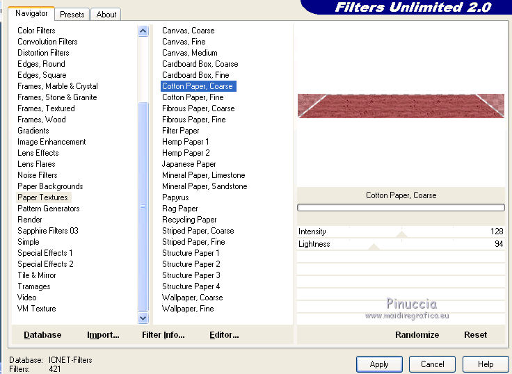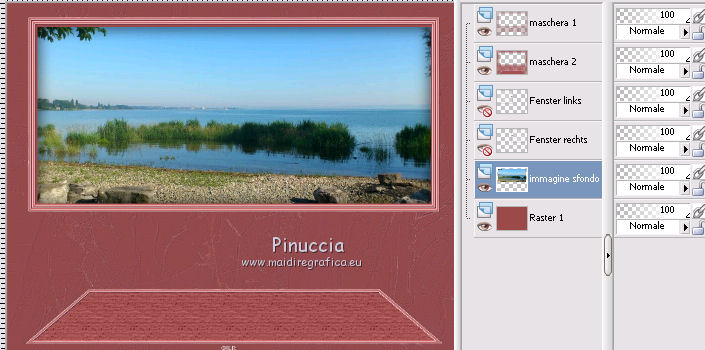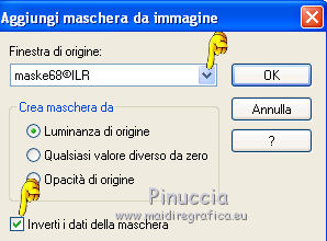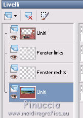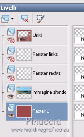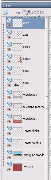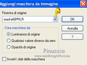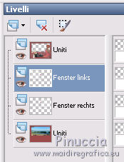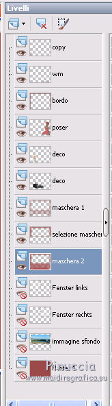 qui puoi trovare qualche risposta ai tuoi dubbi. Se l'argomento che ti interessa non è presente, ti prego di segnalarmelo. Questo tutorial è stato creato con PSP X2, ma può essere eseguito anche con le altre versioni di PSP. Per tradurlo, ho usato PSP X. Se stai usando le nuove versioni di PSP, a proposito delle funzioni Rifletti/Capovolgi, vedi la mia scheda qui Grazie ai creatori dei tubes che mettono a disposizione il loro lavoro in vari gruppi di condivisione. Rispetta il lavoro degli autori, non cambiare il nome del file e non cancellare il watermark. Occorrente: A scelta un paesaggio, un personaggio e tubes accessori. Il resto del materiale qui Per il poser usato grazie Romana. Per l'immagine di sfondo grazie Dominik Filtri: Filters Unlimited 2.0 qui Xero - Improver qui Animation Shop qui Apri la maschera in PSP e minimizzala con il resto del materiale. 1. Scegli due colori dai tuoi tubes, imposta il colore di primo piano con il colore chiaro, e il colore di sfondo con il colore scuro. I miei colori. ![]() Apri "fenster©ILR". Duplica l'immagine usando la combinazione di tasti maiuscola+D e chiudi l'originale. La copia sarà la base del tuo lavoro. I due livelli superiori di questa immagine sono chiusi. Lasciali chiusi e rimani posizionato sul livello inferiore. Riempi il livello con il colore di sfondo.Livelli>Nuovo livello raster. Riempi con il colore di primo piano.Livelli>Nuovo livello maschera>Da immagine. Apri il menu sotto la finestra di origine e vedrai la lista dei files aperti. Seleziona la maschera "maske68©ILR". ![]() Livelli>Unisci>Unisci gruppo. Effetti>Effetti di bordo>Aumenta. Effetti>Effetti 3D>Sfalsa ombra. ![]() Livelli>Disponi>Porta in alto. 2. Livelli>Nuovo livello raster. Riempi con il colore di sfondo.Livelli>Nuovo livello maschera>Da immagine. Apri il menu sotto la finestra di origine e carica nuovamente la maschera "maske66©ILR", questa volta Inverti dati della maschera selezionato ![]() Livelli>Unisci>Unisci gruppo. Effetti>Effetti di bordo>Aumenta. Effetti>Effetti 3D>Sfalsa ombra, con i settaggi precedenti. Attiva lo strumento Selezione a mano libera ![]() ![]() e seleziona la forma in basso ![]() Effetti>Plugins>Filters Unlimited 2.0 - Paper Textures - Cotton Paper,Coarse. ![]() Selezione>Deseleziona. 3. Attiva lo strumento Bacchetta magica ![]() ![]() Clicca nel rettangolo in alto per selezionarlo. ![]() Effetti>Effetti 3D>Ritaglio. ![]() Livelli>Disponi>Sposta giù. Apri il tuo tube o immagine di sfondo e vai a Modifica>Copia. Torna al tuo lavoro e vai a Modifica>Incolla come nuovo livello. Immagine>Ridimensiona, se e quanto necessario, tutti i livelli non selezionato. Posiziona l'immagine nell'area selezionata.![]() Selezione>Inverti. Premi sulla tastiera il tasto CANC ![]() Selezione>Deseleziona. Nella paletta dei livelli porta questo livello sopra il livello di sfondo. ![]() 4. Attiva il livello della seconda maschera, attiva nuovamente lo strumento Selezione , rettangolo,e traccia una selezione come nell'esempio. ![]() Selezione>Innalza selezione a livello. Selezione>Deseleziona. Riapri i due livelli chiusi (Fenster links e Fenster rechts), e attiva il livello superiore. Copia e incolla sul tuo lavoro i tuoi tubes accessori. Immagine>Ridimensiona, se e quanto necessario, tutti i livelli non selezionato. Posiziona i tubes a tuo piacimento.Effetti>Plugins>Xero - Improver. ![]() Effetti>Effetti 3D>Sfalsa ombra. ![]() 5. Apri il tuo tube del personaggio e vai a Modifica>Copia. Torna al tuo lavoro e vai a Modifica>Incolla come nuovo livello. Immagine>Ridimensiona, se e quanto necessario, tutti i livelli non selezionato. Posiziona il tube come preferisci, o vedi il mio esempio.Effetti>Plugins>Xero - Improver, con i settaggi precedenti. Effetti>Effetti 3D>Sfalsa ombra, con i settaggi precedenti. Livelli>Nuovo livello raster. Selezione>Seleziona tutto. Riempi con il colore di sfondo.Selezione>Modifica>Contrai - 5 pixels. ![]() Riempi con il colore di primo piano.Selezione>Modifica>Contrai - 3 pixels. ![]() Riempi con il colore di sfondo.Selezione>Modifica>Contrai - 5 pixels. Effetti>Effetti 3D>Ritaglio, con i settaggi precedenti. Selezione>Deseleziona. Aggiungi il tuo nome e/o il tuo watermark su un nuovo livello, senza dimenticare i copyright delle immagini usate. Questa dovrebbe essere la tua paletta dei livelli. ![]() 6. Chiudi i quattro livelli inferiori e attiva uno dei livelli visibili. ![]() Livelli>Unisci>Unisci visibile. Chiudi questo livello. Riapri i due livelli inferiori, e posizionati su uno di questi livelli. ![]() Livelli>Unisci>Unisci visibile. Apri i due livelli chiusi e avrai 4 livelli visibili. ![]() Modifica>Copia Unione. Apri Animation Shop e vai a Modifica>Incolla>Incolla come nuova animazione. 7. Torna in PSP. Attiva il livello "fenster links" (finestra sinistra). ![]() Effetti>Effetti di immagine>Scostamento. ![]() Attiva il livello "fenster rechts" (finestra destra). Effetti>Effetti di imagine>Scostamento. ![]() Modifica>Copia Unione. Torna in Animation Shop e vai a Modifica>Incolla>Incolla dopo il fotogramma corrente. Di nuovo in PSP. Sei ancora sul livello "fenster rechts". Ripeti l'Effetto Scostamento con gli stessi settaggi. ![]() Attiva il livello "fenster links". Ripeti l'Effetto Scostamento a -70. ![]() 8. Ancora in PSP. Rimani sul livello "fenster links", e ripeti l'Effetto Scostamento con gli stessi settaggi. Attiva il livello "fenster rechts", e ripeti l'Effetto Scostamento a 70. Modifica>Copia Unione. In Animation Shop: Modifica>Incolla>Incolla dopo il fotogramma corrente. Ripeti il passaggio ancora 2 volte. Avrai in Animation Shop una animazione composta da 6 fotogrammi. Tenendo premuto il tasto della maiuscola, clicca sui fotogrammi da 2 a 5. (soltanto questi fotogrammi avranno la cornice blu). ![]() Modifica>Copia. Clicca sull'ultimo fotogramma per selezionarlo (soltanto questo fotogramma deve essere selezionato e avere la cornice blu). ![]() Modifica>Incolla>Incolla dopo il fotogramma corrente. Animazione>Invert