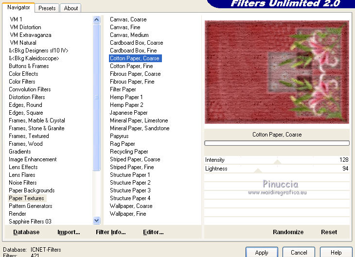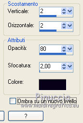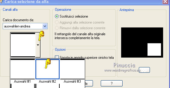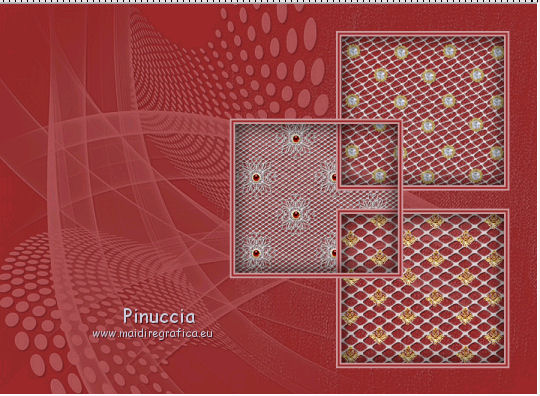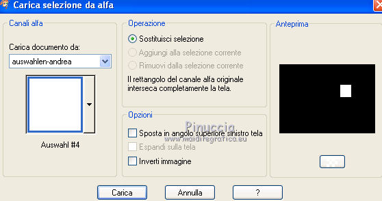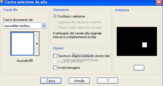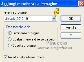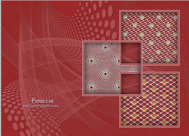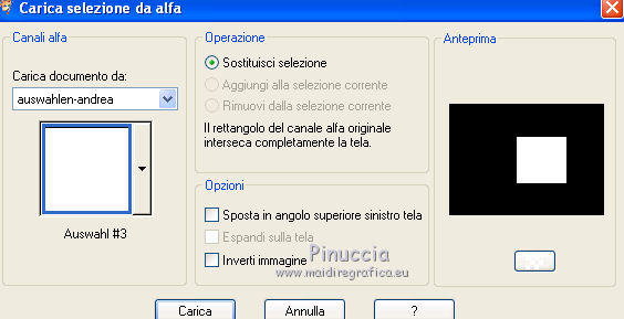 qui puoi trovare qualche risposta ai tuoi dubbi. Se l'argomento che ti interessa non è presente, ti prego di segnalarmelo. Questo tutorial è stato creato con PSP X2, ma può essere eseguito anche con le altre versioni di PSP. Per tradurlo, ho usato PSP X. Se stai usando le nuove versioni di PSP, a proposito delle funzioni Rifletti/Capovolgi, vedi la mia scheda qui Grazie ai creatori dei tubes che mettono a disposizione il loro lavoro in vari gruppi di condivisione. Rispetta il lavoro degli autori, non cambiare il nome del file e non cancellare il watermark. Occorrente: A scelta un personaggio e un tube accessorio. Il resto del materiale qui Per il poser usato grazie Andrea Filtri: Filters Unlimited 2.0 qui Xero - Improver qui Apri la maschera in PSP e minimizzala con il resto del materiale. 1. Scegli due colori dai tuoi tubes, imposta il colore di primo piano con il colore chiaro, e il colore di sfondo con il colore scuro. I miei colori. ![]() Apri "auswahlen-andrea". Questa immagine, che non è vuota, ma contiene le selezioni salvate sul canale alfa, sarà la base del tuo lavoro. Riempi l'immagine trasparente con il colore di sfondo.Livelli>Nuovo livello raster. Riempi con il colore di primo piano.Livelli>Nuovo livello maschera>Da immagine. Apri il menu sotto la finestra di origine e vedrai la lista dei files aperti. Seleziona la maschera "Jillmask_2012", con i seguenti settaggi. ![]() Livelli>Unisci>Unisci gruppo. Effetti>Effetti di bordo>Aumenta. Effetti>Effetti 3D>Sfalsa ombra. ![]() Abbassa l'opacità di questo livello al 35%. 2. Selezione>Carica/Salva selezione>Carica selezione da canale alfa. La selezione Auswahl#1 è subito disponibile. Devi soltanto cliccare Carica. ![]() Livelli>Nuovo livello raster. Riempi la selezione con il colore di primo piano.Selezione>Modifica>Contrai - 3 pixels. ![]() Riempi con il colore di sfondo.Selezione>Modifica>Contrai - 3 pixels. Riempi la selezione con il colore di primo piano.Selezione>Modifica>Contrai - 3 pixels. Effetti>Effetti 3D>Ritaglio. ![]() Selezione>Deseleziona. 3. Selezione>Carica/Salva selezione>Carica selezione da canale alfa. Apri il menu delle selezioni e carica Auswahl#2. ![]() Livelli>Nuovo livello raster. Riempi la selezione con il colore di primo piano.Selezione>Modifica>Contrai - 3 pixels. Riempi con il colore di sfondo.Selezione>Modifica>Contrai - 3 pixels. Riempi la selezione con il colore di primo piano.Selezione>Modifica>Contrai - 3 pixels. Effetti>Effetti 3D>Ritaglio, con i settaggi precedenti. Selezione>Deseleziona. 4. Selezione>Carica/Salva selezione>Carica selezione da canale alfa. Apri il menu delle selezioni e carica Auswahl#3. ![]() Livelli>Nuovo livello raster. Riempi la selezione con il colore di primo piano.Selezione>Modifica>Contrai - 3 pixels. Riempi con il colore di sfondo.Selezione>Modifica>Contrai - 3 pixels. Riempi la selezione con il colore di primo piano.Selezione>Modifica>Contrai - 3 pixels. Effetti>Effetti 3D>Ritaglio, con i settaggi precedenti. Selezione>Deseleziona. 5. Attiva il livello della maschera. Apri "overlay-1" e vai a Modifica>Copia. Torna al tuo lavoro e vai a Modifica>Incolla come nuovo livello. Spostalo sotto il quadrato in alto a destra.Apri "overlay-2" e vai a Modifica>Copia. Torna al tuo lavoro e vai a Modifica>Incolla come nuovo livello. Spostalo sotto il quadrato in basso a destra.Apri "overlay-3" e vai a Modifica>Copia. Torna al tuo lavoro e vai a Modifica>Incolla come nuovo livello. Spostalo sotto il quadrato al centro.![]() 6. Selezione>Carica/Salva selezione>Carica Selezione da canale alfa. Apri il menu delle selezioni e carica Auswahl#4. ![]() Attiva il livello di overlays 3 e premi sulla tastiera il tasto CANC ![]() Selezione>Deseleziona. Selezione>Carica/Salva selezione>Carica Selezione da canale alfa. Apri il menu delle selezioni e carica Auswahl#5. ![]() Attiva i livelli "overlays" e premi sulla tastiera il tasto CANC ![]() Selezione>Deseleziona. Dovresti avere questo. ![]() Apri "overlay-4" e vai a Modifica>Copia. Torna al tuo lavoro e vai a Modifica>Incolla come nuovo livello. Spostalo sotto il piccolo quadrato in alto.Livelli>Duplica. Spostalo sotto il piccolo quadrato in basso.![]() Livelli>Unisci>Unisci visibile. 7. Apri il tuo tube accessorio e vai a Modifica>Copia. Torna al tuo lavoro e vai a Modifica>Incolla come nuovo livello. Immagine>Ridimensiona, se e quanto necessario, tutti i livelli non selezionato. Spostalo nell'angolo in basso a destra.Effetti>Plugins>Xero - Improver. ![]() Effetti>Effetti 3D>Sfalsa ombra. ![]() Livelli>Duplica. Immagine>Capovolgi. 8. Livelli>Nuovo livello raster. Riempi con il colore di primo piano.Selezione>Seleziona tutto. Selezione>Modifica>Contrai - 3 pixels. ![]() Riempi con il colore di sfondo.Selezione>Modifica>Contrai - 5 pixels. ![]() Riempi la selezione con il colore di primo piano.Selezione>Modifica>Contrai - 3 pixels. Effetti>Effetti 3D>Ritaglio, con i settaggi precedenti. Selezione>Deseleziona. Livelli>Duplica e chiudi questo livello. Controlla che i fiori siano correttamente posizionati. Attiva uno dei livelli visibili e vai a Livelli>Unisci>Unisci visibile. 9. Livelli>Duplica. Immagine>Ridimensiona, al 90%, tutti i livelli non selezionato. Attiva il livello inferiore. Regola>Sfocatura>Sfocatura gaussiana - raggio 5. ![]() Effetti>Plugins>Filters Unlimited 2.0 - Paper Textures - Cotton Paper Coarse. ![]() Riapri e attiva il livello superiore del bordo. Apri il tuo tube e vai a Modifica>Copia. Torna al tuo lavoro e vai a Modifica>Incolla come nuovo livello. Immagine>Ridimensiona, se e quanto necessario, tutti i livelli non selezionato. Spostalo a sinistra.Effetti>Effetti 3D>Sfalsa ombra, con i settaggi precedenti. Aggiungi il tuo nome e/o il tuo watermark su un nuovo livello, senza dimenticare eventuali copyright delle immagini usate. Livelli>Unisci>Unisci tutto e salva in formato jpg. ![]() Se hai problemi o dubbi, o trovi un link non funzionante, o anche soltanto per un saluto, scrivimi. 16 Luglio 2013 |