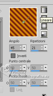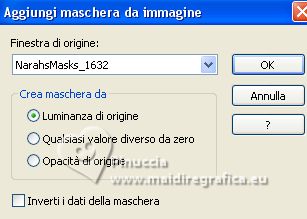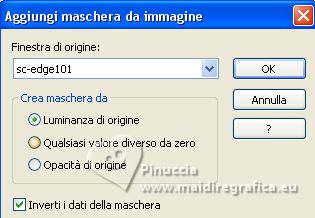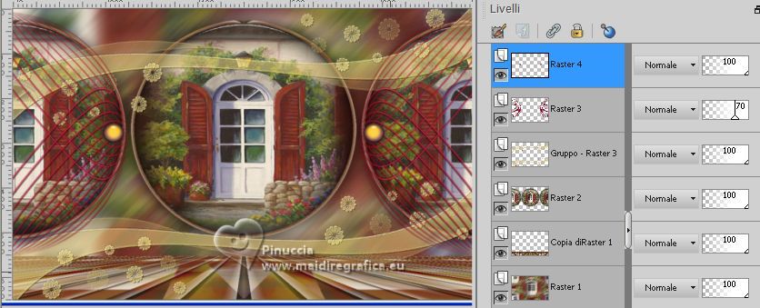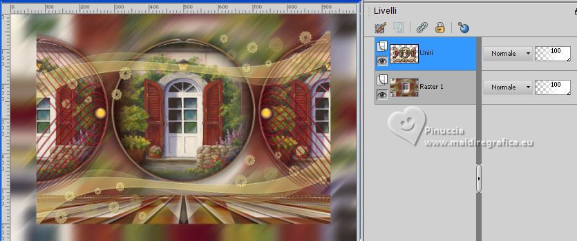 qui puoi trovare qualche risposta ai tuoi dubbi. Se l'argomento che ti interessa non è presente, ti prego di segnalarmelo. Questo tutorial è stato realizzato con PSP2019 e tradotto con PSPX7, ma può essere realizzato anche con le altre versioni di PSP. Dalla versione X4, il comando Immagine>Rifletti è stato sostituito con Immagine>Capovolgi in orizzontale, e il comando Immagine>Capovolgi con Immagine>Capovolgi in verticale. Nelle versioni X5 e X6, le funzioni sono state migliorate rendendo disponibile il menu Oggetti. Con la nuova versione X7, sono tornati Rifletti>Capovolgi, ma con nuove varianti. Vedi la scheda sull'argomento qui Grazie ai creatori dei tubes che mettono a disposizione il loro lavoro in vari gruppi di condivisione. Rispetta il lavoro degli autori, non cambiare il nome del file e non cancellare il watermark. traduzione francese qui traduzione inglese qui Le vostre versioni qui![]() Occorrente: Un tube a scelta (i tubes usati da Inge-Lore sono sotto licenza) Il resto del materiale qui Grazie per il misted Mina e per la maschera grazie Narah. Per i tubes utilizzati per la mia traduzione grazie Mina e Anna.br (in questa pagina trovi i links ai siti dei creatori di tubes) Filtri: in caso di dubbi, ricorda di consultare la mia sezione filtri qui Filters Unlimited 2.0 qui Mehdi - Sorting Tiles qui Simple - Blintz, Top Left Mirror qui Mura's Seamless - Emboss at Alpha qui Mura's Meister - Perspective Tiling qui FM Tile Tools Saturation Emboss qui Graphics Plus - Panel Stripes qui Flaming Pear - Flexixy 2 qui Alien Skin Eye Candy 5 Impact - Glass qui AAA Frames - Foto Frame qui I filtri Mura's Seamless si possono usare da soli o importati in Filters Unlimited (come fare vedi qui) Se un filtro fornito appare con questa icona ![]() non esitare a cambiare modalità di miscelatura e opacità secondo i colori utilizzati. Nelle ultime versioni di PSP non c'é il gradiente di primo piano/sfondo (Corel_06_029) Puoi usare i gradienti delle versioni precedenti. Trovi qui i gradienti Corel X. ![]() Apri le maschere in PSP e minimizzale con il resto del materiale. 1. Scegli tre colori dai tuoi tubes ![]() Imposta il colore di primo piano con il colore 3 #ffdf8c, e il colore di sfondo con il colore 2 #5c0c19 ![]() Apri una nuova immagine trasparente 1000 x 650 pixels. Riempi l'immagine trasparente con il colore di sfondo #5c0c19 (colore 2).Selezione>Seleziona tutto. Apri il tuo tube di sfondo Mina@4222.Mist paesaggio.09.16 ![]() Cancella il watermark e vai a Modifica>Copia. Torna al tuo lavoro e vai a Modifica>Incolla nella selezione. Selezione>Deseleziona. Effetti>Effetti di immagine>Motivo unico, con i settaggi standard. ![]() Regola>Sfocatura>Sfocatura da movimento. ![]() Modifica>Ripeti Sfocatura da movimento. Livelli>Duplica. 2. Effetti>Plugins>Mehdi - Sorting Tiles. ![]() Effetti>Plugins>Simple – Blintz Modifica>Ripeti Blintz. Effetti>Plugins>Simple - Top Left Mirror ![]() Effetti>Effetti di immagine>Motivo unico, fianco a fianco ![]() Effetti>Plugins>FM Tile Tools - Saturation Emboss, con i settaggi standard. ![]() 3. Effetti>Plugins>Graphics Plus - Panel Stripes, con i settaggi standard. ![]() Effetti>Plugins>Mura's Meister - Perspective Tiling. ![]() Effetti>Effetti di riflesso>Specchio rotante. ![]() Livelli>Duplica. Effetti>Plugins>Flaming Pear – Flexify 2 ![]() Immagine>Ridimensiona, al 75%, tutti i livelli non selezionato. 4. Effetti>Plugins>Mura's Meister - Copies. ![]() Tasto K per attivare lo strumento Puntatore ![]() mantieni Posizione X: 0,00 e imposta Posizione Y: 25,00. ![]() Attiva lo strumento Bacchetta magica ![]() e clicca nel cerchio centrale per selezionarlo. Livelli>Nuovo livello raster. Livelli>Disponi>Sposta giù. Modifica>Incolla nella seleziona (il tube del paesaggio è ancora in memoria). Regola>Messa a fuoco>Metti a fuoco. Livelli>Nuovo livello raster. 5. Effetti>Effetti 3D>Ritaglio. ![]() Effetti>Plugins>Alien Skin Eye Candy 5 Impact - Glass. Seleziona il preset Clear e ok. ![]() Selezione>Deseleziona. Livelli>Unisci>Unisci giù. Effetti>Plugins>Mura's Meister - Copies, con i settaggi precedenti. ![]() Attiva il livello superiore. Livelli>Unisci>Unisci giù. Effetti>Effetti 3D>Sfalsa ombra. ![]() 6. Livelli>Nuovo livello raster. Riempi il livello con il colore di primo piano #ffdf8c (colore 3).Livelli>Nuovo livello maschera>Da immagine. Apri il menu sotto la finestra di origine e vedrai la lista dei files aperti. Seleziona la maschera NarahsMasks_1632 ![]() Effetti>Effetti di bordo>Aumenta di più. Livelli>Unisci>Unisci gruppo. Tasto K per attivare lo strumento Puntatore ![]() mantieni Posizione X: 0,00 e imposta Posizione Y: 310,00. ![]() Livelli>Duplica. Immagine>Rifletti. Immagine>Capovolgi. Livelli>Unisci>Unisci giù. 7. Effetti>Plugins>Mura's Seamless - Emboss at Alpha, con i settaggi standard. ![]() Effetti>Effetti 3D>Sfalsa ombra. ![]() Apri Deco-1 ![]() Modifica>Copia. Torna al tuo lavoro e vai a Modifica>Incolla come nuovo livello. Tasto K per attivare lo strumento Puntatore ![]() imposta Posizione X: 750,00 e Posizione Y: 5,00. ![]() Se necessario, Colorizza con lo strumento Trasforma in destinazione ,Livelli>Duplica. Immmagine>Rifletti. Livelli>Unisci>Unisci giù. Abbassa l'opacità di questo livello al 70%. 8. Apri deco_1_mj ![]() Modifica>Copia. Torna al tuo lavoro e vai a Modifica>Incolla come nuovo livello. Tasto K per attivare lo strumento Puntatore ![]() imposta Posizione X: 188,00 e Posizione Y: 249,00. ![]() Se necessario, Colorizza con lo strumento Trasforma in destinazione ,Livelli>Duplica. Immagine>Rifletti. Livelli>Unisci>Unisci giù. ![]() Chiudi il livello Raster 1. Livelli>Unisci>Unisci visibile. Immagine>Ridimensiona, all'85%, tutti i livelli non selezionato. Riapri il livello Raster 1 e rimani posizionato sul livello superiore. ![]() 9. Livelli>Nuovo livello raster. Riempi il livello con il colore di primo piano #ffdf8c (colore 3).Livelli>Nuovo livello maschera>Da immagine. Apri il menu sotto la finestra di origine e selez