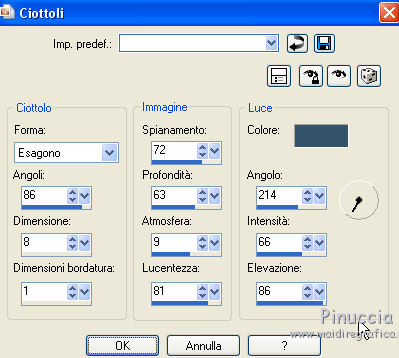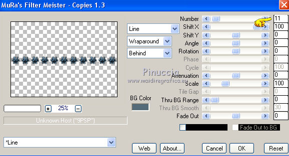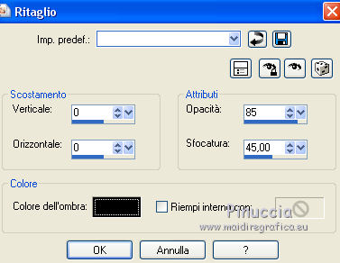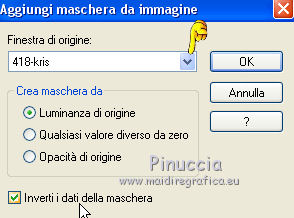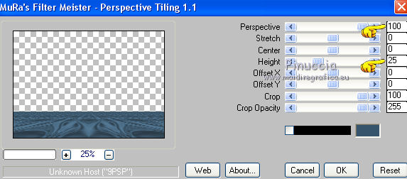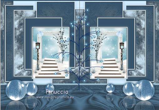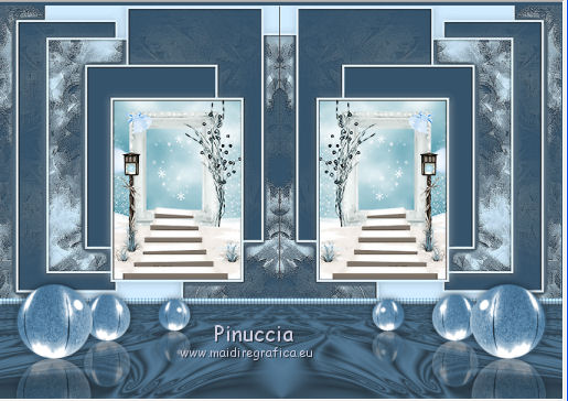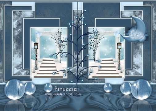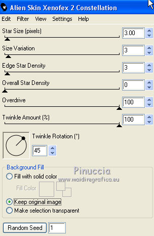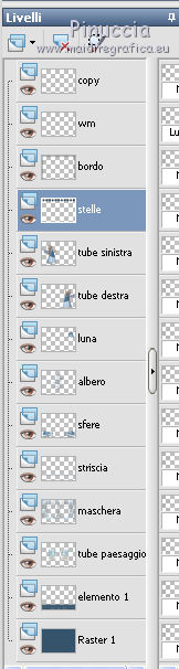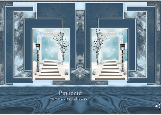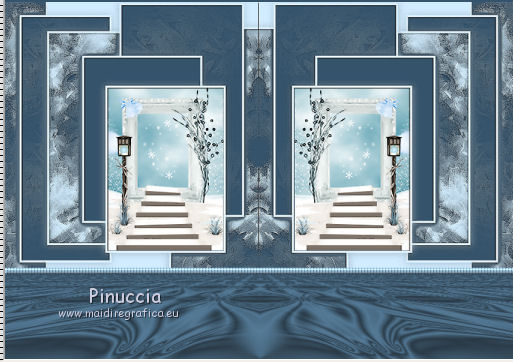 qui puoi trovare qualche risposta ai tuoi dubbi. Se l'argomento che ti interessa non è presente, ti prego di segnalarmelo. Questo tutorial è stato creato con PSP X5, ma può essere eseguito anche con le altre versioni di PSP. Per tradurlo, ho usato PSP X. Se stai usando le nuove versioni di PSP, a proposito delle funzioni Rifletti/Capovolgi, vedi la mia scheda qui Grazie ai creatori dei tubes che mettono a disposizione il loro lavoro in vari gruppi di condivisione. Rispetta il lavoro degli autori, non cambiare il nome del file e non cancellare il watermark. Occorrente: Tubes a scelta. Il resto del materiale qui Per i poser usati grazie Gerda Filtri: Xero - Improver qui Mura's Meister - Copies qui Mura's Meister - Perspective Tiling qui Alien Skin Xenofex 2.0 - Constellation qui Animation Shop qui Apri la maschera in PSP e minimizzala con il resto del materiale. 1. Scegli due colori dai tuoi tubes. Imposta il colore di primo piano con il colore chiaro, e il colore di sfondo con il colore scuro. Apri una nuova immagine trasparente 850 x 600 pixels e riempila con il colore di sfondo.Apri "element-1" e vai a Modifica>Copia. Torna al tuo lavoro e vai a Modifica>Incolla come nuovo livello. Effetti>Plugins>Mura's Meister - Perspective Tiling. ![]() Minimizza momentaneamente questo lavoro. Apri una nuova immagine trasparente 427 x 450 pixels, e riempila con il colore di primo piano.Livelli>Nuovo livello maschera>Da immagine. Apri il menu sotto la finestra di origine e vedrai la lista dei files aperti. Seleziona la maschera "418-kris", con i seguenti settaggi. ![]() Livelli>Unisci>Unisci gruppo. Effetti>Effetti di bordo>Aumenta. Effetti>Effetti 3D>Sfalsa ombra, con un colore più scuro dei tuoi colori. ![]() 2. Modifica>Copia. Attiva il tuo lavoro originale e vai a Modifica>Incolla come nuovo livello. Sposta la maschera in alto a sinistra.Livelli>Duplica. Immagine>Rifletti. Posiziona correttamente il duplicato a destra.![]() Livelli>Unisci>Unisci giù. Attiva lo strumento Selezione , rettangolo,e traccia una selezione nel riquadro a sinistra. ![]() Apri il tuo paesaggio e vai a Modifica>Copia. Torna al tuo lavoro e vai a Modifica>Incolla come nuovo livello. Immagine>Ridimensiona, se e quanto necessario, tutti i livelli non selezionato. Posiziona il tube nell'area selezionata.Selezione>Inverti. Premi sulla tastiera il tasto CANC ![]() Selezione>Deseleziona. Porta questo livello sotto il livello della maschera. Livelli>Duplica. Immagine>Rifletti. Posiziona correttamente il duplicato nel riquadro destro della maschera.![]() Livelli>Unisci>Unisci giù. Effetti>Plugins>Xero - Improver ![]() Se hai ridotto molto il tube del paesaggio Regola>Messa a fuoco>Accentua messa a fuoco. Altrimenti, è sufficiente Regola>Messa a fuoco>Metti a fuoco. 3. Attiva il livello superiore. Apri "streifen" e vai a Modifica>Copia. Torna al tuo lavoro e vai a Modifica>Incolla come nuovo livello. Spostalo tra la maschera e l'elemento 1.![]() Apri "kTs-08-049copie" e vai a Modifica>Copia. Torna al tuo lavoro e vai a Modifica>Incolla come nuovo livello. Spostalo nell'angolo in basso a sinistra, sul bordo inferiore.Regola>Tonalità e saturazione>Viraggio, e trascrivi i valori di Tonalità (H) e Saturazione (S) del tuo colore scuro. ![]() ![]() Livelli>Duplica. Immagine>Rifletti. Livelli>Unisci>Unisci giù. ![]() Effetti>Effetti 3D>Sfalsa ombra. ![]() 4. Apri "bleu-tree" e vai a Modifica>Copia. Torna al tuo lavoro e vai a Modifica>Incolla come nuovo livello. Spostalo al centro delle maschere.![]() Effetti>Effetti 3D>Sfalsa ombra. ![]() Apri "element1a" e vai a Modifica>Copia. Torna al tuo lavoro e vai a Modifica>Incolla come nuovo livello. Regola>Tonalità e Saturazione>Viraggio, con i settaggi precedenti. Immagine>Ridimensiona, al 70%, tutti i livelli non selezionato. Spostalo in alto a destra.![]() Apri i tuoi tubes e vai a Modifica>Copia. Torna al tuo lavoro e vai a Modifica>Incolla come nuovo livello. Immagine>Ridimensiona, se e quanto necessario, tutti i livelli non selezionato. Effetti>Plugins>Xero - Improver, con i settaggi precedenti. Effetti>Effetti 3D>Sfalsa ombra. ![]() Sposta un tube a destra e uno a sinistra.5. Apri "leny-dingen53" e vai a Modifica>Copia. Torna al tuo lavoro e vai a Modifica>Incolla come nuovo livello. Colorizza il tube. Immagine>Ridimensiona, 3 volte al 50%, tutti i livelli non selezionato. Effetti>Plugins>Xero - Improver, con i settaggi precedenti. Effetti>Effetti 3D>Sfalsa ombra, con i settaggi precedenti. Effetti>Plugins>Mura's Meister - Copies. ![]() Sposta il tube contro il bordo superiore.Rinomina questo livello "stelle". Livelli>Nuovo livello raster. Riempi con il colore di primo piano.Selezione>Seleziona tutto. Selezione>Modifica>Contrai - 5 pixels. ![]() Effetti>Effetti 3D>Ritaglio. ![]() Selezione>Inverti. Effetti>Effetti di trama>Ciottoli. ![]() Selezione>Deseleziona. Aggiungi il tuo nome e/o il tuo watermark su un nuovo livello, senza dimenticare eventuali copyright delle immagini usate. 6. Attiva il livello "stelle". ![]() Livelli>Duplica, 2 volte e rinomina i livelli "stelle 2" e "stelle 3". Rimani posizionato sul livello "3". Effetti>Plugins>Alien Skin Xenofex 2.0 - Constellation. ![]() Chiudi questo livello e attiva il livello "stelle 2". Effetti>Plugins>Alien Skin xenofex 2.0 - Constellation, clicca su Random Seed e ok. Chiudi questo livello e attiva il livello "stelle". Effetti>Plugins>Alien Skin Xenofex 2.0 - Constellation, clicca su Random Seed e ok. Lascia il livello visibile. Modifica>Copia Unione. Apri Animation Shop e vai a Modifica>Incolla>Incolla come nuova animazione. Torna in PSP. Chiudi il livello "1" e apri il livello "2". Modifica>Copia Unione. In Animation Shop Modifica>Incolla>Incolla dopo il fotogramma corrente. In PSP. Chiudi il livello "2" e apri il livello "3". Modifica>Copia Unione. In Animation Shop Modifica>Incolla>Incolla dopo il fotogramma corrente. Controlla il risultato cliccando su Visualizza e salva in formato gif.![]() Se hai problemi o dubbi, o trov
