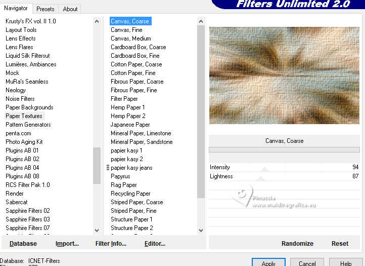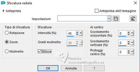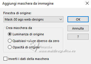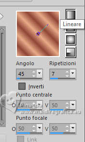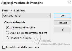 qui puoi trovare qualche risposta ai tuoi dubbi. Se l'argomento che ti interessa non è presente, ti prego di segnalarmelo. Questo tutorial è stato realizzato con PSP2019 e tradotto con PSPX9, PSP 2019 e PSP2020, ma può essere realizzato anche con le altre versioni di PSP. Dalla versione X4, il comando Immagine>Rifletti è stato sostituito con Immagine>Capovolgi in orizzontale, e il comando Immagine>Capovolgi con Immagine>Capovolgi in verticale. Nelle versioni X5 e X6, le funzioni sono state migliorate rendendo disponibile il menu Oggetti. Con la nuova versione X7, sono tornati Rifletti>Capovolgi, ma con nuove varianti. Vedi la scheda sull'argomento qui Grazie ai creatori dei tubes che mettono a disposizione il loro lavoro in vari gruppi di condivisione. Rispetta il lavoro degli autori, non cambiare il nome del file e non cancellare il watermark. traduzione francese qui traduzione inglese qui Le vostre versioni qui![]() Occorrente: Materiale Tube a scelta (il tube usato da Inge-Lore è sotto licenza). Il resto del materiale ![]() Per il mio esempio ho usato un tube dello scrap di aprils shareables. (in questa pagina trovi i links ai siti dei creatori di tubes) ![]() in caso di dubbi, ricorda di consultare la mia sezione filtri qui Filters Unlimited 2.0 qui ![]() non esitare a cambiare modalità di miscelatura e opacità secondo i colori utilizzati. Nelle ultime versioni di PSP non c'é il gradiente di primo piano/sfondo (Corel_06_029) Puoi usare i gradienti delle versioni precedenti. Trovi qui i gradienti Corel X. ![]() Apri le maschere in PSP e minimizzale con il resto del materiale. 1. Scegli dai tuoi tubes un colore chiaro e un colore scuro ![]() Passa il colore di primo piano a Gradiente di primo piano/sfondo, stile Lineare. ![]() Apri una nuova immagine trasparente 1000 x 650 pixels. Selezione>Seleziona tutto. Apri l'immagine di sfondo Coconut Cocktail Paper(17) ![]() Modifica>Copia. Torna al tuo lavoro e vai a Modifica>Incolla nella selezione. Selezione>Deseleziona. Effetti>Effetti di immagine>Motivo unico, con i settaggi standard. ![]() Regola>Sfocatura>Sfocatura radiale. ![]() 2. Effetti>Plugins>Filters Unlimited 2.0 - Paper Textures - Canvas,Coarse, con i settaggi standard. ![]() Apri 8-01 ![]() Modifica>Copia. Torna al tuo lavoro e vai a Modifica>Incolla come nuovo livello. Attiva lo strumento Bacchetta magica ![]() e clicca nel bordo della cornice per selezionarlo. Riempi la selezione con il gradiente.Effetti>Effetti 3D>Smusso a incasso. ![]() Selezione>Deseleziona. 3. Clicca nella cornice con la bacchetta magica ![]() ![]() Selezione>Modifica>Espandi - 3 pixels. Livelli>Nuovo livello raster. Livelli>Disponi>Sposta giù. Apri il tuo tube di sfondo Coconut Cocktail Paper (17) ![]() Modifica>Copia. Torna al tuo lavoro e vai a Modifica>Incolla nella selezione. Regola>Messa a fuoco>Metti a fuoco. Livelli>Nuovo livello raster. Effetti>Effetti 3D>Ritaglio. ![]() Selezione>Deseleziona. 4. Attiva il livello superiore. Livelli>Unisci>Unisci giù - 2 volte. Immagine>Ridimensiona, al 50%, tutti i livelli non selezionato. Tasto K per attivare lo strumento Puntatore ![]() Posizione X: 11,00 - Posizione Y: 23,00. ![]() ![]() Effetti>Effetti di riflesso>Specchio rotante. ![]() Effetti>Effetti 3D>Sfalsa ombra, colore nero. ![]() Attiva il livello Raster 1. Selezione>Seleziona tutto. Livelli>Nuovo livello raster. 5. Modifica>Incolla nella selezione - il tube è ancora in memoria. Sposta il tube in basso a destra, o a sinistra, secondo il tube, come ti sembra meglio. Immagine>Ritaglia la selezione. Livelli>Duplica. Immagine>Rifletti>Rifletti orizzontalmente. Eventualmente, se necessario, Livelli>Disponi>Sposta giù. Attiva il livello soprastante. Livelli>Unisci>Unisci giù. Regola>Messa a fuoco>Metti a fuoco. 6. Livelli>Nuovo livello raster. Passa il colore di primo piano a Colore. Riempi il livello con il colore chiaro di primo piano.Livelli>Nuovo livello maschera>Da immagine. Apri il menu sotto la finestra di origine e vedrai la lista dei files aperti. Seleziona la maschera Mask-30 ags-web-designs ![]() Effetti>Effetti di bordo>Aumenta di più. Livelli>Unisci>Unisci gruppo. Effetti>Effetti 3D>Sfalsa ombra, colore nero. ![]() Livelli>Duplica. Immagine>Rifletti>Rifletti orizzontalmente. Livelli>Unisci>Unisci giù. Abbassa l'opacità di questo livello intorno al 50%. 7. Attiva il livello superiore. Apri il tube principale e vai a Modifica>Copia. Torna al tuo lavoro e vai a Modifica>Incolla come nuovo livello. Immagine>Ridimensiona, se necessario, tutti i livelli non selezionato. Regola>Messa a fuoco>Metti a fuoco. Effetti>Effetti 3D>Sfalsa ombra, colore nero. ![]() Apri il tuo o i tuoi tubes accessori. Modifica>Copia. Torna al tuo lavoro e vai a Modifica>Incolla come nuovo livello. Immagine>Ridimensiona, se necessario, tutti i livelli non selezionato. Regola>Messa a fuoco>Metti a fuoco. Effetti>Effetti 3D>Sfalsa ombra, colore nero. ![]() I tubes forniti: ![]() 8. Immagine>Aggiungi bordatura, 3 pixels, simmetriche, colore scuro. Selezione>Seleziona tutto. Immagine>Aggiungi bordatura, 50 pixels, simmetriche, colore scuro. Selezione>Inverti. Livelli>Nuovo livello raster. Riempi con il colore chiaro.Livelli>Nuovo livello maschera>Da immagine. Apri il menu sotto la finestra di origine e vedrai la lista dei files aperti. Seleziona la maschera Chickmask019 ![]() Effetti>Effetti di bordo>Aumenta. Livelli>Unisci>Unisci gruppo. Effetti>Effetti 3D>Sfalsa ombra, colore nero. ![]() Immagine>Aggiungi bordatura, 3 pixels, simmetriche, colore scuro. Immagine>Ridimensiona, 1050 pixels di larghezza, tutti i livelli selezionato. Regola>Messa a fuoco>Metti a fuoco. Firma il tuo lavoro e salva in formato jpg. ![]() ![]() ![]() Se hai problemi o dubbi, o trovi un link non funzionante, o anche soltanto per un saluto, scrivimi. |