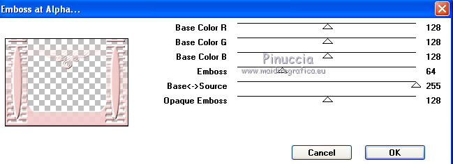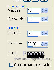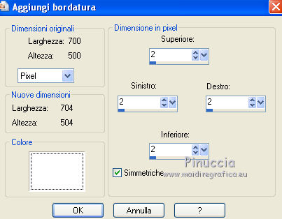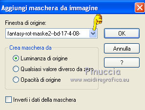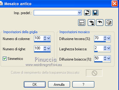 qui puoi trovare qualche risposta ai tuoi dubbi. Se l'argomento che ti interessa non è presente, ti prego di segnalarmelo. Questo tutorial è stato creato con PSP X2, ma può essere eseguito anche con le altre versioni di PSP. Per tradurlo, ho usato PSP X. Il materiale viene da vari gruppi di condivisione. Il copyright appartiene ai rispettivi autori. Grazie ai creatori dei tubes che mettono a disposizione il loro lavoro in vari gruppi di condivisione. Rispetta il lavoro degli autori, non cambiare il nome del file e non cancellare il watermark. Occorrente: Due tubes a scelta. Il resto del materiale qui I tubes usati sono di Masuimi Max Filtri. se hai problemi con i filtri, ricorda di consulta la mia sezione qui Xero - Improver qui Mura's Seamless - Emboss at Alpha qui Apri le maschere in PSP e minimizzale con il resto del materiale. 1. Scegli due colori dai tuoi tubes, e imposta il colore chiaro come colore di primo piano, e il colore scuro come colore di sfondo. Apri una nuova immagine trasparente 700 x 500 pixels, e riempila con il colore di sfondo.Livelli>Nuovo livello raster. Riempi con il colore di primo piano.Livelli>Nuovo livello maschera>da immagine. Apri il menu sotto la finestra di origine e vedrai la lista dei files aperti. Seleziona la maschera fantasy-rot-maske-bd-17-4-08, con i seguenti settaggi. ![]() Livelli>Unisci>Unisci gruppo. Regola>Messa a fuoco>Accentua messa a fuoco. 2. Livelli>Nuovo livello raster. Riempi con il colore di primo piano.Livelli>Nuovo livello maschera>da immagine. Apri il menu sotto la finestra di origine e seleziona la maschera 8MSKDW37: ![]() Livelli>Unisci>Unisci gruppo. Effetti>Plugins>Mura's Seamless - Emboss at Alpha. ![]() Regola>Messa a fuoco>Accentua messa a fuoco. Effetti>Effetti 3D>Sfalsa ombra. ![]() Apri il tuo primo tube e vai a Modifica>Copia. Torna al tuo lavoro e vai a Modifica>Incolla come nuovo livello. Immagine>Ridimensiona, se e quanto necessario. Sposta il tube a sinistra.Nella paletta dei livelli porta questo livello sotto quello della maschera. Livelli>Duplica e attiva il livello sottostante del tube originale. Regola>Sfocatura>Sfocatura gaussiana - raggio 10. ![]() Effetti>Effetti di trama>Mosaico antico. ![]() Attiva il livello soprastante del duplicato del tube. Spostalo leggermente più a destra.Effetti>Plugins>Xero - Improver. ![]() Effetti>Effetti 3D>Sfalsa ombra. ![]() Attiva lo strumento Gomma ![]() Attiva il livello della maschera e cancella le tracce sul viso del tube. ![]() Dovresti avere questo. ![]() 3. Rimani posizionato sul livello superiore della maschera. Apri il tuo secondo tube e vai a Modifica>Copia. Torna al tuo lavoro e vai a Modifica>Incolla come nuovo livello. Immagine>Ridimensiona, se e quanto necessario. Sposta il tube a destra.Livelli>Duplica e attiva il livello sottostante del tube originale. Regola>Sfocatura>Sfocatura gaussiana - raggio 10. ![]() Effetti>Effetti di trama>Mosaico antico. ![]() Attiva il livello soprastante del duplicato del tube. Spostalo leggermente più a sinistra.Effetti>Plugins>Xero - Improver. ![]() Effetti>Effetti 3D>Sfalsa ombra. ![]() 4. Apri il tube "Gerry-Greece1-02 april 2007" e vai a Modifica>Copia. Torna al tuo lavoro e vai a Modifica>Incolla come nuovo livello. Immagine>Ridimensiona, al 70%, tutti i livelli non selezionato. Spostalo nell'angolo in basso a destra, in modo che la parte nera non sia visibile.Livelli>Duplica. Immagine>Ridimensiona, all'80%, tutti i livelli non selezionato. Immagine>Rifletti. Spostalo nell'angolo in basso a sinistra, nascondendo la parte nera.Su entrambi i livelli: Effetti>Plugins>Xero - Improver, con i settaggi precedenti. Sul livello del tube a sinistra: Effetti>Effetti 3D>Sfalsa ombra. ![]() Sul livello del tube a destra: Effetti>Effetti 3D>Sfalsa ombra. ![]() 5. Apri il file di testo e vai a Modifica>Copia. Torna al tuo lavoro e vai a Modifica>Incolla come nuovo livello. Immagine>Ridimensiona, al 70%, tutti i livelli non selezionato. Spostalo in basso, come nel mio esempio.Effetti>Plugins>Xero - Improver, con i settaggi precedenti. Controlla che tutto sia al posto giusto. Livelli>Unisci>Unisci visibile. Immagine>Aggiungi bordatura, 2 pixels, simmetriche, con il colore bianco. ![]() Livelli>Innalza livello di sfondo. Modifica>Copia. Immagine>Dimensioni tela. ![]() Livelli>Nuovo livello raster. Livelli>Disponi>Porta sotto. Selezione>Seleziona tutto. Modifica>Incolla nella selezione. Selezione>Deseleziona. 6. Regola>Sfocatura>Sfocatura radiale. ![]() Effetti>Effetti di trama>Mosaico antico. ![]() Selezione>Seleziona tutto. Selezione>Modifica>Contrai - 45 pixels. ![]() Selezione>Inverti. Livelli>Nuovo livello raster. Effetti>Effetti 3D>Ritaglio. ![]() Selezione>Deseleziona. Immagine>Aggiungi bordatura, 2 pixels, simmetriche, con il colore bianco. Aggiungi il tuo nome e/o il tuo watermark su un nuovo livello, senza dimenticare il copyright delle immagini usate. Salva in formato jpg. ![]() Se hai problemi o dubbi, o trovi un link non funzionante, o anche soltanto per un saluto, scrivimi 5 Giugno 2011 |
