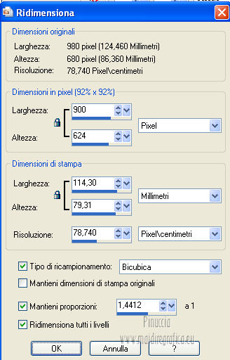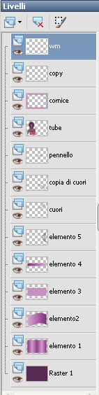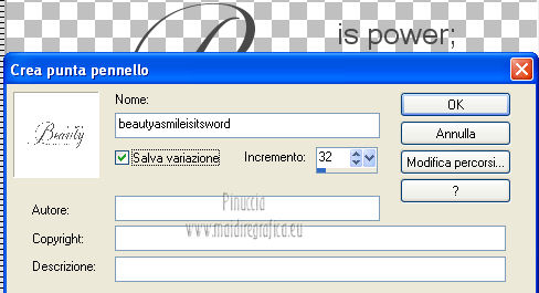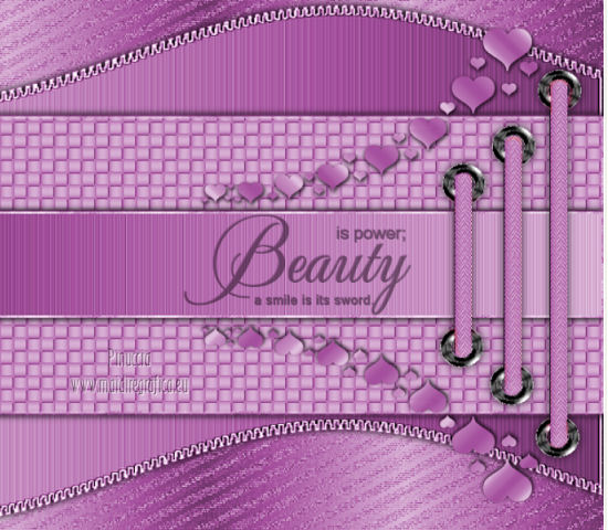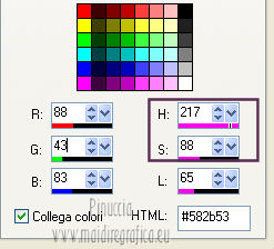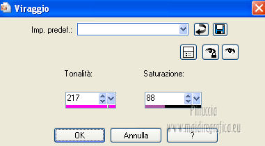 qui puoi trovare qualche risposta ai tuoi dubbi. Se l'argomento che ti interessa non è presente, ti prego di segnalarmelo. Questo tutorial è stato creato con PSP X2, ma può essere eseguito anche con le altre versioni di PSP. Per tradurlo, ho usato PSP X. Grazie ai creatori dei tubes che mettono a disposizione il loro lavoro in vari gruppi di condivisione. Rispetta il lavoro degli autori, non cambiare il nome del file e non cancellare il watermark. Occorrente: Un tube a scelta. Il resto del materiale qui Per i poser usati grazie Marion. Prefazione. Gli elementi forniti sono stati abbinati al mio colore. Prendi nota dei valori di Tonalità (H) e Saturazione (S) del tuo colore. ![]() Regola>Tonalità e saturazione>Viraggio, e trascrivi i valori annotati nelle rispettive caselle. ![]() 1. Scegli due colori dal tuo tube e imposta il colore di primo piano con il colore chiaro, e il colore di sfondo con il colore scuro. Apri una nuova immagine trasparente 900 x 600 pixels. Apri "element1" e vai a Modifica>Copia. Torna al tuo lavoro e vai a Modifica>Incolla come nuovo livello. Apri "element2" e vai a Modifica>Copia. Torna al tuo lavoro e vai a Modifica>Incolla come nuovo livello. Apri "element3" e vai a Modifica>Copia. Torna al tuo lavoro e vai a Modifica>Incolla come nuovo livello. Apri "element4" e vai a Modifica>Copia. Torna al tuo lavoro e vai a Modifica>Incolla come nuovo livello. Apri "element5" e vai a Modifica>Copia. Torna al tuo lavoro e vai a Modifica>Incolla come nuovo livello. Per colorare le bande, escludendo gli occhielli, attiva lo strumento Trasforma in destinazione ![]() ![]() Passa il mouse sulle bande, facendo attenzione a non colorare gli occhielli. Sposta il tube a destra.![]() Effetti>Effetti 3D>Sfalsa ombra. ![]() 2. Apri "hearts121-sandi". Scegli un colore e attiva il livello corrispondente. Modifica>Copia. Torna al tuo lavoro e vai a Modifica>Incolla come nuovo livello. Immagine>Rifletti. Sposta i cuori in alto a destra.![]() Effetti>Effetti 3D>Sfalsa ombra. ![]() Livelli>Duplica. Immagine>Capovolgi. ![]() Apri il wordart "QB_WordArt_Beauty 3". File>Esporta>Pennello personalizzato ![]() Assegna un nome al pennello e ok. ![]() Attiva lo strumento Pennello ![]() Cerca e seleziona il pennello che hai appena esportato, con i seguenti settaggi ![]() Livelli>Nuovo livello raster. Applica il pennello cliccando 2-4 volte con il tasto destro del mouse, per usare il colore scuro di sfondo. Effetti>Effetti 3D>Sfalsa ombra. ![]() Posiziona il pennello a destra,come nell'esempio. ![]() Apri il tuo tube e vai a Modifica>Copia. Torna al tuo lavoro e vai a Modifica>Incolla come nuovo livello. Immagine>Ridimensiona, se e quanto necessario. Regola>Messa a fuoco>Metti a fuoco. Sposta il tube a sinistra.Effetti>Effetti 3D>Sfalsa ombra. ![]() Se, come nel mio caso, parte del tube è uscito dal bordo inferiore, attiva il livello inferiore. Selezione>Seleziona tutto. Immagine>Ritaglia la selezione. 4. Immagine>Dimensioni tela. ![]() Riempi il livello ancora trasparente con il colore di sfondo.Attiva il livello superiore. Apri "rahmen" e vai a Modifica>Copia. Torna al tuo lavoro e vai a Modifica>Incolla come nuovo livello. Immagine>Ridimensiona, a 900 pixels di larghezza, tutti i livelli selezionato. ![]() Aggiungi il tuo nome e/o il tuo watermark su un nuovo livello, senza dimenticare eventuali delle immagini usate. ![]() Livelli>Unisci>Unisci tutto e salva in formato jpg. ![]() Se hai problemi o dubbi, o trovi un link non funzionante, o anche soltanto per un saluto, scrivimi. 5 Novembre 2012 |