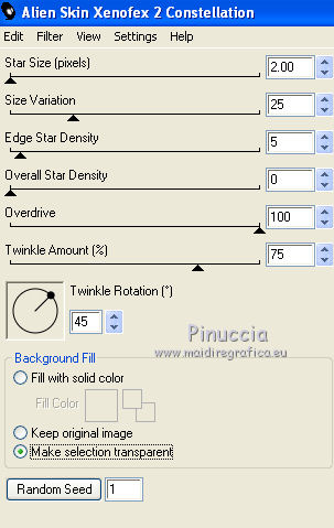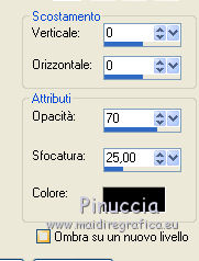 qui puoi trovare qualche risposta ai tuoi dubbi. Se l'argomento che ti interessa non è presente, ti prego di segnalarmelo. Questo tutorial è stato creato con PSP X2, ma può essere eseguito anche con le altre versioni di PSP. Per tradurlo, ho usato PSP X. Grazie ai creatori dei tubes che mettono a disposizione il loro lavoro in vari gruppi di condivisione. Rispetta il lavoro degli autori, non cambiare il nome del file e non cancellare il watermark. Occorrente: Tre tubes a scelta. Il resto del materiale qui Per i bei poser grazie Moni Filtri: Mura's Seamless - Emboss at Alpha qui Alien Skin Xenofex 2.0 - Constellation qui VM Natural - Sparkle qui Animation Shop qui Apri le maschere in PSP e minimizzale con il resto del materiale. 1. Scegli un colore dai tuoi tubes. Prendi nota dei valori di Tonalità (H) e Saturazione (S) di questo colore. Ti serviranno per colorizzare gli elementi della tua tag. (Sul Viraggio vedi qui)Scegli dai tuoi tubes un colore chiaro per il colore di primo piano, Apri VORLAGE_ILR. Duplicalo usando la combinazione di tasti maiuscola+D e chiudi l'originale. La copia sarà la base del tuo lavoro. Colorizza l'immagine se stai usando colori diversi. Livelli>Nuovo livello raster. Riempi il livello con il tuo colore.Livelli>Nuovo livello maschera>Da immagine. Apri il menu sotto la finestra di origine e vedrai la lista dei files aperti. Seleziona la maschera "93MaskkelsWWA", con i seguenti settaggi. ![]() Livelli>Unisci>Unisci gruppo. Rinomina questo livello "animazione". 2. Apri Frame(834)1 e vai a Modifica>Copia. Torna al tuo lavoro e vai a Modifica>Incolla come nuovo livello. Colorizza in base al tuo colore. Effetti>Plugins>Mura's Seamless - Emboss at Alpha. ![]() Apri il tube del viso e vai a Modifica>Copia. Torna al tuo lavoro e vai a Modifica>Incolla come nuovo livello. Posiziona il tube nell'area della cornice.Immagine>Ridimensiona, se e quanto necessario. Attiva lo strumento Gomma ![]() e cancella la parte di tube esterna alla cornice (abbassa momentaneamente l'opacità del livello per vedere meglio). ![]() Dovresti avere questo. ![]() Se hai ridimensionato il tube, non dimenticare di mettere a fuoco: Regola>Messa a fuoco>Metti a fuoco. Effetti>Effetti 3D>Sfalsa ombra. ![]() 3. Apri il secondo tube e vai a Modifica>Copia. Torna al tuo lavoro e vai a Modifica>Incolla come nuovo livello. Immagine>Ridimensiona, se e quanto necessario. Regola>Messa a fuoco>Metti a fuoco. Spostalo a sinistra.Effetti>Effetti 3D>Sfalsa ombra, con i settaggi precedenti. Livelli>Nuovo livello raster. Riempi con il tuo colore.Livelli>Nuovo livello maschera>Da immagine. Apri il menu sotto la finestra di origine e seleziona la maschera "4572". ![]() Livelli>Unisci>Unisci gruppo. Cambia la modalità di miscelatura di questo livello in Luce diffusa. Apri il terzo tube e vai a Modifica>Copia. Torna al tuo lavoro e vai a Modifica>Incolla come nuovo livello. Immagine>Ridimensiona, se e quanto necessario. Regola>Messa a fuoco>Metti a fuoco. Sposta il tube al centro.Effetti>Effetti 3D>Sfalsa ombra, con i settaggi precedenti. Scrivi il tuo testo o, se preferisci, apri il file di testo e vai a Modifica>Copia. Torna al tuo lavoro e vai a Modifica>Incolla come nuovo livello. Se necessario colorizza. Sposta il testo in basso a destra.Aggiungi il tuo nome e/o il tuo watermark su un nuovo livello, 4. Animazione. Attiva il livello "animazione". Livelli>Duplica - 2 volte e rimani posizionato sul livello della seconda copia. Effetti>Plugins>Alien Skin Xenofex 2.0 - Constellation. ![]() Attiva il livello della prima copia. Effetti>Plugins>Alien Skin Xenofex 2.0 - Constellation, clicca su Random Seed e ok. Attiva il livello originale "animazione". Effetti>Plugins>Alien Skin Xenofex 2.0 - Constellation, clicca su Random Seed e ok. Attiva nuovamente il livello della seconda copia. Effetti>Plugins>VM Natural - Sparkle. ![]() Effetti>Plugins>VM Natural - Sparkle, cambia soltanto Random Seed con 140 e ok. ![]() Chiudi questo livello e attiva il livello originale. Effetti>Plugins>VM Natural - Sparkle, cambia soltanto Random Seed con 142 e ok. Lascia il livello visibile. Modifica>Copia Unione. Apri Animation Shop e vai a Modifica>Incolla>Incolla come nuova animazione. Torna in PSP. Chiudi il livello "animazione" e apri il livello della prima copia. Modifica>Copia Unione. Torna in Animation Shop e vai a Modifica>Incolla>Incolla dopo il fotogramma corrente. Di nuovo in PSP. Chiudi il livello della prima copia e apri il livello della seconda copia. Modifica>Copia Unione. Per finire, in Animation Shop vai a Modifica>Incolla>Incolla dopo il fotogramma corrente. Controlla il risultato cliccando su Visualizza e salva in formato gif.![]() ![]() ![]() Se hai problemi o dubbi, o trovi un link non funzionante, o anche soltanto per un saluto, scrivimi 10 Aprile 2012 |