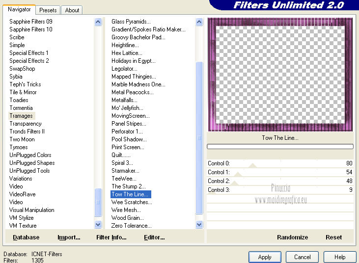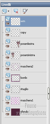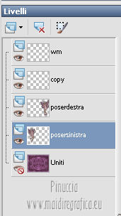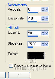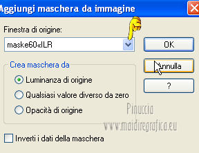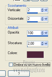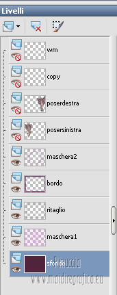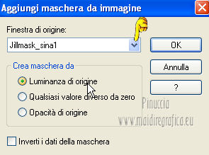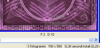 qui puoi trovare qualche risposta ai tuoi dubbi. Se l'argomento che ti interessa non è presente, ti prego di segnalarmelo. Questo tutorial è stato creato con PSP X2, ma può essere eseguito anche con le altre versioni di PSP. Per tradurlo, ho usato PSP X. Grazie ai creatori dei tubes che mettono a disposizione il loro lavoro in vari gruppi di condivisione. Rispetta il lavoro degli autori, non cambiare il nome del file e non cancellare il watermark. Occorrente: Tubes a scelta. Il resto del materiale qui Per i poser grazie Gerda V4-Shyrin, 28 marzo 2013. ![]() Per il frattale usato per l'animazione grazie Bärbel Filtri: Tramages - Tow the line qui Xero - Improver qui Animation Shop qui Apri le maschere in PSP e minimizzale con il resto del materiale, tranne l'animazione che userai in Animation Shop. 1. Scegli due colori dai tuoi tubes, imposta il colore di primo piano con il colore chiaro, e il colore di sfondo con il colore scuro. I miei colori. ![]() Apri una nuova immagine trasparente 700 x 550 pixels, e riempila con il colore di sfondo.Livelli>Nuovo livello raster. Riempi con il colore di primo piano.Livelli>Nuovo livello maschera>Da immagine. Apri il menu sotto la finestra di origine e vedrai la lista dei files aperti. Seleziona la maschera "jillmask_sina1". ![]() Livelli>Unisci>Unisci gruppo. Effetti>Effetti di bordo>Aumenta. Effetti>Effetti 3D>Sfalsa ombra, con il colore di primo piano. ![]() 2. Selezione>Seleziona tutto. Selezione>Modifica>Contrai - 40 pixels. ![]() Livelli>Nuovo livello raster. Effetti>Effetti 3D>Ritaglio. ![]() Selezione>Inverti. Modifica>Copia Unione. Modifica>Incolla come nuovo livello. Effetti>Plugins>Filters Unlimited 2.0 - Tramage - Tow the line. ![]() Selezione>Deseleziona. Livelli>Nuovo livello raster. Riempi con il colore di primo piano.Livelli>Nuovo livello maschera>Da immagine. Apri il menu sotto la finestra di origine e vedrai la lista dei files aperti. Seleziona la maschera "maske60©ILR". ![]() Livelli>Unisci>Unisci gruppo. Effetti>Effetti di bordo>Aumenta. Effetti>Effetti 3D>Sfalsa ombra, con il colore di sfondo. ![]() 3. Apri il tuo primo tube vai a Modifica>Copia. Torna al tuo lavoro e vai a Modifica>Incolla come nuovo livello. Immagine>Ridimensiona, se e quanto necessario, tutti i livelli non selezionato. Spostalo a sinistra.Effetti>Plugins>Xero - Improver. ![]() Effetti>Effetti 3D>Sfalsa ombra, con il colore nero. ![]() Apri il tuo secondo tube vai a Modifica>Copia. Torna al tuo lavoro e vai a Modifica>Incolla come nuovo livello. Immagine>Ridimensiona, se e quanto necessario, tutti i livelli non selezionato. Spostalo a destra.Effetti>Plugins>Xero - Improver, con i settaggi precedenti. Effetti>Effetti 3D>Sfalsa ombra, con il colore nero. ![]() Aggiungi il tuo nome e/o il tuo watermark su un nuovo livello, senza dimenticare eventuali copyright delle immagini usate. Questa dovrebbe essere la tua paletta dei livelli. ![]() 4. Chiudi i quattro livelli superiori e attiva il livello inferiore. ![]() Livelli>Unisci>Unisci visibile. Chiudi questo livello e attiva il livello soprastante. ![]() Livelli>Unisci>Unisci visibile. Riapri e attiva il livello inferiore. ![]() 5. Animazione. Modifica>Copia Unione. Apri Animation Shop e vai a Modifica>Incolla>Incolla come nuova animazione. Modifica>Duplica - 2 volte - o premi due volte l'icona corrispondente sulla barra superiore degli strumenti e avrai tre fotogrammi ![]() Modifica>Seleziona tutto. Clicca 3 volte sull'icona Duplica e avrai ottenuto velocemente un'animazione composta da 24 fotogrammi. ![]() Clicca sul primo fotogramma per selezionarlo e vai a Modifica>Seleziona tutto. Apri l'animazione "ani©ILR", anche questa composta da 24 fotogrammi. Modifica>Seleziona tutto. Modifica>Copia. Attiva il tuo lavoro e vai a Modifica>Incolla>Incolla nel fotogramma selezionato. Posiziona l'animazione al centro. ![]() Torna in PSP. Attiva il livello superiore e vai a Modifica>Copia. Torna in Animation Shop e vai a Modifica>Incolla>Incolla come nuova animazione. Puoi duplicare l'immagine, come spiegato prima, in modo da ottenere 24 fotogrammi, oppure cliccare sulla barra superiore degli strumenti, prima sull'icona Copia e poi su Propaga incolla (l'icona deve "abbassarsi") ![]() Attiva il tuo lavoro e vai a Modifica>Incolla>Incolla nel fotogramma selezionato. Posiziona l'immagine al centro, com'era in PSP. ![]() Controlla il risultato cliccando su Visualizza e salva in formato gif.Se vuoi ridurre il peso della tua animazione, vedi qui ![]() Se hai problemi o dubbi, o trovi un link non funzionante, o anche soltanto per un saluto, scrivimi. 4 Aprile 2013 |