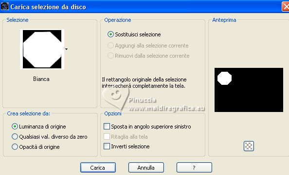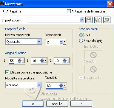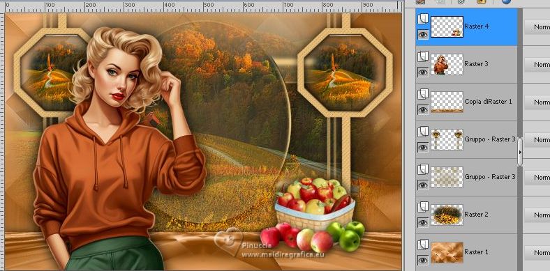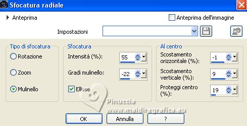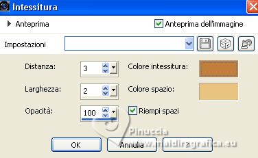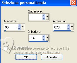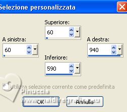 qui puoi trovare qualche risposta ai tuoi dubbi. Se l'argomento che ti interessa non è presente, ti prego di segnalarmelo. Questo tutorial è stato realizzato con PSP2019 e tradotto con PSPX7, ma può essere realizzato anche con le altre versioni di PSP. Dalla versione X4, il comando Immagine>Rifletti è stato sostituito con Immagine>Capovolgi in orizzontale, e il comando Immagine>Capovolgi con Immagine>Capovolgi in verticale. Nelle versioni X5 e X6, le funzioni sono state migliorate rendendo disponibile il menu Oggetti. Con la nuova versione X7, sono tornati Rifletti>Capovolgi, ma con nuove varianti. Vedi la scheda sull'argomento qui Grazie ai creatori dei tubes che mettono a disposizione il loro lavoro in vari gruppi di condivisione. Rispetta il lavoro degli autori, non cambiare il nome del file e non cancellare il watermark. traduzione francese qui traduzione inglese qui Le vostre versioni qui![]() Occorrente: Un tube a scelta (i tubes usati da Inge-Lore sono sotto licenza) Il resto del materiale qui Grazie per il tube Mentali e per le maschere Narah. Per il tube utilizzato per la mia traduzione grazie Adrienne (in questa pagina trovi i links ai siti dei creatori di tubes) Filtri: in caso di dubbi, ricorda di consultare la mia sezione filtri qui Filters Unlimited 2.0 qui Mehdi - Sorting Tiles qui Mura's Meister - Perspective Tiling qui FM Tile Tools Saturation Emboss qui Alien Skin Eye Candy 5 Impact - Glass qui AAA Frames - Frame Works qui ![]() non esitare a cambiare modalità di miscelatura e opacità secondo i colori utilizzati. ![]() Metti la selezione nella cartella Selezioni. Apri le maschere in PSP e minimizzale con il resto del materiale. 1. Scegli due colori dai tuoi tubes Imposta il colore di primo piano con il colore chiaro #e9c480, e il colore di sfondo con il colore scuro #c27e3d ![]() Apri una nuova immagine trasparente 1000 x 650 pixels. Riempi l'immagine trasparente con uno dei tuoi colori.Livelli>Nuovo livello raster. Apri SD-LemonSqueeze-Papers (14) ![]() Modifica>Copia. Torna al tuo lavoro e vai a Modifica>Incolla nella selezione. Selezione>Deseleziona. Cambia la modalità di miscelatura di questo livello in Luminanza (esistente). Livelli>Unisci>Unisci giù. 2. Regola>Sfocatura>Sfocatura radiale. ![]() Effetti>Plugins>Mehdi - Sorting Tiles. ![]() Effetti>Effetti di bordo>Aumenta. Apri il tuo tube di sfondo mentali-misted2087 ![]() Modifica>Copia. Torna al tuo lavoro e vai a Modifica>Incolla come nuovo livello. Immagine>Ridimensiona, se necessario, per l'esempio 110%, tutti i livelli non selezionato. Regola>Messa a fuoco>Metti a fuoco. Effetti>Plugins>FM Tile Tools - Saturation Emboss, con i settaggi standard. ![]() Livelli>Nuovo livello raster. Riempi il livello con il colore chiaro.3. Livelli>Nuovo livello maschera>Da immagine. Apri il menu sotto la finestra di origine e vedrai la lista dei files aperti. Seleziona la maschera Narah_Masks_1437 ![]() Effetti>Effetti di bordo>Aumenta. Livelli>Unisci>Unisci gruppo. Livelli>Nuovo livello raster. Riempi il livello con il colore chiaro.Livelli>Nuovo livello maschera>Da immagine. Apri il menu sotto la finestra di origine e seleziona la maschera Narah_Masks_1495 ![]() Effetti>Effetti di bordo>Aumenta. Livelli>Unisci>Unisci gruppo. 4. Tasto K per attivare lo strumento Puntatore ![]() imposta Posizione X: -89,00 e mantieni Posizione Y: 0,00. ![]() Attiva il livello Raster 1. Selezione>Seleziona tutto. Immagine>Ritaglia la selezione. Attiva il livello superiore. Selezione>Carica/Salva selezione>Carica selezione da disco. Cerca e carica la selezione Bianca ![]() Premi sulla tastiera il tasto CANC ![]() Livelli>Nuovo livello raster. Modifica>Incolla nella selezione (il tube del paesaggio è ancora in memoria). Regola>Messa a fuoco>Metti a fuoco. 5. Effetti>Plugins>FM Tile Tool – Saturation Emboss, con i settaggi standard. ![]() Effetti>Plugins>Alien Skin Eye Candy 5 Impact – Glass Seleziona il preset Clear e ok. ![]() Selezione>Deseleziona. Attiva il livello sottostante. Effetti>Effetti di trama>Intessitura colore intessitura: colore scuro colore spazi: colore chiaro ![]() Effetti>Effetti 3D>Sfalsa ombra. ![]() 6. Attiva il livello superiore (Raster 3) Livelli>Unisci>Unisci giù. Livelli>Duplica. Tasto K per attivare lo strumento Puntatore ![]() imposta Posizione X: 716,00 e mantieni Posizione Y: 0,00. ![]() Livelli>Unisci>Unisci giù. Attiva il livello sottostante della prima maschera. Strumento Puntatore ![]() imposta Posizione X: 31,00 e Posizione Y: -48,00. ![]() 7. Facoltativo (dipende dai colori, nel secondo esempio non l'ho fatto). Attiva lo strumento Selezione ![]() (non importa il tipo di selezione impostato, perché con la selezione personalizzata si ottiene sempre un rettangolo) clicca sull'icona Selezione personalizzata ![]() e imposta i seguenti settaggi. ![]() Selezione>Inverti. Premi sulla tastiera il tasto CANC. Selezione>Deseleziona. Attiva il livello Raster 1. Livelli>Duplica. Effetti>Plugins>Mura's Meister - Perspective Tiling. ![]() Livelli>Disponi>Porta in alto. Effetti>Effetti 3D>Sfalsa ombra, con i settaggi precedenti. Effetti>Effetti di riflesso>Specchio rotante, con i settaggi standard. ![]() 8. Apri il tuo tube, io ho scelto un tube di Adrienne ![]() Modifica>Copia. Torna al tuo lavoro e vai a Modifica>Incolla come nuovo livello. Immagine>Ridimensiona, se necessario, tutti i livelli non selezionato. Regola>Messa a fuoco>Metti a fuoco. Effetti>Effetti 3D>Sfalsa ombra. ![]() Apri il tuo tube accessorio, per me ![]() Modifica>Copia. Torna al tuo lavoro e vai a Modifica>Incolla come nuovo livello. Immagine>Ridimensiona, se necessario, tutti i livelli non selezionato. Regola>Messa a fuoco>Metti a fuoco. Effetti>Effetti 3D>Sfalsa ombra. ![]() ![]() 9. Chiudi il livello del tube. Attiva il livello inferiore. Livelli>Unisci>Unisci visibile, e rimani su questo livello. Livelli>Duplica. Immagine>Ridimensiona, al 90%, tutti i livelli non selezionato. Attiva il livello inferiore. Regola>Sfocatura>Sfocatura ga