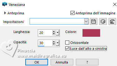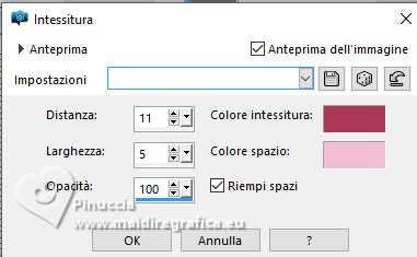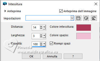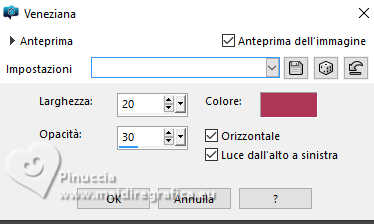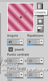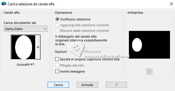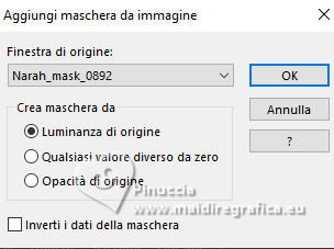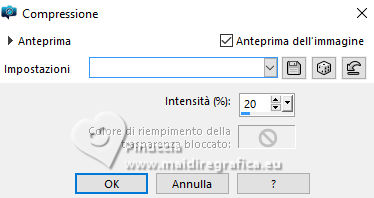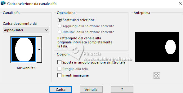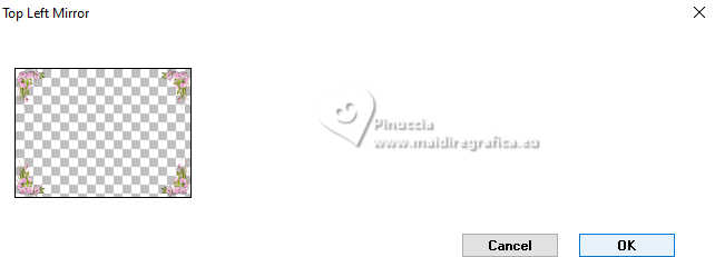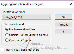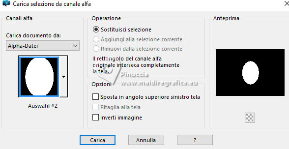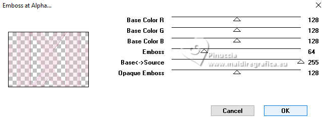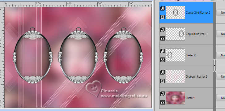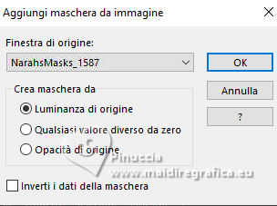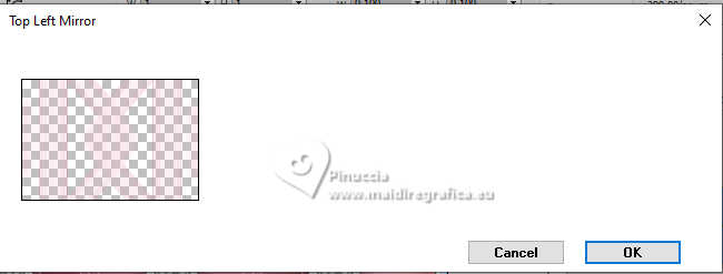 qui puoi trovare qualche risposta ai tuoi dubbi. Se l'argomento che ti interessa non è presente, ti prego di segnalarmelo. Questo tutorial è stato realizzato con PSP2019 e tradotto con PSPX9, PSP 2019 e PSP2020, ma può essere realizzato anche con le altre versioni di PSP. Dalla versione X4, il comando Immagine>Rifletti è stato sostituito con Immagine>Capovolgi in orizzontale, e il comando Immagine>Capovolgi con Immagine>Capovolgi in verticale. Nelle versioni X5 e X6, le funzioni sono state migliorate rendendo disponibile il menu Oggetti. Con la nuova versione X7, sono tornati Rifletti>Capovolgi, ma con nuove varianti. Vedi la scheda sull'argomento qui Grazie ai creatori dei tubes che mettono a disposizione il loro lavoro in vari gruppi di condivisione. Rispetta il lavoro degli autori, non cambiare il nome del file e non cancellare il watermark. traduzione francese qui traduzione inglese qui Le vostre versioni qui![]() Occorrente: Materiale ![]() Per i tubes delle mia seconda versione grazie Gerda. Per due maschere grazie Narah. (in questa pagina trovi i links ai siti dei creatori di tubes) ![]() in caso di dubbi, ricorda di consultare la mia sezione filtri qui Filters Unlimited 2.0 qui Mura's Seamless - Emboss at Alpha qui Simple - Top Left Mirror qui I filtri Mura's Seamless e Simple si possono usare da soli o importati in Filters Unlimited (come fare vedi qui) Se un filtro fornito appare con questa icona ![]() non esitare a cambiare modalità di miscelatura e opacità secondo i colori utilizzati. Nelle ultime versioni di PSP non c'é il gradiente di primo piano/sfondo (Corel_06_029) Puoi usare i gradienti delle versioni precedenti. Trovi qui i gradienti Corel X. ![]() Apri le maschere in PSP e minimizzale con il resto del materiale. 1. Scegli dai tuoi tubes un colore chiaro e un colore scuro. Per il mio esempio: ![]() Apri Alpha-Datei Finestra>Duplica o sulla tastiera maiuscola+D per fare una copia. ![]() Chiudi l'originale. La copia, che sarà la base del tuo lavoro, non è vuota, ma contiene le selezioni salvate sul canale alfa. Riempi l'immagine trasparente con il tuo colore scuro.Selezione>Seleziona tutto. Apri uno dei tuoi tube e vai a Modifica>Copia. Torna al tuo lavoro e vai a Modifica>Incolla nella selezione. Selezione>Deseleziona. 2. Effetti>Effetti di immagine>Motivo unico, con i settaggi standard. ![]() Regola>Sfocatura>Sfocatura gaussiana - raggio 30 ![]() Livelli>Nuovo livello raster. Riempi il livello con il tuo colore chiaro.Livelli>Njuovo livello maschera>Da immagine. Apri il menu sotto la finestra di origine e vedrai la lista dei files aperti. Seleziona la maschera letéia_049_2018 ![]() Effetti>Effetti di bordo>Aumenta. Livelli>Unisci>Unisci gruppo. 3. Apri christine blank7 ![]() Modifica>Copia. Torna al tuo lavoro e vai a Modifica>Incolla come nuovo livello. Tasto K per attivare lo strumento Puntatore ![]() Posizione X: 48,00 - Posizione Y: 128,00. ![]() Livelli>Duplica. Immagine>Rifletti>Rifletti orizzontalmente. Livelli>Duplica. Posizione X: 339,00 - Posizione Y: 128,00. ![]() ![]() Livelli>Unisci>Unisci giù - 2 volte. 4. Selezione>Carica/Salva selezione>Carica selezione da canale alfa. La selezione Auswahl #1 è subito disponibile. Devi soltanto cliccare Carica. ![]() Apri il tuo primo viso ![]() e vai a Modifica>Copia. Torna al tuo lavoro e vai a Modifica>Incolla come nuovo livello. Immagine>Ridimensiona, se necessario. Posiziona il tube sulla selezione.Regola>Messa a fuoco>Metti a fuoco. Selezione>Inverti. Premi sulla tastiera il tasto CANC ![]() Selezione>Deseleziona. Livelli>Disponi>Sposta giù. 5. Selezione>Carica/Salva selezione>Carica selezione da canale alfa. Apri il menu delle selezioni e carica la selezione Auswahl #2. ![]() Apri il tuo secondo viso ![]() e vai a Modifica>Copia. Torna al tuo lavoro e vai a Modifica>Incolla come nuovo livello. Immagine>Ridimensiona, se necessario. Posiziona il tube sulla selezione.Regola>Messa a fuoco>Metti a fuoco. Selezione>Inverti. Premi sulla tastiera il tasto CANC. Selezione>Deseleziona. Selezione>Carica/Salva selezione>Carica selezione da canale alfa. Apri il menu delle selezioni e carica la selezione Auswahl #3. ![]() Apri il terzo viso ![]() e vai a Modifica>Copia. Torna al tuo lavoro e vai a Modifica>Incolla come nuovo livello. Immagine>Ridimensiona, se necessario. Posiziona il tube sulla selezione.Regola>Messa a fuoco>Metti a fuoco. Selezione>Inverti. Premi sulla tastiera il tasto CANC. Selezione>Deseleziona. 6. Chiudi i due livelli inferiori. Livelli>Unisci>Unisci visibile. Rimani sul livello Uniti. Tasto K per attivare lo strumento Puntatore ![]() Posizione X: 48,00 - Posizione Y: 46,00. ![]() Effetti>Effetti 3D>Sfalsa ombra, colore nero. ![]() Riapri i livelli chiusi e attiva il livello della maschera. Effetti>Effetti di riflesso>Specchio rotante. ![]() Immagine>Rifletti>Rifletti verticalmente (Immagine>Capovolgi). Effetti>Plugins>Simple - Top Left Mirror. ![]() Effetti>Effetti di distorsione>Stringi ![]() 7. Effetti>Plugins>Mura's Seamless - Emboss at Alpha, con i settaggi standard. ![]() Livelli>Nuovo livello raster. Riempi il livello con il colore chiaro.Livelli>Nuovo livello maschera>Da immagine Apri il menu sotto la finestra di origine e seleziona la maschera Narah_mask_0892 ![]() Livelli>Unisci>Unisci gruppo. Attiva il livello Raster 1. 8. Livelli>Nuovo livello raster. Riempi il livello con il colore chiaro.Livelli>Nuovo livello maschera>Da immagine Apri il menu sotto la finestra di origine e seleziona la maschera Narah_mask_1587 ![]() Effetti>Effetti di bordo>Aumenta di più. Livelli>Unisci>Unisci gruppo. Abbassa l'opacità di questo livello al 50%. Apri Deko-2 ![]() Modifica>Copia. Torna al tuo lavoro e vai a Modifica>Incolla come nuovo livello. Tasto K per attivare lo strumento Puntatore ![]() Posizione X: 160,00 - Posizione Y: 0,00. ![]() Effetti>Effetti 3D>Sfalsa ombra, colore nero. ![]() Livelli>Disponi>Porta in alto. 9. Apri Deko-1 ![]() Modifica>Copia. Torna al tuo lavoro e vai a Modifica>I