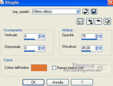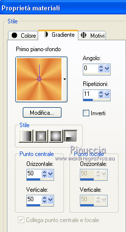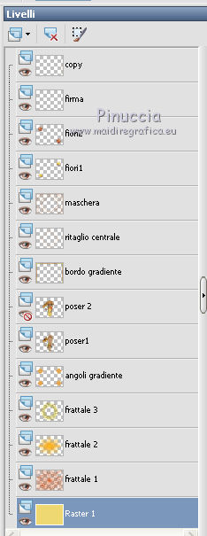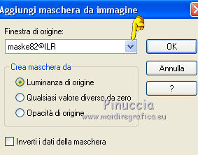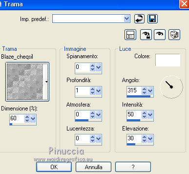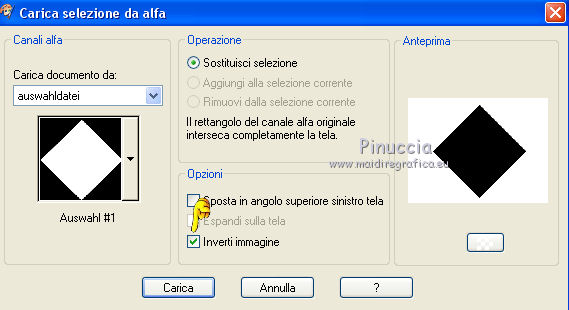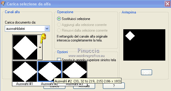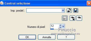 qui puoi trovare qualche risposta ai tuoi dubbi. Se l'argomento che ti interessa non è presente, ti prego di segnalarmelo. Questo tutorial è stato creato con PSP X2, ma può essere eseguito anche con le altre versioni di PSP. Per tradurlo, ho usato PSP X. Se stai usando le nuove versioni di PSP, a proposito delle funzioni Rifletti/Capovolgi, vedi la mia scheda qui Grazie ai creatori dei tubes che mettono a disposizione il loro lavoro in vari gruppi di condivisione. Rispetta il lavoro degli autori, non cambiare il nome del file e non cancellare il watermark. Occorrente: A scelta i tubes di due personaggi e di due fiori. Il resto del materiale qui Grazie per i poser Andrea e per i frattali Bärbel Filtri: Xero - Improver qui Animation Shop qui Metti la trama "blaze_cheqsil"nella cartella Trame. I frattali sono già stati colorati per abbinarli ai colori dell'esempio. Se stai usando altri colori, colorizzali secondo le tue scelte. Apri la maschera in PSP e minimizzala con il resto del materiale, tranne l'animazione che userai in Animation Shop. 1. Scegli due colori dai tuoi tubes, imposta il colore di primo piano con il colore chiaro, e il colore di sfondo con il colore scuro. I miei colori. ![]() Apri Auswahldatei. L'immagine, che sarà la base del tuo lavoro, non è vuota, ma contiene le selezioni salvate sul canale alfa. La selezione auswahl#3 non sarà usata Riempi l'immagine trasparente con il colore chiaro.Effetti>Effetti di trama>Trama - seleziona la trama blaze_cheqsil con i seguenti settaggi. ![]() Livelli>Nuovo livello raster. Riempi con il colore scuro.Livelli>Nuovo livello maschera>Da immagine. Apri il menu sotto la finestra di origine e vedrai la lista dei files aperti. Seleziona la maschera "maske82©ILR", con i seguenti settaggi. ![]() Livelli>Unisci>Unisci gruppo. Effetti>Effetti 3D>Sfalsa ombra. ![]() 2. Attiva il livello inferiore. Apri fraktal-105-bd-16-12-11 e vai a Modifica>Copia. Torna al tuo lavoro e vai a Modifica>Incolla come nuovo livello. Apri fraktal-5-bd-16-12-11 e vai a Modifica>Copia. Torna al tuo lavoro e vai a Modifica>Incolla come nuovo livello. Apri fraktal-180-bd-16-12-11 e vai a Modifica>Copia. Torna al tuo lavoro e vai a Modifica>Incolla come nuovo livello. (al posto dei frattali puoi anche inserire una tua immagine di sfondo). Rimani posizionato sul livello del terzo frattale. Livelli>Nuovo livello raster. Passa il colore di primo piano a Gradiente, stile Lineare, con i seguenti settaggi. ![]() Selezione>Carica/Salva selezione>Carica selezione da canale alfa. Apri il menu delle selezioni e carica Auswahl#2. ![]() Riempi la selezione con il gradiente.Regola>Sfocatura>Sfocatura gaussiana - raggio 2. ![]() Selezione>Deseleziona. Livelli>Duplica - 3 volte e posiziona i duplicati sugli agli angoli.![]() Assicurati di essere posizionato sul livello superiore dei quattro. Livelli>Unisci>Unisci giù - 3 volte. 3. Attiva il livello superiore. Apri il tuo primo fiore e vai a Modifica>Copia. Torna al tuo lavoro e vai a Modifica>Incolla come nuovo livello. Immagine>Ridimensiona, se e quanto necessario, tutti i livelli non selezionato. Regola>Messa a fuoco>Metti a fuoco. Spostalo sul rombo in alto a destra.Effetti>Effetti 3D>Sfalsa ombra. ![]() Livelli>Duplica. Immagine>Rifletti. Sposta questo fiore nel rombo in basso a sinistra.Livelli>Unisci>Unisci giù. Apri il tuo secondo fiore e vai a Modifica>Copia. Torna al tuo lavoro e vai a Modifica>Incolla come nuovo livello. Immagine>Ridimensiona, se e quanto necessario, tutti i livelli non selezionato. Regola>Messa a fuoco>Metti a fuoco. Spostalo sul rombo in alto a sinistra.Effetti>Effetti 3D>Sfalsa ombra, con i settaggi precedenti. Livelli>Duplica. Immagine>Rifletti. Sposta questo fiore nel rombo in basso a destra.Livelli>Unisci>Unisci giù. ![]() 4. Apri il primo poser e vai a Modifica>Copia. Torna al tuo lavoro e vai a Modifica>Incolla come nuovo livello. Immagine>Ridimensiona, se e quanto necessario, tutti i livelli non selezionato. Porta questo livello sotto il livello della maschera. Regola>Messa a fuoco>Metti a fuoco. Spostalo il tube al centro della maschera.Chiudi momentaneamente il livello. Apri il secondo poser e vai a Modifica>Copia. Torna al tuo lavoro e vai a Modifica>Incolla come nuovo livello. Immagine>Ridimensiona, se e quanto necessario, tutti i livelli non selezionato. Regola>Messa a fuoco>Metti a fuoco. Spostalo al centro della maschera.Selezione>Carica/Salva selezione>Carica selezione da canale alfa. La selezione Auswahl#1 è subito disponibile. Selezione inverti selezione (e avrai già la selezione invertita) e Carica. ![]() Premi sulla tastiera il tasto CANC. Apri e attiva il livello del primo poser e premi sulla tastiera il tasto CANC. Selezione>Deseleziona. Su entrambi i livelli: Effetti>Plugins>Xero - Improver. ![]() Effetti>Effetti 3D>Sfalsa ombra, con i settaggi precedenti. Chiudi il livello del secondo poser. Livelli>Nuovo livello raster (sei sempre sotto il livello della maschera). Selezione>Seleziona tutto. Selezione>Modifica>Contrai - 12 pixels. ![]() Effetti>Effetti 3D>Ritaglio. ![]() Selezione>Inverti. Riempi con il gradiente.Selezione>Deseleziona. Livelli>Nuovo livello raster. Selezione>Carica/Salva selezione>Carica selezione da canale alfa. Carica nuovamente la selezione auswahl#1, inverti non selezionato. ![]() Effetti>Effetti 3D>Ritaglio, con i settaggi precedenti, ma con il colore scuro. ![]() Selezione>Deseleziona. Attiva il livello superiore. Aggiungi il tuo nome e/o il tuo watermark su un nuovo livello, senza dimenticare eventuali copyright delle immagini usate. Questa dovrebbe essere la tua paletta dei livelli. ![]() 6. Animazione. Modifica>Copia Unione. Apri Animation Shop e vai a Modifica>Incolla>Incolla come nuova animazione. Modifica>Duplica e ripeti finchè non avrai 6 fotogrammi. Clicca sul fotogramma 6 per selezionarlo (soltanto questo deve avere la cornice blu). Torna in PSP. Chiudi il livello del primo poser e apri il livello del secondo poser. Modifica>Copia. Torna