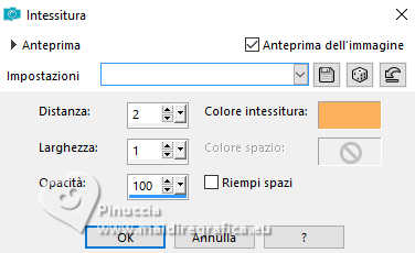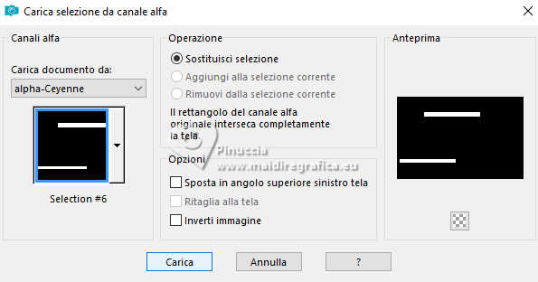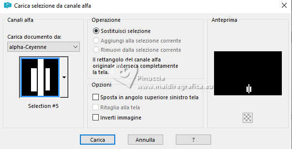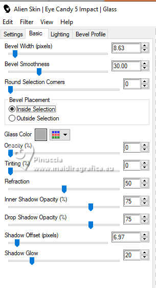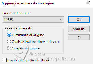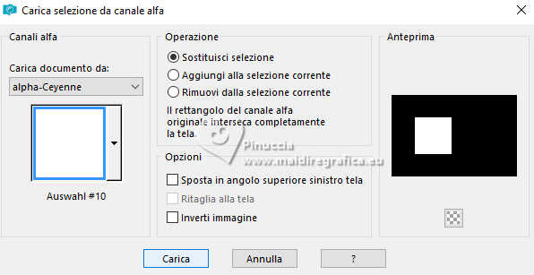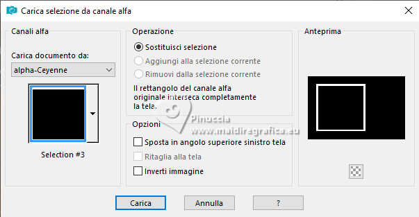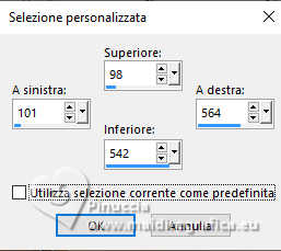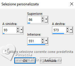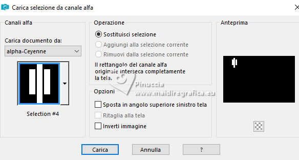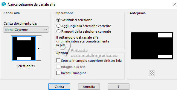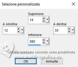 qui puoi trovare qualche risposta ai tuoi dubbi. Se l'argomento che ti interessa non è presente, ti prego di segnalarmelo. Questo tutorial è stato realizzato con PSP2019 e tradotto con PSPX9, PSP 2019 e PSP2020, ma può essere realizzato anche con le altre versioni di PSP. Dalla versione X4, il comando Immagine>Rifletti è stato sostituito con Immagine>Capovolgi in orizzontale, e il comando Immagine>Capovolgi con Immagine>Capovolgi in verticale. Nelle versioni X5 e X6, le funzioni sono state migliorate rendendo disponibile il menu Oggetti. Con la nuova versione X7, sono tornati Rifletti>Capovolgi, ma con nuove varianti. Vedi la scheda sull'argomento qui Grazie ai creatori dei tubes che mettono a disposizione il loro lavoro in vari gruppi di condivisione. Rispetta il lavoro degli autori, non cambiare il nome del file e non cancellare il watermark. traduzione francese qui traduzione inglese qui Le vostre versioni qui![]() Occorrente: Tube a scelta (i tubes usati da Inge-Lore non sono free) Il resto del materiale ![]() Per il tube del mio esempio grazie AigenbyCaz. (in questa pagina trovi i links ai siti dei creatori di tubes) ![]() in caso di dubbi, ricorda di consultare la mia sezione filtri qui Alien Skin Eye Candy 5 Impact - Glass qui ![]() non esitare a cambiare modalità di miscelatura e opacità secondo i colori utilizzati. Nelle ultime versioni di PSP non c'é il gradiente di primo piano/sfondo (Corel_06_029) Puoi usare i gradienti delle versioni precedenti. Trovi qui i gradienti Corel X. ![]() Apri la maschera in PSP e minimizzala con il resto del materiale. 1. Scegli dai tuoi tubes un colore chiaro e un colore scuro ![]() Dovrai alternare spesso il colore di primo piano con il colore bianco. Ti consiglio di assicurarti che i tuoi colori siano memorizzati in una tavolozza. Clicca su Aggiungi a Tavolozza e nella finestra che si apre clicca ok. (se stai usando una tavolozza già esistente, prendi nota del numero Campione. ![]() Per cominciare imposta il colore di primo piano con il colore bianco. ![]() Apri Alpha-Cheyenne Finestra>Duplica o sulla tastiera maiuscola+D per fare una copia. ![]() Chiudi l'originale. La copia, che sarà la base del tuo lavoro, non é vuota, ma contiene le selezioni salvate sul canale alfa. Selezione>Seleziona tutto. Apri l'immagine di sfondo 7f593i2 ![]() Modifica>Copia. Torna al tuo lavoro e vai a Modifica>Incolla nella selezione. Selezione>Deseleziona. Effetti>Effetti di immagine>Motivo unico, con i settaggi standard. ![]() Regola>Sfocatura>Sfocatura gaussiana - raggio 40. ![]() 2. Livelli>Nuovo livello raster. Riempi il livello con il colore bianco.Livelli>Nuovo livello maschera>Da immagine. Apri il menu sotto la finestra di origine e vedrai la lista dei files aperti. Seleziona la maschera 11325 ![]() Effetti>Effetti di bordo>Aumenta. Livelli>Unisci>Unisci gruppo. Selezione>Carica/Salva selezione>Carica selezione da canale alfa. La selezione Selection #1 é subito disponibile. Devi soltanto cliccare Carica. ![]() 3. Selezione>Modifica>Espandi - 3 pixels. Livelli>Nuovo livello raster. Riempi il livello con il colore bianco.Selezione>Modifica>Contrai - 3 pixels. Imposta il colore di primo piano con il colore chiaro. ![]() Passa il colore di primo piano a Gradiente di primo piano/sfondo, stile Lineare. ![]() Livelli>Nuovo livello raster. Riempi la selezione con il gradiente.Effetti>Plugins>Alien Skin Eye Candy 5 Impact - Glass. Glass Color: #acacac ![]() Selezione>Deseleziona. 4. Livelli>Duplica. Tasto K per attivare lo strumento Puntatore ![]() imposta Posizione X: 29,00 e Posizione Y: 588,00. ![]() Livelli>Unisci>Unisci giù. Effetti>Effetti 3D>Sfalsa ombra, colore nero. ![]() Selezione>Carica/Salva selezione>Carica selezione da canale alfa. Apri il menu delle selezioni e carica la selezione Selection #2 ![]() Livelli>Nuovo livello raster. Tasto destro del mouse sul colore di primo piano e imposta il colore di primo piano con il colore bianco. ![]() Riempi il livello con il colore bianco.5. Selezione>Modifica>Contrai - 3 pixels. Clicca nuovamente sulla palettina del colore di primo piano per impostare il colore chiaro, e apri il menu della paletta per impostare nuovamente il gradiente. ![]() Riempi la selezione con il gradiente.Effetti>Plugins>Alien Skin Eye Candy 5 Impact – Glass, con i settaggi precedenti. Selezione>Deseleziona. Attiva lo strumento Selezione ![]() (non importa il tipo di selezione impostato, perché con la selezione personalizzata si ottiene sempre un rettangolo) clicca sull'icona Selezione personalizzata ![]() e imposta i seguenti settaggi. ![]() Premi sulla tastiera il tasto CANC ![]() Selezione>Deseleziona. Effetti>Effetti 3D>Sfalsa ombra, con i settaggi precedenti. Selezione>Carica/Salva selezione>Carica selezione da canale alfa. Apri il menu delle selezioni e carica la selezione Selection #3 ![]() Livelli>Nuovo livello raster. Tasto destro del mouse sul colore di primo piano e imposta il colore di primo piano con il colore bianco. ![]() Riempi il livello con il colore bianco.6. Selezione>Modifica>Contrai - 3 pixels. Clicca nuovamente sulla palettina del colore di primo piano per impostare il colore chiaro, e apri il menu della paletta per impostare nuovamente il gradiente. ![]() Riempi la selezione con il gradiente.Effetti>Plugins>Alien Skin Eye Candy 5 Impact - Glass, con i settaggi precedenti. Selezione>Deseleziona. Effetti>Effetti 3D>Sfalsa ombra, con i settaggi precedenti. Selezione>Carica/Salva selezione>Carica selezione da canale alfa. Apri il menu delle selezioni e carica la selezione Selection #4 ![]() Livelli>Nuovo livello raster. Tasto destro del mouse sul colore di primo piano e imposta il colore di primo piano con il colore bianco. ![]() Riempi il livello con il colore bianco.7. Selezione>Modifica>Contrai - 3 pixels. Clicca nuovamente sulla palettina del colore di primo piano per impostare il colore chiaro, e apri il menu della paletta per impostare nuovamente il gradiente. ![]() Riempi la selezione con il gradien