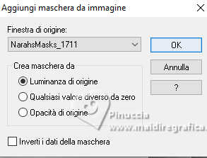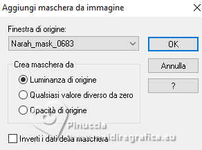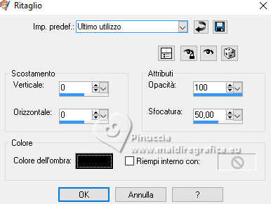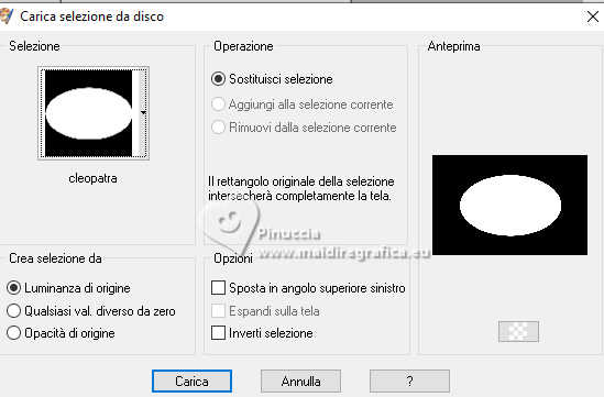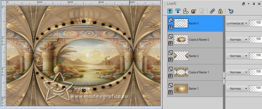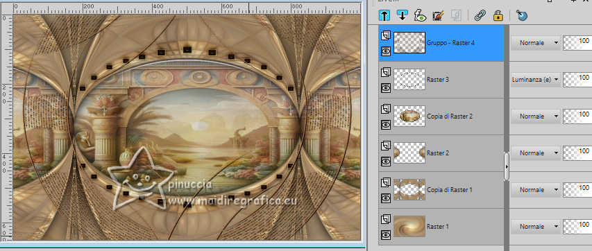 qui puoi trovare qualche risposta ai tuoi dubbi. Se l'argomento che ti interessa non è presente, ti prego di segnalarmelo. Questo tutorial è stato realizzato con PSP2019 e tradotto con PSPX9 e PSP2020, ma può essere realizzato anche con le altre versioni di PSP. Dalla versione X4, il comando Immagine>Rifletti è stato sostituito con Immagine>Capovolgi in orizzontale, e il comando Immagine>Capovolgi con Immagine>Capovolgi in verticale. Nelle versioni X5 e X6, le funzioni sono state migliorate rendendo disponibile il menu Oggetti. Con la nuova versione X7, sono tornati Rifletti>Capovolgi, ma con nuove varianti. Vedi la scheda sull'argomento qui Grazie ai creatori dei tubes che mettono a disposizione il loro lavoro in vari gruppi di condivisione. Rispetta il lavoro degli autori, non cambiare il nome del file e non cancellare il watermark. traduzione francese qui traduzione inglese qui Le vostre versioni qui![]() Occorrente: Tube a scelta (il tube usato da Inge-Lore sono sotto licenza) Il resto del materiale ![]() Per il mio esempio ho usato un tube di Catty (dallo Scrap Adventures of Egypt) (in questa pagina trovi i links ai siti dei creatori di tubes) ![]() in caso di dubbi, ricorda di consultare la mia sezione filtri qui Mura's Meister - Perspective Tiling qui Mehdi - Sorting Tiles qui Alien Skin Eye Candy 5 Impact - Glass qui AAA Frames - Foto Frame qui ![]() non esitare a cambiare modalità di miscelatura e opacità secondo i colori utilizzati. ![]() Metti la selezione nella cartella Selezioni. Apri le maschere in PSP e minimizzale con il resto del materiale. Scegli tre colori dal tuo tube. ![]() 1. Apri una nuova immagine trasparente 1000 x 650 pixels. Selezione>Seleziona tutto. Apri l'immagine di sfondo 01 ![]() Modifica>Copia. Torna al tuo lavoro e vai a Modifica>Incolla nella selezione. Selezione>Deseleziona. Regola>Sfocatura>Sfocatura radiale. ![]() Livelli>Duplica. 2. Effetti>Plugins>Mehdi - Sorting Tiles. ![]() Effetti>Plugins>Mura's Meister - Perspective Tiling. ![]() Livelli>Duplica. Immagine>Rifletti>Rifletti verticalmente (Immagine>Capovolgi). Livelli>Unisci>Unisci giù. Effetti>Effetti geometrici>Cerchio. ![]() Selezione>Carica/Salva selezione>Carica selezione da disco. Cerca e carica la selezione cleopatra ![]() 3. Livelli>Nuovo livello raster. Modifica>Incolla nella selezione (l'immagine di sfondo è sempre in memoria). Livelli>Nuovo livello raster. Effetti>Effetti 3D>Ritaglio. ![]() Effetti>Plugins>Alien Skin Eye Candy 5 Impact - Glass. ![]() Selezione>Deseleziona. Livelli>Unisci>Unisci giù. 4. Livelli>Duplica. Attiva il livello sottostante dell'originale. Tasto K per attivare lo strumento Puntatore ![]() e imposta Posizione X: -484,00 e Posizione Y: 122,00. ![]() ![]() Livelli>Duplica. Immagine>Rifletti>Rifletti orizzontalmente (Immagine>Rifletti) Livelli>Unisci>Unisci giù. Attiva il livello sottostante. Effetti>Effetti 3D>Sfalsa ombra, colore nero. ![]() Attiva nuovamente il livello superiore. 5. Apri deco-1 ![]() Modifica>Copia. Torna al tuo lavoro e vai a Modifica>Incolla come nuovo livello. Cambia la modalità di miscelatura di questo livello in Luminanza (esistente). ![]() Livelli>Nuovo livello raster. Imposta il colore di primo piano con il colore 3 ![]() Riempi il livello con il colore di primo piano.Livelli>Nuovo livello maschera>Da immagine. Apri il menu sotto la finestra di origine e vedrai la lista dei files aperti. Seleziona la maschera NarahsMasks_1711 ![]() Effetti>Effetti di bordo>Aumenta di più. Livelli>Unisci>Unisci gruppo. Effetti>Effetti 3D>Sfalsa ombra, colore nero. ![]() ![]() 6. Per i bordi imposta il colore di primo piano con il colore chiaro, e il colore di sfondo con il colore scuro. ![]() Immagine>Aggiungi bordatura, 2 pixel, simmetriche, colore scuro. Selezione>Seleziona tutto. Modifica>Copia Immagine>Aggiungi bordatura, 45 pixels, simmetriche, colore chiaro. Selezione>Inverti. Modifica>Incolla nella selezione Regola>Sfocatura>Sfocatura gaussiana - raggio 20. ![]() Livelli>Nuovo livello raster. Riempi il livello con il colore chiaro.7. Livelli>Nuovo livello maschera>Da immagine. Apri il menu sotto la finestra di origine e seleziona la maschera Narah_Masks_0683 ![]() Effetti>Effetti di bordo>Aumenta di più. Livelli>Unisci>Unisci gruppo. Selezione>Inverti. Effetti>Effetti 3D>Sfalsa ombra, colore nero. ![]() Selezione>Deseleziona. Livelli>Unisci>Unisci giù. 8. Effetti>Plugins>AAA Frames - Foto Frame. ![]() Attiva lo strumento Bacchetta magica ![]() e clicca nel bordo bianco per selezionarlo. Non esitare a ingrandire bene l'immagine per vedere meglio.![]() Riempi la selezione con il colore chiaro.Selezione>Deseleziona. Apri il tube del personaggio e vai a Modifica>Copia. Torna al tuo lavoro e vai a Modifica>Incolla come nuovo livello. Immagine>Ridimensiona, secondo il tube, tutti i livelli non selezionato. Regola>Messa a fuoco>Metti a fuoco. Effetti>Effetti 3D>Sfalsa ombra, colore nero. ![]() 9. Apri il tube accessorio dbs=Egyptian Nights-Element-23 ![]() Modifica>Copia. Torna al tuo lavoro e vai a Modifica>Incolla come nuovo livello. Immagine>Ridimensiona, secondo il tube, tutti i livelli non selezionato. Regola>Messa a fuoco>Metti a fuoco. Effetti>Effetti 3D>Sfalsa ombra, colore nero. ![]() Firma il tuo lavoro su un nuovo livello. Livelli>Unisci>Unisci tutto e salva in formato jpg. Per il tube di questo esempio grazie Colybrix. ![]() ![]() Se hai problemi o dubbi, o trovi un link non funzionante, o anche soltanto per un saluto, scrivimi. |