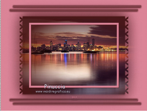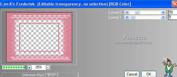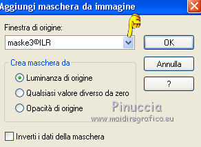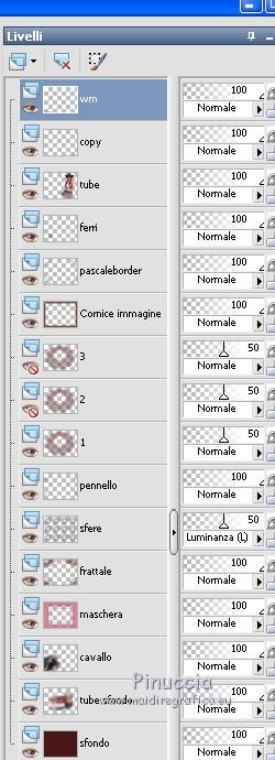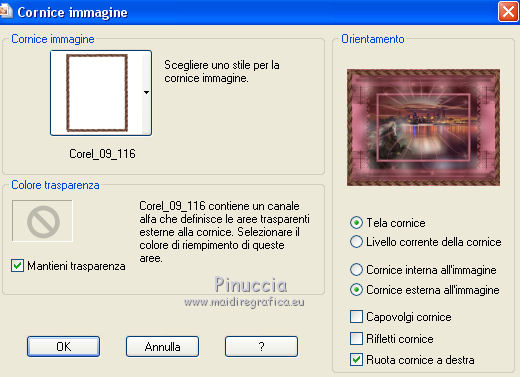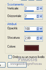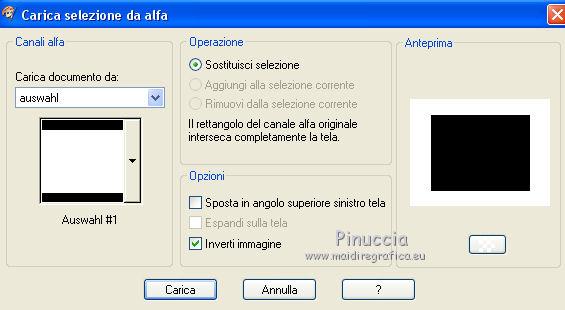 qui puoi trovare qualche risposta ai tuoi dubbi. Se l'argomento che ti interessa non è presente, ti prego di segnalarmelo. Questo tutorial è stato creato con PSP X5, ma può essere eseguito anche con le altre versioni di PSP. Per tradurlo, ho usato PSP X. Se stai usando le nuove versioni di PSP, a proposito delle funzioni Rifletti/Capovolgi, vedi la mia scheda qui Grazie ai creatori dei tubes che mettono a disposizione il loro lavoro in vari gruppi di condivisione. Rispetta il lavoro degli autori, non cambiare il nome del file e non cancellare il watermark. Occorrente: Tubes a scelta: un paesaggio, e un personaggio. Il resto del materiale qui Per il tube grazie Moni S Per il frattale grazie Bärbel e Ami Filtri: L&K's - L&k's Frederiek qui Alien Skin Xenofex 2.0 - Constellation qui Xero - Improver qui Animation Shop qui Metti la cornice-immagine Corel_09_116 nella cartella Cornici-immagine. Apri la maschera in PSP e minimizzala con il resto del materiale. 1. Scegli due colori dai tuoi tubes. Imposta il colore di primo piano con il colore chiaro, e il colore di sfondo con il colore scuro. I miei colori. ![]() Apri Auswahl. Questa immagine, che sarà la base del tuo lavoro, non è vuota, ma contiene una selezione salvata sul canale alfa. Riempi l'immagine trasparente con il colore di sfondo.Livelli>Nuovo livello raster. Riempi con il colore di primo piano.Livelli>Nuovo livello maschera>Da immagine. Apri il menu sotto la finestra di origine e vedrai la lista dei files aperti. Seleziona la maschera maske3©ILR, con i seguenti settaggi. ![]() Livelli>Unisci>Unisci gruppo. Effetti>Plugins>L&K's - L&K's Frederiek. ![]() Effetti>Effetti 3D>Sfalsa ombra, con un colore molto scuro scelto dal tuo lavoro. ![]() 2. Apri il tube del paesaggio e vai a Modifica>Copia. Torna al tuo lavoro e vai a Modifica>Incolla come nuovo livello. Livelli>Disponi>Sposta gių (sotto il livello della maschera). ![]() Selezione>Carica/Salva selezione>Carica selezione da canale alfa. La selezione Auswahl#1 è subito disponibile. Seleziona Inverti immagine (cosė non dovrai farlo dopo) e Carica. ![]() Premi sulla tastiera il tasto CANC ![]() Selezione>Deseleziona. Apri "Nov Series Horses" e vai a Modifica>Copia. Torna al tuo lavoro e vai a Modifica>Incolla come nuovo livello. Sposta il tube in basso a sinistra.![]() 3. Attiva il livello superiore. Apri "Apophysis" e vai a Modifica>Copia. Torna al tuo lavoro e vai a Modifica>Incolla come nuovo livello. Effetti>Effetti di bordo>Aumenta. Livelli>Nuovo livello raster. Selezione>Seleziona tutto. Apri "decobulles" e vai a Modifica>Copia. Torna al tuo lavoro e vai a Modifica>Incolla nella selezione. Selezione>Deseleziona. Cambia la modalità di miscelatura di questo livello in Luminanza (esistente), e abbassa l'opacità al 50%. 4. Apri il pennello "vcbrush40_001". File>Esporta>Pennello personalizzato, assegna un nome al pennello e ok. Attiva lo strumento Pennello ![]() cerca e seleziona il pennello che hai appena esportato e applicalo in alto a sinistra, cliccando con il tasto destro del mouse, per usare il colore scuro di sfondo. ![]() Livelli>Duplica. Immagine>Capovolgi. Livelli>Unisci>Unisci gių. Livelli>Duplica. Immagine>Rifletti. Livelli>Unisci>Unisci gių. Effetti>Effetti 3D>Sfalsa ombra. ![]() Apri "blume" e vai a Modifica>Copia. Torna al tuo lavoro e vai a Modifica>Incolla come nuovo livello. Abbassa l'opacità di questo livello al 50%. 5. Immagine>Cornice-immagine- seleziona la cornice Corel_09_116, con i seguenti settaggi. ![]() Effetti>Effetti 3D>Sfalsa ombra. ![]() Ripeti l'Effetto Sfalsa ombra, cambiando verticale e orizzontale con -10. Livelli>Nuovo livello raster. Selezione>Seleziona tutto. Apri "Pascale_borders" e vai a Modifica>Copia. Torna al tuo lavoro e vai a Modifica>Incolla nella selezione. Selezione>Deseleziona. Effetti>Plugins>Xero - Improver. ![]() Effetti>Effetti 3D>Sfalsa ombra. ![]() 6. Apri "cowgirl horsesshoes" e vai a Modifica>Copia. Torna al tuo lavoro e vai a Modifica>Incolla come nuovo livello. Sposta il tube in basso a sinistra.Effetti>Effetti 3D>Sfalsa ombra. ![]() Apri il tuo tube e vai a Modifica>Copia. Torna al tuo lavoro e vai a Modifica>Incolla come nuovo livello. Immagine>Ridimensiona, se e quanto necessario, tutti i livelli non selezionato Posiziona il tube a destra.Effetti>Pluigins>Xero - Improver, con i settaggi precedenti. Effetti>Effetti 3D>Sfalsa ombra. ![]() Aggiungi il tuo nome e/o il tuo watermark su un nuovo livello, senza dimenticare eventuali copyright delle immagini usate. 7. Attiva il livello del fiore e rinomina il livello "1". Livelli>Duplica, e rinomina il livello "2". Livelli>Duplica, e rinomina il livello "3". Rimani posizionato sul livello "3". Effetti>Plugins>Alien Skin Xenofex 2.0 - Constellation. ![]() Regola>Aggiungi/Rimuovi disturbo>Aggiungi disturbo. ![]() Chiudi questo livello e attiva il livello "2". Effetti>Plugins>Alien Skin Xenofex 2.0 - Constellation, clicca su Random Seed e ok. Regola>Aggiungi/Rimuovi disturbo>Aggiungi disturbo, cambia il disturbo con 35. Chiudi questo livello e attiva il livello "1". Effetti>Plugins>Alien Skin Xenofex 2.0 - Constellation, clicca su Random Seed e ok. Regola>Aggiungi/Rimuovi disturbo>Aggiungi disturbo, cambia il disturbo con 40. Lascia il livello visibile. ![]() Modifica>Copia Unione. Apri Animation Shop e vai a Modifica>incolla>Incolla come nuova animazione. Torna in PSP. Chiudi il livello "1" e apri il livello "2". Modifica>Copia Unione. In Animation Shop Modifica>Incolla>Incolla dopo il fotogramma corrente. In PSP. Chiudi il livello "2" e apri il livello "3". Modifica>Copia Unione. In Animation Shop Modifica>Incolla>Incolla dopo il fotogramma corrente. In PSP. Chiudi il livello "3" e apri il livello "4". Modifica>Copia Unione. In Animation Shop Modifica>Incolla>Incolla dopo il fotogramma corrente. In PSP. Chiudi il livello "4" e apri il livello "5". Modifica>Copia Unione. In Animation Shop Modifica>Incolla>Incolla dopo il fotogramma corrente. Controlla il risultato cli