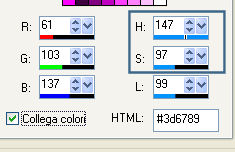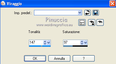 qui puoi trovare qualche risposta ai tuoi dubbi. Se l'argomento che ti interessa non è presente, ti prego di segnalarmelo. Questo tutorial è stato creato con PSP X2, ma può essere eseguito anche con le altre versioni di PSP. Per tradurlo, ho usato PSP X. Il materiale viene da vari gruppi di condivisione. Il copyright appartiene ai rispettivi autori. Grazie ai creatori dei tubes che mettono a disposizione il loro lavoro in vari gruppi di condivisione. Rispetta il lavoro degli autori, non cambiare il nome del file e non cancellare il watermark. Occorrente: Un tube a scelta. Il resto del materiale qui Per il poser grazie Bigi Per il frattale grazie Bärbel Filtri Xero - Improver qui Animation Shop qui 1. Scegli due colori dal tuo tube. Imposta il colore di primo piano con il colore chiaro, e il colore di sfondo con il colore scuro. Apri una nuova immagine trasparente 800 x 600 pixels, e riempila con il colore di sfondo.Apri "fraktal-202-bd-28-4-11" e vai a Modifica>Copia. Torna al tuo lavoro e vai a Modifica>Incolla come nuovo livello. Premi il tasto K per attivare lo strumento Puntatore ![]() se stai usando PSP 9 il tasto D (valido per tutte le versioni) per attivare lo strumento Deformazione ![]() in modalità Scala, spingi i nodi laterali fino ai bordi. ![]() ![]() Prendi nota dei valori di Tonalità (H) e saturazione (S) del tuo colore di sfondo ![]() Regola>Tonalità e saturazione>Viraggio, trascrivi i valori annotati nelle rispettiva caselle. ![]() 2. Apri "fraktale-101-bd-2-5-11" e vai a Modifica>Copia. Torna al tuo lavoro e vai a Modifica>Incolla come nuovo livello. Regola>Tonalità e saturazione>Viraggio, con i settaggi precedenti. Apri "fraktale-116-bd-18-7-11" e vai a Modifica>Copia. Torna al tuo lavoro e vai a Modifica>Incolla come nuovo livello. Regola>Tonalità e saturazione>Viraggio, con i settaggi precedenti. Spostalo in alto a sinistra.![]() Livelli>Duplica. Immagine>Rifletti. Livelli>Unisci>Unisci giù. Apri "Apo3D-bild-140-bd-15-2-12" e vai a Modifica>Copia. Torna al tuo lavoro e vai a Modifica>Incolla come nuovo livello. Regola>Tonalità e saturazione>Viraggio, con i settaggi precedenti. Spostalo al centro, come nell'esempio.![]() Apri il tuo tube e vai a Modifica>Copia. Torna al tuo lavoro e vai a Modifica>Incolla come nuovo livello. Immagine>Ridimensiona, se e quanto necessario. Sposta il tube a destra, o dove preferisci.Effetti>Plugins>Xero - Improver. ![]() Effetti>Effetti 3D>Sfalsa ombra. ![]() Selezione>Seleziona tutto. Copia. Torna al tuo lavoro e vai a Modifica>Incolla nella selezione. Selezione>Deseleziona. Regola>Tonalità e saturazione>Viraggio, con i settaggi precedenti. Effetti>Effetti 3D>Sfalsa ombra, con i settaggi precedenti. Aggiungi il tuo nome e/o il tuo copyright su un nuovo livello, senza dimenticare il copyright delle immagini usate. 3. Unisci i livelli del copyright, della firma e della cornice. Modifica>Copia Unione. Apri Animation Shop e vai a Modifica>Incolla>Incolla come nuova animazione. Modifica>Duplica, e ripeti finchè non avrai 11 fotogrammi, Clicca sul primo fotogramma per selezionarlo e vai a Modifica>Seleziona tutto. Apri l'animazione "kosmos", anche questa composta da 11 fotogrammi. Modifica>Seleziona tutto. Modifica>Copia. Attiva il tuo lavoro e vai a Modifica>Incolla>Incolla nel fotogramma selezionato. Posiziona l'animazione nell'angolo in alto a sinistra. 4. Torna in PSP. Apri e attiva il livello della cornice, con firma e copyright. Modifica>Copia. Torna in Animation Shop e vai a Modifica>Incolla>Incolla come nuova animazione. Modifica>Duplica, finchè non avrai 11 fotogrammi. Modifica>Seleziona tutto. Modifica>Copia. Attiva il tuo lavoro e vai a Modifica>Incolla>Incolla nel fotogramma selezionato. Posiziona l'immagine esattamente al centro facendo coincidere il bordo con i limiti del tuo lavoro. In caso di errore, vai a Modifica>Annulla Incolla e ripeti. Quando hai fatto, controlla il risultato cliccando su Visualizza e salva in formato gif.![]() Se hai problemi o dubbi, o trovi un link non funzionante, o anche soltanto per dirmi che ti è piaciuto, 12 Settembre 2012 |