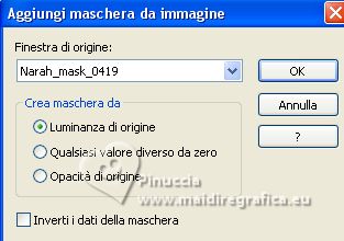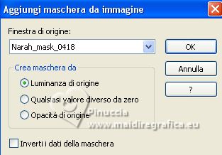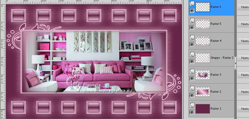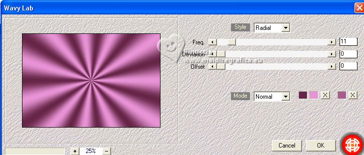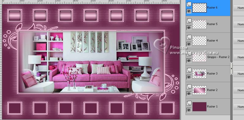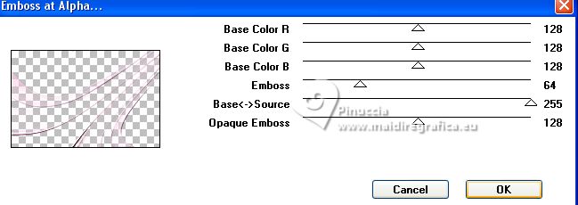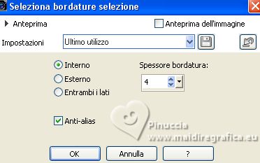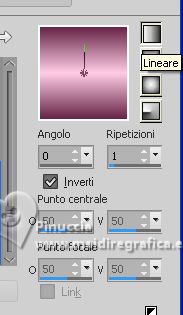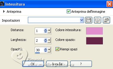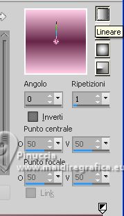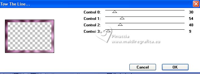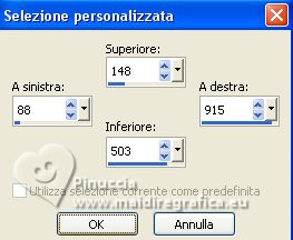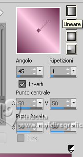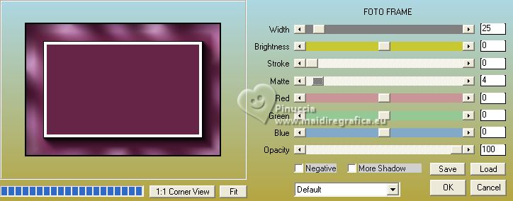 qui puoi trovare qualche risposta ai tuoi dubbi. Se l'argomento che ti interessa non è presente, ti prego di segnalarmelo. Questo tutorial è stato realizzato con PSP2019 e tradotto con PSPX7, ma può essere realizzato anche con le altre versioni di PSP. Dalla versione X4, il comando Immagine>Rifletti è stato sostituito con Immagine>Capovolgi in orizzontale, e il comando Immagine>Capovolgi con Immagine>Capovolgi in verticale. Nelle versioni X5 e X6, le funzioni sono state migliorate rendendo disponibile il menu Oggetti. Con la nuova versione X7, sono tornati Rifletti>Capovolgi, ma con nuove varianti. Vedi la scheda sull'argomento qui Grazie ai creatori dei tubes che mettono a disposizione il loro lavoro in vari gruppi di condivisione. Rispetta il lavoro degli autori, non cambiare il nome del file e non cancellare il watermark. traduzione francese qui traduzione inglese qui Le vostre versioni qui![]() Occorrente: Un tube a scelta (il tube usato da Inge-Lore è sotto licenza) Il resto del materiale qui Grazie per il tube del paesaggio Azalée e per due maschere Narah. Per il tube utilizzato per la mia traduzione grazie Luz Cristina. (in questa pagina trovi i links ai siti dei creatori di tubes) Filtri: in caso di dubbi, ricorda di consultare la mia sezione filtri qui Filters Unlimited 2.0 qui Mehdi - Wavy Lab qui Mura's Seamless - Emboss at Alpha qui Tramages - Tow the line qui Alien Skin Eye Candy 5 Impact - Glass qui AAA Frames - Foto Frame qui I filtri Mura's Seamless e Tramages si possono usare da soli o importati in Filters Unlimited (come fare vedi qui) Se un filtro fornito appare con questa icona Animation Shop qui ![]() non esitare a cambiare modalità di miscelatura e opacità secondo i colori utilizzati. Nelle ultime versioni di PSP non c'é il gradiente di primo piano/sfondo (Corel_06_029) Puoi usare i gradienti delle versioni precedenti. Trovi qui i gradienti Corel X. ![]() Metti la selezione nella cartella Selezioni. Apri le maschere in PSP e minimizzale con il resto del materiale. 1. Scegli 3 colori dai tuoi tubes ![]() Imposta il colore di primo piano con il colore 3 #fdcde5, e il colore di sfondo con il colore 2 #662547. ![]() Apri una nuova immagine trasparente 1000 x 650 pixels. Riempi l'immagine trasparente con il colore di sfondo (colore 2) #662547.Livelli>Nuovo livello raster. Riempi il livello con il colore di primo piano (colore 3) #fdcde5.Livelli>Nuovo livello maschera>Da immagine. Apri il menu sotto la finestra di origine e vedrai la lista dei files aperti. Seleziona la maschera 2bitMask_15 ![]() Effetti>Effetti di bordo>Aumenta. Livelli>Unisci>Unisci gruppo. 2. Attiva lo strumento Selezione ![]() (non importa il tipo di selezione impostato, perché con la selezione personalizzata si ottiene sempre un rettangolo) clicca sull'icona Selezione personalizzata ![]() e imposta i seguenti settaggi. ![]() Livelli>Nuovo livello raster. Livelli>Disponi>Sposta giù. Passa il colore di primo piano a Gradiente di primo piano/sfondo, stile Lineare. ![]() Riempi la selezione con il gradiente.Apri il tuo tube di sfondo pays-285-Azalee ![]() Cancella il watermark e vai a Modifica>Copia. Torna al tuo lavoro e vai a Modifica>Incolla come nuovo livello. Immagine>Ridimensiona, se necessario, tutti i livelli non selezionato. Regola>Messa a fuoco>Metti a fuoco. Selezione>Inverti. Premi sulla tastiera il tasto CANC ![]() Selezione>Inverti. Selezione>Modifica>Contrai - 5 pixels. Attiva il livello superiore. Effetti>Plugins>Alien Skin Eye Candy 5 Impact - Glass. Seleziona il preset Clear e ok. ![]() Selezione>Deseleziona. 3. Selezione>Carica/Salva selezione>Carica selezione da disco. Cerca e carica la selezione Cynthia ![]() Cambia i settaggi del gradiente ![]() Livelli>Nuovo livello raster. Riempi la selezione con il gradiente.Livelli>Nuovo livello raster. Inverti i colori del gradiente. ![]() Riempi la selezione con il gradiente.Livelli>Nuovo livello raster. Effetti>Plugins>Alien Skin Eye Candy 5 Impact - Glass - preset Clear. ![]() Selezione>Deseleziona. ![]() 4. Attiva il livello Raster 4. Livelli>Duplica. Immagine>Capovolgi. Livelli>Unisci>Unisci giù. Attiva il livello Raster 5. Livelli>Duplica. Immagine>Capovolgi. Livelli>Unisci>Unisci giù. Attiva il livello Raster 6. Livelli>Duplica. Tasto K per attivare lo strumento Puntatore ![]() e imposta Posizione x: 31,00 e Posizione Y: 552,00. ![]() Livelli>Unisci>Unisci giù. ![]() 5. Attiva il livello Raster 1. Effetti>Effetti di trama>Intessitura colore intessitura: colore chiaro di primo piano (colore 3) colore spazio: colore scuro di sfondo (colore 2). ![]() Livelli>Nuovo livello raster. Passa il colore di primo piano a Colore. Riempi il livello con il colore di primo piano (colore 3).Livelli>Nuovo livello maschera>Da immagine. Apri il menu sotto la finestra di origine e seleziona la maschera Narah_mask_0419 ![]() Effetti>Effetti di bordo>Aumenta. Livelli>Unisci>Unisci gruppo. Effetti>Plugins>Mura's Seamless - Emboss at Alpha, con i settaggi standard. ![]() 6. Attiva il livello superiore. Imposta il colore di primo piano con il colore 1 #e893d6 ![]() Livelli>Nuovo livello raster. Riempi il livello con il colore di primo piano (colore 1).Livelli>Nuovo livello maschera>Da immagine. Apri il menu sotto la finestra di origine e seleziona la maschera Narah_mask_0418 ![]() Effetti>Effetti di bordo>Aumenta. Livelli>Unisci>Unisci gruppo. Livelli>Duplica. Immagine>Rifletti. Livelli>Unisci>Unisci giù. Effetti>Plugins>Mura's Seamless - Emboss at Alpha, con i settaggi standard. Tasto K per attivare lo strumento Puntatore ![]() e imposta Posizione x: 270,00 e Posizione Y: 115,00. ![]() Livelli>Duplica. Immagine>Rifletti. Livelli>Unisci>Unisci giù. Effetti>Effetti 3D>Sfalsa ombra. ![]() 7. Attiva il livello Raster 1. Selezione>Seleziona tutto. Immagine>Dimensioni tela - 1100 x 750 pixels. ![]() Selezione>Inverti. Livelli>Nuovo livello raster. Effetti>Plugins>Mehdi - Wavy Lab ![]() Effetti>Plugins>Tramages - Tow the line. ![]() Livelli>Unisci>Unisc