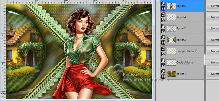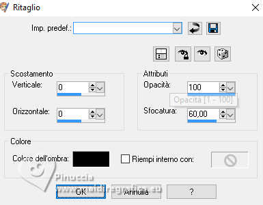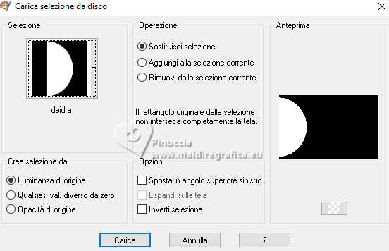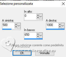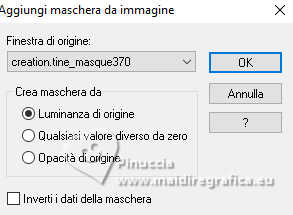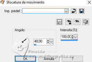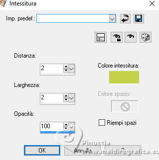 qui puoi trovare qualche risposta ai tuoi dubbi. Se l'argomento che ti interessa non è presente, ti prego di segnalarmelo. Questo tutorial è stato realizzato con PSP2019 e tradotto con PSPX9 e PSP2020, ma può essere realizzato anche con le altre versioni di PSP. Dalla versione X4, il comando Immagine>Rifletti è stato sostituito con Immagine>Capovolgi in orizzontale, e il comando Immagine>Capovolgi con Immagine>Capovolgi in verticale. Nelle versioni X5 e X6, le funzioni sono state migliorate rendendo disponibile il menu Oggetti. Con la nuova versione X7, sono tornati Rifletti>Capovolgi, ma con nuove varianti. Vedi la scheda sull'argomento qui Grazie ai creatori dei tubes che mettono a disposizione il loro lavoro in vari gruppi di condivisione. Rispetta il lavoro degli autori, non cambiare il nome del file e non cancellare il watermark. traduzione francese qui traduzione inglese qui Le vostre versioni qui![]() Occorrente: Tubes a scelta (i tubes usati da Inge-Lore sono sotto licenza) Il resto del materiale ![]() Per il mio esempio ho usato tubes di Adrienne. (in questa pagina trovi i links ai siti dei creatori di tubes) ![]() in caso di dubbi, ricorda di consultare la mia sezione filtri qui Filters Unlimited 2.0 qui FM Tile Tools - Saturation Emboss qui Mehdi - Sorting Tiles qui Alien Skin Eye Candy 5 Impact - Glass qui Simple - Top Left Mirror qui I filtri Simple si possono usare da soli o importati in Filters Unlimited (come fare vedi qui) Se un filtro fornito appare con questa icona ![]() non esitare a cambiare modalità di miscelatura e opacità secondo i colori utilizzati. Nelle ultime versioni di PSP non c'é il gradiente di primo piano/sfondo (Corel_06_029) Puoi usare i gradienti delle versioni precedenti. Trovi qui i gradienti Corel X. ![]() Metti la selezione nella cartella Selezioni. Apri la maschera in PSP e minizzala con il resto del materiale. 1. Scegli dai tuoi tubes un colore chiaro e un colore scuro. Imposta il colore di primo piano con il colore chiaro, e il colore di sfondo con il colore scuro. ![]() Passa il colore di primo piano a Gradiente di primo piano/sfondo, stile Sprazzo di luce. ![]() Apri una nuova immagine trasparente 1000 x 650 pixels. Riempi l'immagine trasparente con il gradiente.Selezione>Seleziona tutto. Apri il tuo tube di sfondo e vai a Modifica>Copia. Torna al tuo lavoro e vai a Modifica>Incolla nella selezione. Selezione>Deseleziona. Effetti>Effetti di immagine>Motivo unico, con i settaggi standard. ![]() Regola>Sfocatura>Sfocatura da movimento. ![]() Modifica>Ripeti Sfocatura da movimento. Livelli>Duplica. Immagine>Rifletti>Rifletti orizzontalmente (Immagine>Rifletti) 2. Effetti>Plugins>Mehdi - Sorting Tiles. ![]() Effetti>Plugins>Simple - Top Left Mirror. ![]() Effetti>Effetti di bordo>Aumenta. Effetti>Plugins>FM Tile Tools - Saturation Emboss, con i settaggi standard. ![]() Effetti>Plugins>Mura's Meister - Perspective Tiling. ![]() 3. Livelli>Nuovo livello raster. Passa il colore di primo piano a Colore. Riempi con il colore chiaro.Livelli>Nuovo livello maschera>Da immagine. Apri il menu sotto la finestra di origine e vedrai la lista dei files aperti. Seleziona la maschera creation.tine_masque370 ![]() Effetti>Effetti di bordo>Aumenta di più. Livelli>Unisci>Unisci gruppo. Attiva lo strumento Selezione ![]() (non importa il tipo di selezione impostato, perché con la selezione personalizzata si ottiene sempre un rettangolo) clicca sull'icona Selezione personalizzata ![]() e imposta i seguenti settaggi. ![]() Premi sulla tastiera il tasto CANC ![]() Selezione>Deseleziona. Livelli>Duplica. Immagine>Rifletti>Rifletti orizzontalmente (Immagine>Rifletti) Livelli>Unisci>Unisci giù. 4. Selezione>Carica/Salva selezione>Carica selezione da disco. Cerca e carica la selezione deidra ![]() Livelli>Nuovo livello raster. Riempi con il colore scuro o con il colore chiaro, come preferisci.Selezione>Modifica>Contrai - 10 pixels. Effetti>Effetti di trama>Intessitura. Colore intessitura: colore di primo piano ![]() Modifica>Incolla come nuovo livello (il tube di sfondo è sempre in memoria). Immagine>Ridimensiona, se necessario, tutti i livelli non selezionato. Posiziona correttamente il tube nella selezione.Selezione>Inverti. Premi sulla tastiera il tasto CANC .Selezione>Inverti. 5. Livelli>Nuovo livello raster. Effetti>Effetti 3D>Ritaglio. ![]() Effetti>Plugins>Alien Skin Eye Candy 5 Impact - Glass. ![]() Selezione>Deseleziona. Livelli>Unisci>Unisci giù - 2 volte. Livelli>Duplica. Immagine>Rifletti>Rifletti orizzontalmente (Immagine>Rifletti) Livelli>Unisci>Unisci giù. Effetti>Effetti 3D>Sfalsa ombra, colore nero. ![]() Apri Deco 1 ![]() Modifica>Copia. Torna al tuo lavoro e vai a Modifica>Incolla come nuovo livello. Effetti>Effetti 3D>Sfalsa ombra, colore nero. ![]() 6. Apri Deco 2 ![]() Modifica>Copia. Torna al tuo lavoro e vai a Modifica>Incolla come nuovo livello. Effetti>Effetti 3D>Sfalsa ombra, colore nero. ![]() Apri il tube principale e vai a Modifica>Copia. Torna al tuo lavoro e vai a Modifica>Incolla come nuovo livello. Immagine>Ridimensiona, se necessario, tutti i livelli non selezionato. Regola>Messa a fuoco>Metti a fuoco. Effetti>Effetti 3D>Sfalsa ombra, colore nero. ![]() ![]() 7. Immagine>Aggiungi bordatura, 2 pixels, simmetriche, colore chiaro. Immagine>Aggiungi bordatura, 45 pixels, simmetriche, colore scuro. Apri Deco 3 ![]() Modifica>Copia. Torna al tuo lavoro e vai a Modifica>Incolla come nuovo livello. Cambia la modalità di miscelatura di questo livello in Luminanza (esistente). 8. Firma il tuo lavoro su un nuovo livello. Immagine>Aggiungi bordatura, 3 pixels, simmetriche, colore chiaro. Salva in formato jpg. Per i tubes di questo esempio grazie Adrienne. ![]() ![]() Se hai problemi o dubbi, o trovi un link non funzionante, o anche soltanto per un saluto, scrivimi. |