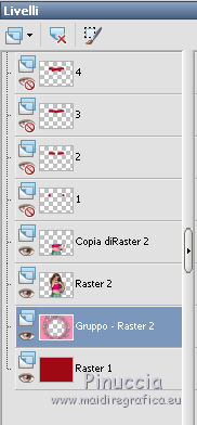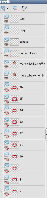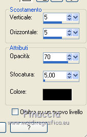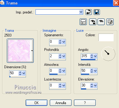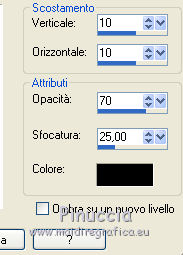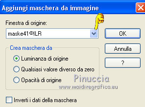 qui puoi trovare qualche risposta ai tuoi dubbi. Se l'argomento che ti interessa non è presente, ti prego di segnalarmelo. Questo tutorial è stato creato con PSP X5, ma può essere eseguito anche con le altre versioni di PSP. Per tradurlo, ho usato PSP X. Se stai usando le nuove versioni di PSP, a proposito delle funzioni Rifletti/Capovolgi, vedi la mia scheda qui Grazie ai creatori dei tubes che mettono a disposizione il loro lavoro in vari gruppi di condivisione. Rispetta il lavoro degli autori, non cambiare il nome del file e non cancellare il watermark. Occorrente: Un tube a scelta. Il resto del materiale qui Per il mio esempio ho usato un tube free di Verymany. Filtri: Xero - Improver qui Animation Shop qui Il materiale fornito può essere colorizzato. Prendi nota dei valori di Tonalità (H) e Saturazione (S) del colore scelto, Regola>Tonalità e Saturazione>Viraggio, e trascrivi i valori annotati nelle rispettive caselle. ![]() Se il risultato visibile nella finestra di anteprima non ti soddisfa, puoi giocare con il valore di Saturazione. ***** Metti la trama "2503" nella cartella Trame. Apri la maschera in PSP e minimizzala con il resto del materiale. Scegli due colori dal tuo tube e imposta il colore di primo piano con il colore chiaro, e il colore di sfondo con il colore scuro. Apri "Pfeilanimation_ILR". L'immagine, che sarà la base del tuo lavoro, contiene l'animazione composta da 16 livelli chiusi, e un livello di sfondo trasparente. Lascia i livelli chiusi e attiva il livello inferiore Raster 1. Riempi il livello con il colore di sfondo.Effetti>Effetti di trama>Trama - seleziona la trama "2503", con i seguenti settaggi. ![]() 2. Livelli>Nuovo livello raster. Riempi il livello con il colore di primo piano.Livelli>Nuovo livello maschera>Da immagine. Apri il menu sotto la finestra di origine e vedrai la lista dei files aperti. Seleziona la maschera maske41©ILR, con i seguenti settaggi. ![]() Livelli>Unisci>Unisci gruppo. Effetti>Effetti 3D>Sfalsa ombra. ![]() Ripeti l'Effetto Sfalsa ombra, cambiando verticale e orizzontale con -5. 3. Apri il tuo tube e vai a Modifica>Copia. Torna al tuo lavoro e vai a Modifica>Incolla come nuovo livello. Immagine>Ridimensiona, se e quanto necessario, tutti i livelli non selezionato. Posiziona il tube al centro.Livelli>Duplica, e cambia la modalità di miscelatura di questo livello in Luce diffusa. Effetti>Plugins>Xero - Improver. ![]() Attiva il livello sottostante dell'originale. Effetti>Effetti 3D>Sfalsa ombra. ![]() Ripeti l'Effetto Sfalsa ombra, cambiando verticale e orizzontale con -10. 4. Attiva il livello della copia. Attiva lo strumento Selezione , rettangolo,e traccia una selezione intorno al tube. ![]() questa selezione è importante per la riuscita dell'animazione, eventualmente, apri momenteamente l'ultimo livello dell'animazione (Raster 16), per controllare che il tube si trovi all'interno. ![]() Modifica>Taglia (il comando, oltre a tagliare, tiene anche in memoria). Livelli>Nuovo livello raster. Livelli>Disponi>Porta in alto. Modifica>Incolla nella selezione. Selezione>Deseleziona. La modalità di miscelatura di questo livello deve essere Normale. Livelli>Duplica, e cambia la modalità di miscelatura di questo livello in Luce diffusa. 5. Attiva il livello della maschera. ![]() Apri "fantasy2228" e vai a Modifica>Copia. Torna al tuo lavoro e vai a Modifica>Incolla come nuovo livello. Apri "donnak_accent2012" e vai a Modifica>Copia. Torna al tuo lavoro e vai a Modifica>Incolla come nuovo livello. Sposta l'elemento un po' più in alto.Effetti>Effetti 3D>Sfalsa ombra. ![]() Attiva il livello inferiore. Selezione>Seleziona tutto. Immagine>Ritaglia la selezione. Selezione>Seleziona tutto. Immagine>Dimensioni tela - 844 x 644 pixels. ![]() Selezione>Inverti. Livelli>Nuovo livello raster. Livelli>Disponi>Porta in alto. Riempi la selezione con il colore di sfondo.Selezione>Deseleziona. Apri "rahmen-5-bd-8-5-12" e vai a Modifica>Copia. Torna al tuo lavoro e vai a Modifica>Incolla come nuovo livello. Cancella il watermark.Cambia la modalità di miscelatura di questo livello in Luminanza. Aggiungi il tuo nome e/o il tuo watermark su un nuovo livello, senza dimenticare eventuali copyright delle immagini usate. Mantieni chiusi tutti i livelli dell'animazione (1/16). ![]() ![]() 6. Animazione. Modifica>Copia Unione. Apri Animation Shop e vai a Modifica>Incolla>Incolla come nuova animazione. Torna in PSP. Apri il livello "1". Modifica>Copia Unione. Torna in Animation Shop e vai a Modifica>Incolla>Incolla dopo il fotogramma corrente. Di nuovo in PSP. Chiudi il livello "1" e apri il livello "2". Modifica>Copia Unione. In Animation Shop: Modifica>Incolla>Incolla dopo il fotogramma corrente. In PSP. Chiudi il livello "2" e apri il livello "3". Modifica>Copia Unione. In Animation Shop: Modifica>Incolla>Incolla dopo il fotogramma corrente. E così via fino al livello "16". Alla fine avrai una animazione composta da 17 fotogrammi. Clicca sull'ultimo fotogramma per selezionarlo. Animazione>Proprietà fotogramma e imposta la velocità a 150. ![]() Controlla il risultato cliccando su Visualizza e salva in formato gif.![]() Se hai problemi o dubbi, o trovi un link non funzionante, o anche soltanto per un saluto, scrivimi. 12 Febbraio 2014 |