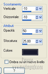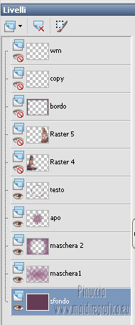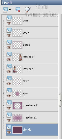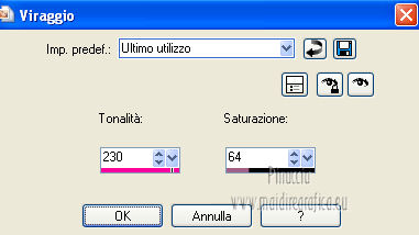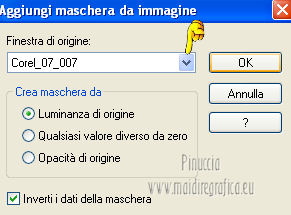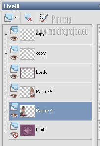 qui puoi trovare qualche risposta ai tuoi dubbi. Se l'argomento che ti interessa non è presente, ti prego di segnalarmelo. Questo tutorial è stato creato con PSP X2, ma può essere eseguito anche con le altre versioni di PSP. Per tradurlo, ho usato PSP X. Grazie ai creatori dei tubes che mettono a disposizione il loro lavoro in vari gruppi di condivisione. Rispetta il lavoro degli autori, non cambiare il nome del file e non cancellare il watermark. Occorrente: Due tubes a scelta. Il resto del materiale qui Per i poser usati grazie Monro. Per il frattale grazie Barbel. Per Apostern grazie Hexi Filtri: Xero - Improver qui Mura's Seamless - Emboss at Alpha qui Animation Shop qui Apri le maschere in PSP e minimizzale con il resto del materiale. Avvertenza. L'animazione, l'Apo e il testo sono stati realizzati con i colori del tutorial. Se stai usando altri colori, colorizza gli elementi in base a questi colori. Sul Viraggio vedi qui 1. Scegli due colori dai tuoi tubes. Imposta il colore di primo piano con il colore chiaro, e il colore di sfondo con il colore scuro. Apri una nuova immagine trasparente 800 x 600 pixels, e riempila con il colore di sfondo.Livelli>Nuovo livello raster. Riempi con il colore di primo piano.Livelli>Nuovo livello maschera>Da immagine. Apri il menu sotto la finestra di origine e vedrai la lista dei files aperti. Seleziona la maschera "Narah_mask0155", con i seguenti settaggi: ![]() Livelli>Unisci>Unisci gruppo. Effetti>Effetti di bordo>Aumenta. Livelli>Nuovo livello raster. Riempi con il colore di primo piano.Livelli>Nuovo livello maschera>Da immagine. Apri il menu sotto la finestra di origine e vedrai la lista dei files aperti. Seleziona la maschera "Corel_07_007", con i seguenti settaggi: ![]() Livelli>Unisci>Unisci gruppo. Effetti>Plugins>Mura's Seamless - Emboss at Alpha - 2 volte con i settaggi standard. ![]() Effetti>Effetti 3D>Sfalsa ombra. ![]() 2. Apri "Apo_stern_hexi_026" e vai a Modifica>Copia. Torna al tuo lavoro e vai a Modifica>Incolla come nuovo livello. Immagine>Ridimensiona, al 75%, tutti i livelli non selezionato. Posiziona la stella al centro dell'immagine.Regola>Tonalità e saturazione>Viraggio, con i valori corrispondenti al tuo colore scuro. I miei settaggi. ![]() Effetti>Effetti 3D>Sfalsa ombra. ![]() Apri "Text-Drehpunkt" e vai a Modifica>Copia. Torna al tuo lavoro e vai a Modifica>Incolla come nuovo livello. Il testo ha già il suo Effetto Sfalsa ombra. Se vuoi usare un tuo testo: Effetti>Effetti 3D>Sfalsa ombra. ![]() Apri i tuoi tubes e vai a Modifica>Copia. Torna al tuo lavoro e vai a Modifica>Incolla come nuovo livello. Immagine>Ridimensiona, se e quanto necessario, tutti i livelli non selezionato. Regola>Messa a fuoco>Metti a fuoco, oppure se preferisci: Effetti>Plugins>Xero - Improver. ![]() Effetti>Effetti 3D>Sfalsa ombra. ![]() Posiziona un tube a destra,e uno a sinistra - vedi il mio esempio per orientarti. 3. Livelli>Nuovo livello raster. Livelli>Nuovo livello raster. Riempi con il colore di sfondo.Livelli>Nuovo livello maschera>Da immagine. Apri il menu sotto la finestra di origine e seleziona la maschera "sc-edge041", con i seguenti settaggi: ![]() Livelli>Unisci>Unisci gruppo. Effetti>Plugins>Mura's Seamless - Emboss at Alpha, con i settaggi precedenti. Effetti>Effetti 3D>Sfalsa ombra. ![]() Aggiungi il tuo nome e/o il tuo watermark senza dimenticare il copyright delle immagini usate. Questa dovrebbe essere la tua paletta dei livelli. ![]() Chiudi i cinque livelli superiori. ![]() Livelli>Visualizza>Tutti. Chiudi il livello Uniti e attiva uno dei livelli superiori. ![]() Livelli>Unisci>Unisci visibile. Riapri e attiva il livello inferiore. ![]() Modifica>Copia Unione. Apri Animation Shop e vai a Modifica>Incolla>Incolla come nuova animazione. Modifica>Duplica e ripeti finchè non avrai 32 fotogrammi. Clicca sul primo fotogramma per selezionarlo, e vai a Modifica>Seleziona tutto. Apri "animation 228", anche questa composta da 32 fotogrammi. Modifica>Seleziona tutto. Modifica>Copia. Attiva il tuo lavoro e vai a Modifica>Incolla>Incolla nel fotogramma selezionato. Posiziona l'animazione al centro. ![]() Torna in PSP. Attiva il livello superiore e vai a Modifica>Copia. Torna in Animation Shop e vai a Modifica>Incolla>Incolla come nuova animazione. Modifica>Duplica e ripeti finchè non avrai 32 fotogrammi. Modifica>Seleziona tutto. Modifica>Copia. Attiva il tuo lavoro e vai a Modifica>Incolla>Incolla nel fotogramma selezionato. Posiziona l'animazione al centro. Controlla il risultato cliccando su Visualizza ![]() e salva in formato gif. ![]() ![]() Se hai problemi o dubbi, o trovi un link non funzionante, o anche soltanto per un saluto, scrivimi. 22 Novembre 2012 |