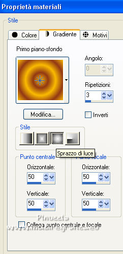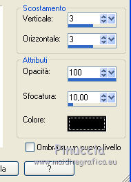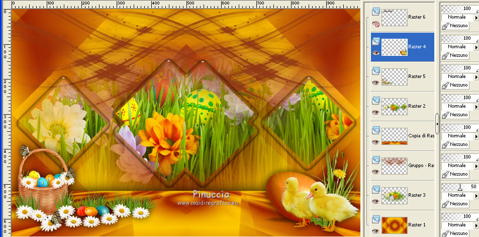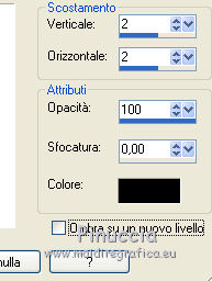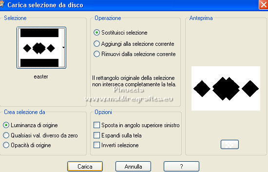 qui puoi trovare qualche risposta ai tuoi dubbi. Se l'argomento che ti interessa non è presente, ti prego di segnalarmelo. Questo tutorial è stato realizzato con Corel2020 e tradotto con PSPX e PSP7, ma può essere realizzato anche con le altre versioni di PSP. Dalla versione X4, il comando Immagine>Rifletti è stato sostituito con Immagine>Capovolgi in orizzontale, e il comando Immagine>Capovolgi con Immagine>Capovolgi in verticale. Nelle versioni X5 e X6, le funzioni sono state migliorate rendendo disponibile il menu Oggetti. Con la nuova versione X7, sono tornati Rifletti>Capovolgi, ma con nuove varianti. Vedi la scheda sull'argomento qui Grazie ai creatori dei tubes che mettono a disposizione il loro lavoro in vari gruppi di condivisione. Rispetta il lavoro degli autori, non cambiare il nome del file e non cancellare il watermark. traduzione francese qui Le vostre versioni qui![]() Occorrente: Tube a scelta (il tube usato dall'autore è sotto licenza). Il resto del materiale qui Per il tube usato e non fornito grazie Krys; per il misted grazie Mina. Per la maschera Grazie Narah (in questa pagina trovi i links ai siti dei creatori di tubes) Filtri: in caso di dubbi, ricorda di consultare la mia sezione filtri qui Mehdi - Sorting Tiles qui Alien Skin Eye Candy 5 Impact - Glass qui Mura's Meister - Perspective Tiling qui AAA Filters - Good Vibrations qui ![]() non esitare a cambiare modalità di miscelatura e opacità secondo i colori utilizzati. Nelle ultime versioni di PSP non c'è il gradiente di primo piano/sfondo (Corel_06_029) Puoi usare i gradienti delle versioni precedenti. Trovi qui i gradienti Corel X. Metti la selezione nella cartella Selezioni. Apri la maschera in PSP e minimizzala con il resto del materiale. 1. Scegli due colori dal tuo tube e imposta il colore di primo piano con il colore chiaro; il mio #fbbb02, e il colore scuro con il colore scuro; il mio #923917. ![]() Passa il colore di primo piano a Gradiente di primo piano/sfondo, stile Sprazzo di luce. ![]() Apri una nuova immagine trasparente 1000 x 650 pixels, e riempila con il gradiente.Effetti>Plugins>Mehdi - Sorting Tiles. ![]() Effetti>Effetti di riflesso>Specchio rotante. ![]() Livelli>Duplica. Immagine>Capovolgi. 2. Cambia la modalità di miscelatura di questo livello in Luce diffusa. Livelli>Unisci>Unisci giù. Selezione>Carica/Salva selezione>Carica selezione da disco. Cerca e carica la selezione easter. ![]() Apri il tube di sfondo e vai a Modifica>Copia. Torna al tuo lavoro e vai a Modifica>Incolla come nuovo livello. Posiziona il tube sulla selezione a vostro piacimento.Premi sulla tastiera il tasto CANC ![]() Selezione>Inverti. 3. Effetti>Plugins>Alien Skin Eye Candy 5 Impact - Glass. Seleziona il preset Clear con i seguenti settagi ![]() ![]() Selezione>Deseleziona. Attiva il livello Raster 1. Livelli>Duplica. Effetti>Plugins>Mura's Meister - Perspective Tiling. ![]() Effetti>Effetti 3D>Sfalsa ombra. ![]() 4. Livelli>Nuovo livello raster. Riempi il livello con il colore scuro.Livelli>Nuovo livello maschera>Da immagine. Apri il menu sotto la finestra di origine e vedrai la lista dei files aperti. Seleziona la maschera Narah_mask_0651. ![]() Effetti>Effetti di bordo>Aumenta. Livelli>Unisci>Unisci gruppo. Tasto K per attivare lo strumento Puntatore ![]() e imposta Posizione x: 79,00 e Posizione Y: -233,00. ![]() Livelli>Duplica. Immagine>Rifletti. Livelli>Unisci>Unisci giù. Livelli>Disponi>Sposta giù. 6. Modifica>Incolla come nuovo livello (il tube di sfondo è sempre in memoria). Se necessario, Immagine>Ridimensiona, tutti i livelli non selezionato. Regola>Messa a fuoco>Metti a fuoco. Livelli>Disponi>Sposta giù. Abbassa l'opacità di questo livello al 50%. Attiva il livello superiore. Copia/Incolla come nuovo livello i tubes accessori. Immagine>Ridimensiona, se necessario, tutti i livelli non selezionato. Regola>Messa a fuoco>Metti a fuoco. Effetti>Effetti 3D>Sfalsa ombra. ![]() 6. Apri il testo e vai a Modifica>Copia. Torna al tuo lavoro e vai a Modifica>Incolla come nuovo livello. Posiziona il testo come preferisci,e tieni presente che più tardi dovrai aggiungere il tube del personaggio. per il mio esempio, ho scelto di aggiungere il testo dopo il tube principale. Effetti>Effetti 3D>Sfalsa ombra. ![]() ![]() 6. Attiva il livello Raster 1. Modifica>Copia. Immagine>Aggiungi bordatura, 3 pixels, simmetriche, colore chiaro. Immagine>Aggiungi bordatura, 2 pixels, simmetriche, colore scuro. Immagine>Aggiungi bordatura, 3 pixels, simmetriche, colore chiaro. 7. Selezione>Seleziona tutto. Immagine>Aggiungi bordatura, 50 pixels, simmetriche, colore chiaro. Selezione>Inverti. Modifica>Incolla nella selezione. Effetti>Plugins>AAAF ilters - Good Vibrations. ![]() Effetti>Effetti di bordo>Aumenta. Selezione>Inverti. Effetti>Effetti 3D>Sfalsa ombra. ![]() Selezione>Deseleziona. 8. Immagine>Aggiungi bordatura, 3 pixels, simmetriche, colore chiaro. Immagine>Aggiungi bordatura, 2 pixels, simmetriche, colore scuro. Immagine>Aggiungi bordatura, 3 pixels, simmetriche, colore chiaro. Selezione>Seleziona tutto. Immagine>Aggiungi bordatura, 40 pixels, simmetriche, colore chiaro. Effetti>Effetti 3D>Sfalsa ombra, con i settaggi precedenti. Selezione>Deseleziona. 9. Apri Deco 1 e vai a Modifica>Copia. Torna al tuo lavoro e vai a Modifica>Incolla come nuovo livello. Effetti>Effetti 3D>Sfalsa ombra. ![]() Apri il tube del personaggio e vai a Modifica>Copia. Torna al tuo lavoro e vai a Modifica>Incolla come nuovo livello. Immagine>Ridimensiona, se e quanto necessario, tutti i livelli non selezionato. Regola>Messa a fuoco>Metti a fuoco. Effetti>Effetti 3D>Sfalsa ombra. ![]() Immagine>Aggiungi bordatura, 2 pixels, simmetriche, colore scuro. Immagine>Ridimensiona, 1050 pixels di larghezza, tutti i livelli selezionato. Firma il tuo lavoro e salva in formato jpg. ![]() Se hai problemi o dubbi, o trovi un link non funzionante, o anche soltanto per un saluto, scrivimi. 9 Aprile 2022 |