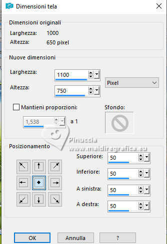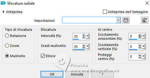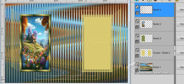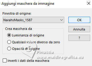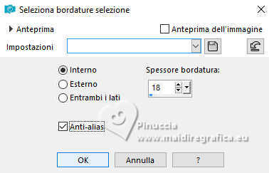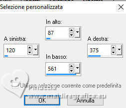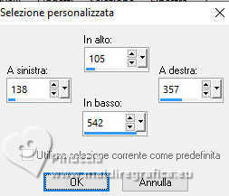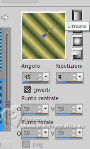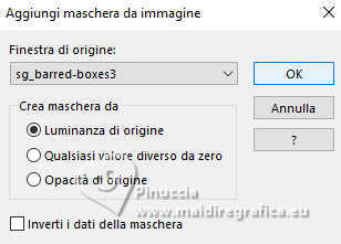 qui puoi trovare qualche risposta ai tuoi dubbi. Se l'argomento che ti interessa non è presente, ti prego di segnalarmelo. Questo tutorial è stato realizzato con PSP2019 e tradotto con PSPX9 e PSP2020, ma può essere realizzato anche con le altre versioni di PSP. Dalla versione X4, il comando Immagine>Rifletti è stato sostituito con Immagine>Capovolgi in orizzontale, e il comando Immagine>Capovolgi con Immagine>Capovolgi in verticale. Nelle versioni X5 e X6, le funzioni sono state migliorate rendendo disponibile il menu Oggetti. Con la nuova versione X7, sono tornati Rifletti>Capovolgi, ma con nuove varianti. Vedi la scheda sull'argomento qui Grazie ai creatori dei tubes che mettono a disposizione il loro lavoro in vari gruppi di condivisione. Rispetta il lavoro degli autori, non cambiare il nome del file e non cancellare il watermark. traduzione francese qui traduzione inglese qui Le vostre versioni qui![]() Occorrente: Tubes a scelta Il resto del materiale ![]() I tubes usati sono di Gerda Per due maschere grazie Narah. (in questa pagina trovi i links ai siti dei creatori di tubes) ![]() in caso di dubbi, ricorda di consultare la mia sezione filtri qui Filters Unlimited 2.0 qui Mura's Meister - Perspective Tiling qui AAA Frames - Foto Frame qui ![]() non esitare a cambiare modalità di miscelatura e opacità secondo i colori utilizzati. Nelle ultime versioni di PSP non c'é il gradiente di primo piano/sfondo (Corel_06_029) Puoi usare i gradienti delle versioni precedenti. Trovi qui i gradienti Corel X. ![]() Apri le maschere in PSP e minizzale con il resto del materiale. 1. Scegli dai tuoi tubes un colore chiaro e un colore scuro. I miei colori ![]() Apri una nuova immagine trasparente 1000 x 650 pixels. Selezione>Seleziona tutto. Apri l'immagine di sfondo Easter Bunny Paper (6) ![]() Modifica>Copia. Torna al tuo lavoro e vai a Modifica>Incolla nella selezione. Selezione>Deseleziona. Regola>Sfocatura>Sfocatura radiale. ![]() Effetti>Effetti di distorsione>Onda. ![]() 2. Livelli>Nuovo livello raster. Riempi il livello con il colore chiaro.Livelli>Nuovo livello maschera>Da immagine. Apri il menu sotto la finestra di origine e vedrai la lista dei files aperti. Seleziona la maschera Narah_Masks_1326 ![]() Effetti>Effetti di bordo>Aumenta. Livelli>Unisci>Unisci gruppo. Attiva lo strumento Selezione ![]() (non importa il tipo di selezione impostato, perché con la selezione personalizzata si ottiene sempre un rettangolo) clicca sull'icona Selezione personalizzata ![]() e imposta i seguenti settaggi. ![]() Livelli>Nuovo livello raster. Modifica>Incolla nella selezione (l'immagine di sfondo è sempre in memoria). Regola>Messa a fuoco>Metti a fuoco. 3. Selezione personalizzata ![]() ![]() Passa il colore di primo piano a Gradiente di primo piano/sfondo, stile Lineare. ![]() Livelli>Nuovo livello raster. Livelli>Disponi>Sposta giù. Riempi la selezione con il gradiente.Selezione>Modifica>Seleziona bordature selezione. ![]() Effetti>Effetti 3D>Smusso a incasso. ![]() Attiva il livello superiore. Selezione personalizzata ![]() ![]() 4. Livelli>Nuovo livello raster. Effetti>Effetti 3D>Ritaglio ![]() Selezione>Deseleziona. ![]() Livelli>Unisci>Unisci giù - 2 volte. Livelli>Duplica. Immagine>Rifletti>Rifletti orizzontalmente (Immagine>Rifletti). Livelli>Unisci>Unisci giù. Effetti>Effetti 3D>Sfalsa ombra, colore nero. ![]() 5. Attiva il livello della maschera. Effetti>Effetti 3D>Sfalsa ombra, colore nero. ![]() Passa il colore di primo piano a Colore. Livelli>Nuovo livello raster. Riempi il livello con il colore chiaro di primo piano.Livelli>Nuovo livello maschera>Da immagine. Apri il menu sotto la finestra di origine e seleziona la maschera NarahsMasks_1587 ![]() Effetti>Effetti di bordo>Aumenta di più. Livelli>Unisci>Unisci gruppo. 6. Livelli>Nuovo livello raster. Riempi il livello con il colore chiaro di primo piano.Livelli>Nuovo livello maschera>Da immagine. Apri il menu sotto la finestra di origine e seleziona la maschera sg_barred_boxes3 ![]() Effetti>Effetti di bordo>Aumenta di più. Livelli>Unisci>Unisci gruppo. Effetti>Effetti 3D>Sfalsa ombra, con i settaggi precedenti. Attiva il livello inferiore. Modifica>Copia Livelli>Unisci>Unisci visibile. 7. Immagine>Dimensioni tela - 1100 x 750 pixels. ![]() Oggetti>Allinea>Superiore. Livelli>Nuovo livello raster. Livelli>Disponi>Sposta giù. Selezione>Seleziona tutto. Modifica>Incolla nella selezione Selezione>Deseleziona. Effetti>Plugins>Filters Unlimited 2.0 - Paper Textures - Hemp Paper 2, con i settaggi standard. ![]() Livelli>Duplica. 8. Effetti>Plugins>Mura's Meister - Perspective Tiling. ![]() Effetti>Effetti di riflesso>Specchio rotante, con i settaggi standard. ![]() Attiva il livello superiore. Effetti>Effetti 3D>Sfalsa ombra, colore nero. ![]() Apri deco-1 ![]() Modifica>Copia. Torna al tuo lavoro e vai a Modifica>Incolla come nuovo livello. Oggetti>Allinea>Inferiore. Effetti>Effetti 3D>Sfalsa ombra, colore nero. ![]() 9. Apri il tube principale e vai a Modifica>Copia. Torna al tuo lavoro e vai a Modifica>Incolla come nuovo livello. Immagine>Ridimensiona, se necessario, tutti i livelli non selezionato. Regola>Messa a fuoco>metti a fuoco. Effetti>Effetti 3D>Sfalsa ombra, colore nero. ![]() Immagine>Aggiungi bordatura, 2 pixels, simmetriche, colore scuro. Selezione>Seleziona tutto. Modifica>Copia Immagine>Aggiungi bordatura, 45 pixels, simmetriche, colore chiaro. Selezione>Inverti. Modifica>Incolla nella selezione 10. Regola>Sfocatura>Sfocatura gaussiana - raggio 10. ![]() Effetti>Plugins>Filters Unlimited 2.0 - Paper Textures - Hemp Paper 2, con i settaggi precedenti. Effetti>Plugins>AAA Frames - Foto Frame. ![]() Effetti>Effetti di riflesso>Specchio rotante, con i settaggi standard. ![]() Selezione>Inverti. Effetti>Effetti 3D>Sfalsa ombra, con i settaggi precedenti. Modifica>Ripeti Sfalsa ombra. Selezione>Deseleziona. 11. Apri il tube tube accessorio (facoltativo), e vai a Modifica>Copia. Torna al tuo lavoro e vai a Modifica>Incolla c