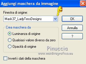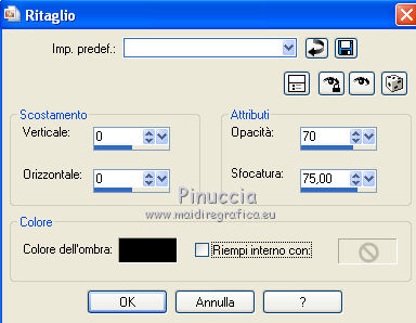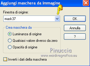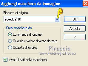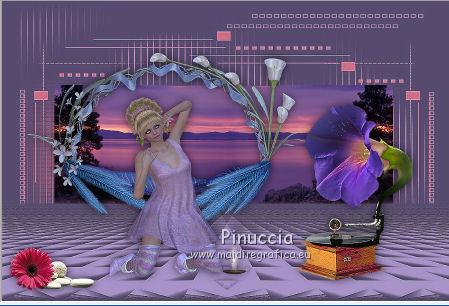 qui puoi trovare qualche risposta ai tuoi dubbi. Se l'argomento che ti interessa non è presente, ti prego di segnalarmelo. Questo tutorial è stato creato con PSP X2, ma può essere eseguito anche con le altre versioni di PSP. Per tradurlo, ho usato PSP X. Grazie ai creatori dei tubes che mettono a disposizione il loro lavoro in vari gruppi di condivisione. Rispetta il lavoro degli autori, non cambiare il nome del file e non cancellare il watermark. Occorrente: Materiale qui Per i tubes utilizzati grazie Batschi e Guismo Filtri: Xero - Improver qui Apri le maschere in PSP e minimizzale con il resto del materiale. 1. Scegli dai tuoi tubes un colore chiaro per il colore di primo piano, e un colore scuro per il colore di sfondo. Apri una nuova immagine trasparente 900 x 600 pixels, e riempila con il colore scuro di sfondo.Livelli>Nuovo livello raster. Riempi con il colore chiaro di primo piano.Livelli>Nuovo livello maschera>Da immagine. Apri il menu sotto la finestra di origine e vedrai la lista dei files aperti. Seleziona la maschera "mask37_LadyTessDesigns", con i seguenti settaggi. ![]() Livelli>Unisci>Unisci gruppo. Attiva lo strumento Puntatore (tasto K)deformazione se stai usando PSP 9,oppure premi sulla tastiera il tasto D, valido per tutte le versioni, e, usando il nodo superiore al centro, spingi la maschera in basso, come nell'esempio. ![]() ![]() usando il nodo centrale a sinistra, spingi la maschera come nell'esempio. ![]() ![]() Livelli>Duplica. Immagine>Rifletti e unisci al centro i due livelli. ![]() Livelli>Unisci>Unisci giù. 2. Effetti>Effetti di bordo>Aumenta. Effetti>Effetti 3D>Sfalsa ombra. ![]() Livelli>Nuovo livello raster. Riempi con un terzo colore scelto dai tuoi tubes.Livelli>Nuovo livello maschera>Da immagine. Apri il menu sotto la finestra di origine e seleziona la maschera "mask37". ![]() Livelli>Unisci>Unisci gruppo. Effetti>Effetti di bordo>Aumenta. Livelli>Disponi>Sposta giù. Attiva lo strumento Selezione , rettangolo,e seleziona la parte inferiore della maschera. ![]() Premi sulla tastiera il tasto CANC. Selezione>Deseleziona. Di nuovo strumento Selezione ![]() e seleziona il riquadro come nell'esempio. ![]() Apri la tua immagine di sfondo e vai a Modifica>Copia. Torna al tuo lavoro e vai a Modifica>Incolla come nuovo livello. Posiziona l'immagine nell'area selezionata.l'immagine fornita è più piccola del riquadro. Per il mio esempio, ho ridimensionato, posizionato l'immagine nella metà a destra della selezione ![]() e ho terminato il passaggio in questo modo: Livelli>Duplica. Immagine>Rifletti. Livelli>Unisci>Unisci giù Selezione>Inverti. Premi sulla tastiera il tasto CANC. Selezione>Deseleziona. 3. Effetti>Plugins>Xero - Improver. ![]() Livelli>Unisci>Unisci giù. Attiva il livello superiore. Apri il tuo tube principale (il mio è di Batschi) e vai a Modifica>Copia. Torna al tuo lavoro e vai a Modifica>Incolla come nuovo livello. Immagine>Ridimensiona, se e quanto necessario. Effetti>Plugins>Xero - Improver, con i settaggi precedenti. Effetti>Effetti 3D>Sfalsa ombra. ![]() Posiziona correttamente il tube.![]() Apri "calguisfranaphone" e vai a Modifica>Copia. Torna al tuo lavoro e vai a Modifica>Incolla come nuovo livello. Immagine>Ridimensiona, al 50%, tutti i livelli non selezionato. Spostalo in basso a destra.Effetti>Plugins>Xero - Improver, con i settaggi precedenti. Effetti>Effetti 3D>Sfalsa ombra, con i settaggi precedenti. 4. Apri "calguisgerbera" e vai a Modifica>Copia. Torna al tuo lavoro e vai a Modifica>Incolla come nuovo livello. Immagine>Ridimensiona, al 40%, tutti i livelli non selezionato. Effetti>Plugins>Xero - Improver, con i settaggi precedenti. Effetti>Effetti 3D>Sfalsa ombra, con i settaggi precedenti. Spostalo in basso a sinistra.![]() Apri "calguisblooms" e vai a Modifica>Copia. Torna al tuo lavoro e vai a Modifica>Incolla come nuovo livello. Immagine>Ridimensiona, al 70%, tutti i livelli non selezionato. Effetti>Plugins>Xero - Improver, con i settaggi precedenti. Effetti>Effetti 3D>Sfalsa ombra, con i settaggi precedenti. Spostalo in alto a destra.Livelli>Duplica. Immagine>Rifletti. Immagine>Ridimensiona, al 70%, tutti i livelli non selezionato. Sposta questo tube in alto a sinistra.![]() 5. Livelli>Nuovo livello raster. Riempi con il colore usato per l'ultima maschera.Livelli>Nuovo livello maschera>Da immagine. Apri il menu sotto la finestra di origine e seleziona la maschera "sc-edge101". ![]() Livelli>Unisci>Unisci gruppo. Effetti>Effetti di bordo>Aumenta - 2 volte. Immagine>Ridimensiona, al 105%, tutti i livelli non selezionato. Effetti>Effetti 3D>Sfalsa ombra. ![]() Nella paletta dei livelli porta il livello di questa maschera sotto i livelli dei tube deco. ![]() Aggiungi il tuo nome e/o il tuo watermark su un nuovo livello, senza dimenticare eventuali copyright delle immagini usate. Controlla che tutto sia correttamente posizionato. Se necessario puoi ancora spostare gli elementi della tua tag. Livelli>Unisci>Unisci tutto. 5. Immagine>Aggiungi bordatura, 5 pixels, simmetriche, con il colore di primo piano. Seleziona questo bordo con la bacchetta magica ![]() Effetti>Effetti 3D>Smusso a incasso. ![]() Selezione>Deseleziona. Immagine>Aggiungi bordatura, 5 pixels, simmetriche, con il colore di sfondo. Seleziona questo bordo con la bacchetta magica ![]() Effetti>Effetti 3D>Smusso a incasso, con i settaggi precedenti. Selezione>Deseleziona. Immagine>Aggiungi bordatura, 5 pixels, simmetriche, con il colore di primo piano. Seleziona questo bordo con la bacchetta magica ![]() Effetti>Effetti 3D>Smusso a incasso, con i settaggi precedenti. Selezione>Deseleziona. Selezione>Seleziona tutto. Selezione>Modifica>Contrai - 15 pixels. ![]() Effetti>Effetti 3D>Ritaglio. ![]() Selezione>Deseleziona. Immagine>Ridimensiona, a 900 pixels di larghezza, tutti i livelli selezionato. Salva in formato jpg. ![]() Se hai problemi o dubbi, o trovi un link non funzionante, o anche soltanto per un saluto, scrivimi 25 Marzo 2012 |