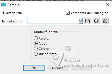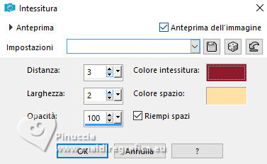 qui puoi trovare qualche risposta ai tuoi dubbi. Se l'argomento che ti interessa non è presente, ti prego di segnalarmelo. Questo tutorial è stato realizzato con PSP2019 e tradotto con PSPX9 e PSP2020, ma può essere realizzato anche con le altre versioni di PSP. Dalla versione X4, il comando Immagine>Rifletti è stato sostituito con Immagine>Capovolgi in orizzontale, e il comando Immagine>Capovolgi con Immagine>Capovolgi in verticale. Nelle versioni X5 e X6, le funzioni sono state migliorate rendendo disponibile il menu Oggetti. Con la nuova versione X7, sono tornati Rifletti>Capovolgi, ma con nuove varianti. Vedi la scheda sull'argomento qui Grazie ai creatori dei tubes che mettono a disposizione il loro lavoro in vari gruppi di condivisione. Rispetta il lavoro degli autori, non cambiare il nome del file e non cancellare il watermark. traduzione francese qui traduzione inglese qui Le vostre versioni qui![]() Occorrente: ![]() Per il tube e il materiale tratti dal kit First Snow, grazie Adrienne. (in questa pagina trovi i links ai siti dei creatori di tubes) ![]() in caso di dubbi, ricorda di consultare la mia sezione filtri qui Filters Unlimited 2.0 qui Flaming Pear - Flexify 2 qui VanDerLee - Snowflakes qui Mura's Meister - Perspective Tiling qui Simple - Top Left Mirror qui I filtri Simple si possono usare da soli o importati in Filters Unlimited (come fare vedi qui) Se un filtro fornito appare con questa icona ![]() non esitare a cambiare modalità di miscelatura e opacità secondo i colori utilizzati. Nelle ultime versioni di PSP non c'é il gradiente di primo piano/sfondo (Corel_06_029) Puoi usare i gradienti delle versioni precedenti. Trovi qui i gradienti Corel X. ![]() Apri la maschera in Psp e minimizzala con il resto del materiale. 1. Scegli dai tuoi tubes un colore chiaro e un colore scuro. ![]() Apri una nuova immagine trasparente 1000 x 650 pixels. Selezione>Seleziona tutto. Apri First Snow Paper (2) ![]() Modifica>Copia. Torna al tuo lavoro e vai a Modifica>Incolla nella selezione. Selezione>Deseleziona. Effetti>Effetti di immagine>Motivo unico, con i settaggi standard. ![]() Regola>Sfocatura>Sfocatura gaussiana - raggio 20. ![]() 2. Effetti>Plugins>Filters unlimited 2.0 - Paper Textures - Striped Paper,Fine, con i settaggi standard. ![]() Effetti>Plugins>Flaming Pear - Flexify 2. ![]() Effetti>Plugins>VanDerLee - Snowflakes. ![]() Ripeti ancora una volta il filtro, Random Seed a 100. ![]() Livelli>Duplica. Effetti>Plugins>Mura's Meister - Perspective Tiling. ![]() 3. Effetti>Effetti di riflesso>Specchio rotante. ![]() Effetti>Effetti 3D>Sfalsa ombra. ![]() Apri First Snow Element (52) ![]() Modifica>Copia. Torna al tuo lavoro e vai a Modifica>Incolla come nuovo livello. Immagine>Ridimensiona, al 110%, tutti i livelli non selezionato. Tasto K per attivare lo strumento Puntatore e imposta Posizione X: 209,00 e Posizione Y: 9,00. ![]() Effetti>Effetti 3D>Sfalsa ombra, con i settaggi precedenti. 4. Chiudi per il momento questo livello. Attiva il livello sottostante, Copia di Raster 1. Livelli>Duplica. Effetti>Effetti geometrici>Cerchio. ![]() Modifica>Ripeti Cerchio. Immagine>Capovolgi. Attiva lo strumento Bacchetta magica ![]() e clicca nella parte chiara per selezionarla. ![]() Effetti>Effetti di trama>Intessitura. colore intessitura: colore scuro colore spazio: colore chiaro ![]() 5. Selezione>Inverti. Effetti>Effetti 3D>Sfalsa ombra, con i settaggi precedenti. Selezione>Deseleziona. Riapri e attiva il livello superiore. Tasto K per attivare lo strumento Puntatore