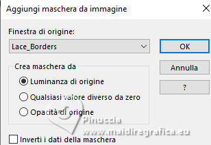 e imposta Posizione X: 188,00 e Posizione Y: 22,00.![]() Effetti>Effetti 3D>Sfalsa ombra. ![]() Apri First Snow Element (112) ![]() Modifica>Copia. Torna al tuo lavoro e vai a Modifica>Incolla come nuovo livello. Immagine>Ridimensiona, al 40%, tutti i livelli non selezionato. Regola>Messa a fuoco>Metti a fuoco. Spostalo in basso a destra.Effetti>Effetti 3D>Sfalsa ombra, con i settaggi precedenti. Apri First Snow Element (96) ![]() Modifica>Copia. Torna al tuo lavoro e vai a Modifica>Incolla come nuovo livello. Immagine>Ridimensiona, al 50%, tutti i livelli non selezionato. Regola>Messa a fuoco>Metti a fuoco. Spostalo in basso a sinistra.![]() Effetti>Effetti 3D>Sfalsa ombra, con i settaggi precedenti. 7. Livelli>Nuovo livello raster. Selezione>Seleziona tutto. Effetti>Effetti 3D>Ritaglio. ![]() Livelli>Unisci>Unisci visibile. Immagine>Dimensioni tela - 1100 x 750 pixels. ![]() Passa il colore di primo piano a Gradiente di primo piano/sfondo, stile Lineare. ![]() Selezione>Inverti. Riempi la selezione con il gradiente.Livelli>Nuovo livello raster. Inverti i colori del Gradiente ![]() Riempi la selezione con il gradiente.8. Livelli>Nuovo livello maschera>Da immagine. Apri il menu sotto la finestra di origine e vedrai la lista dei files aperti. Seleziona la maschera Lace_Borders ![]() Effetti>Effetti di bordo>Aumenta. Livelli>Unisci>Unisci gruppo. Selezione>Deseleziona. Effetti>Effetti 3D>Sfalsa ombra. ![]() Apri First Snow Element (3) ![]() Modifica>Copia. Torna al tuo lavoro e vai a Modifica>Incolla come nuovo livello. Immagine>Ridimensiona, al 30%, tutti i livelli non selezionato. Regola>Messa a fuoco>Metti a fuoco. Spostalo in alto a sinistra del bordo.9. Effetti>Effetti 3D>Sfalsa ombra. ![]() Effetti>Plugins>Simple - Top Left Mirror. ![]() Firma il tuo lavoro su un nuovo livello. Immagine>Aggiungi bordatura, 2 pixels, simmetriche, colore scuro. Salva in formato jpg. ![]() ![]() Se hai problemi o dubbi, o trovi un link non funzionante, o anche soltanto per un saluto, scrivimi. 3 Novembre 2023 |