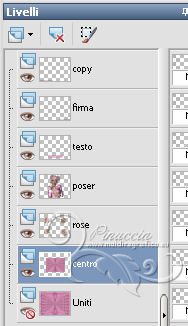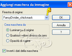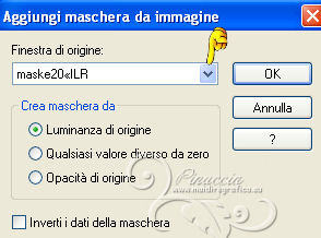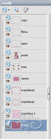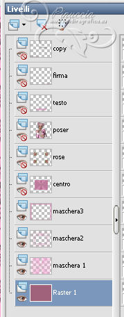 qui puoi trovare qualche risposta ai tuoi dubbi. Se l'argomento che ti interessa non è presente, ti prego di segnalarmelo. Questo tutorial è stato creato con PSP X2, ma può essere eseguito anche con le altre versioni di PSP. Per tradurlo, ho usato PSP X. Grazie ai creatori dei tubes che mettono a disposizione il loro lavoro in vari gruppi di condivisione. Rispetta il lavoro degli autori, non cambiare il nome del file e non cancellare il watermark. Occorrente: Un tube a scelta. Il resto del materiale qui Per il poser usato grazie Monro Filtri Xero - Improver qui Animation Shop qui ![]() Apri le maschere in PSP e minimizzale con il resto del materiale. 1. Scegli due colori dal tuo tube. Imposta il colore di primo piano con il colore chiaro, e il colore di sfondo con il colore scuro. I miei colori. ![]() Apri una nuova immagine trasparente 900 x 700 pixels, e riempila con il colore di sfondo.Livelli>Nuovo livello raster. Riempi con il colore chiaro di primo piano.Livelli>Nuovo livello maschera>Da immagine. Apri il menu sotto la finestra di origine e vedrai la lista dei files aperti. Seleziona la maschera "sg_sidewipe", con i seguenti settaggi: ![]() Livelli>Unisci>Unisci gruppo. Effetti>Effetti di bordo>Aumenta - 2 volte. 2. Livelli>Nuovo livello raster. Riempi con il colore di primo piano.Livelli>Nuovo livello maschera>Da immagine. Apri il menu sotto la finestra di origine e seleziona la maschera maske20©ILR. ![]() Livelli>Unisci>Unisci gruppo. Effetti>Effetti 3D>Sfalsa ombra. ![]() Livelli>Nuovo livello raster. Riempi con il colore di primo piano.Livelli>Nuovo livello maschera>Da immagine. Apri il menu sotto la finestra di origine e seleziona la maschera FancyDivider-chickmask. ![]() Livelli>Unisci>Unisci gruppo. 3. Attiva la maschera FancyDivider-Chickmask. Immagine>Ruota a destra se stai usando PSP 9: Immagine>Ruota - 90 gradi in senso orario e adesso la maschera ruotata avrà i bordi a destra e a sinistra. ![]() Minimizza nuovamente la maschera e torna al tuo lavoro. Livelli>Nuovo livello raster. Riempi con il colore di primo piano.Livelli>Nuovo livello maschera>Da immagine. Apri il menu sotto la finestra di origine e seleziona nuovamente la maschera FancyDivider-chickmask. ![]() Livelli>Unisci>Unisci gruppo. Livelli>Disponi>Sposta giù. Attiva il livello superiore. Livelli>Unisci>Unisci giù. Effetti>Effetti 3D>Sfalsa ombra. ![]() 4. Attiva il livello della seconda maschera. ![]() Attiva lo strumento Selezione , rettangolo,e traccia una selezione intorno al riquadro della maschera. ![]() Modifica>Copia Unione. Attiva il livello superiore. Livelli>Nuovo livello raster. Modifica>Incolla nella selezione. Selezione>Deseleziona. Rinomina questo livello "centro". Apri il tube *CJ*Roses for you e attiva il livello Raster 1 con la piccola rosa. Modifica>Copia. Torna al tuo lavoro e vai a Modifica>Incolla come nuovo livello. Sposta la rosa in alto a sinistra.![]() Livelli>Duplica. Immagine>Rifletti. Livelli>Unisci>Unisci giù. Livelli>Duplica. Immagine>Capovolgi. Livelli>Unisci>Unisci giù. 5. Apri il tuo tube e vai a Modifica>Copia. Torna al tuo lavoro e vai a Modifica>Incolla come nuovo livello. Immagine>Ridimensiona, se e quanto necessario, tutti i livelli non selezionato. Spostalo al centro.Effetti>Plugins>Xero - Improver. ![]() Effetti>Effetti 3D>Sfalsa ombra. ![]() Scrivi un testo, se vuoi. Aggiungi il tuo nome e/o il tuo watermark su un nuovo livello, senza dimenticare eventuali copyright delle immagini usate. Per eliminare eventuali parti del tube rimaste al di fuori dei bordi della tua tag: attiva il livello inferiore. Selezione>Seleziona tutto. Immagine>Ritaglia la selezione. Questa dovrebbe essere la tua paletta dei livelli. ![]() 6. Se stai usando altri colori, prima di passare il tuo lavoro in Animation Shop, apri in PSP le due animazioni "ani-linksILR" e "ani-rechtsILR". Si tratta di files composti da 12 livelli. Prendi nota dei valori di Tonalità (H) e Saturazione (S) del colore che intendi usare. ![]() Regola>Tonalità e saturazione>Viraggio, e trascrivi i valori annotati nelle rispettive caselle. ![]() Applica il viraggio su tutti e 12 i livelli. Salva l'immagine in formato Animation Shop (*psp). ![]() 6. Torna al tuo lavoro. Chiudi tutti i livelli tranne i primi quattro. ![]() Livelli>Unisci>Unisci visibile. Modifica>Copia. Apri Animation Shop e vai a Modifica>Incolla>Incolla come nuova animazione. Modifica>Duplica, 3 volte, e avrai una animazione composta da 5 fotogrammi. oppure clicca 3 volte sull'icona corrispondente nella barra superiore degli strumenti Clicca sul primo fotogramma per selezionarlo e vai a Modifica>Seleziona tutto. Apri l'animazione "ani-rechts;ILR" (o l'animazione salvata con il tuo colore). Modifica>Seleziona tutto. Modifica>Copia. Attiva il tuo lavoro e vai a Modifica>Incolla>Incolla nel fotogramma selezionato. Posiziona l'animazione sul cerchio in alto a destra. ![]() Ripeti Modifica>Incolla>Incolla nel fotogramma selezionato, e posiziona l'animazione in basso a sinistra. ![]() Apri l'animazione "ani-links©ILR" (o l'animazione salvata con il tuo colore). Modifica>Seleziona tutto. Modifica>Copia. Attiva il tuo lavoro e vai a Modifica>Incolla>Incolla nel fotogramma selezionato. Posiziona l'animazione sul cerchio in alto a sinistra. Di nuovo Modifica>Incolla>Incolla nel fotogramma selezionato, e posiziona l'animazione in basso a destra. Dovresti avere questo. ![]() 7. Torna in PSP. Livelli>Visualizza>Tutto, e chiudi il livello uniti. ![]() Modifica>Copia Unione. Torna in Animation Shop e vai a Modifica>Incolla>Incolla come nuova animazione. Modifica>Duplica, 3 volte, o clicca 3 volte sull'icona corrispondente. Modifica>Seleziona tutto. Modifica>Copia. Attiva il tuo lavoro e vai a Modifica>Incolla>Incolla nel fotogramma selezionato. Posiziona l'immagine al centro. Controlla il risultato cliccando su Visualizza e salva in formato jpg.![]() Le vostre versioni. Grazie ![]() Kamelius ![]() Se hai problemi o dubbi, o trovi un link non funzionante, o anche