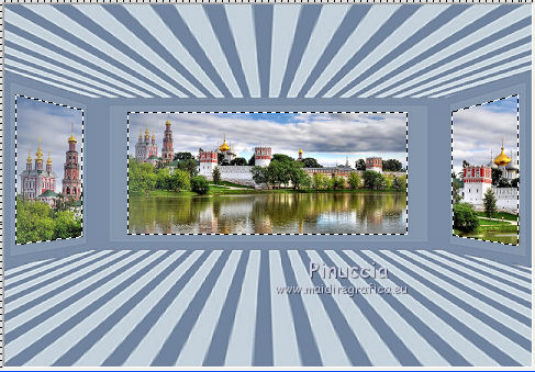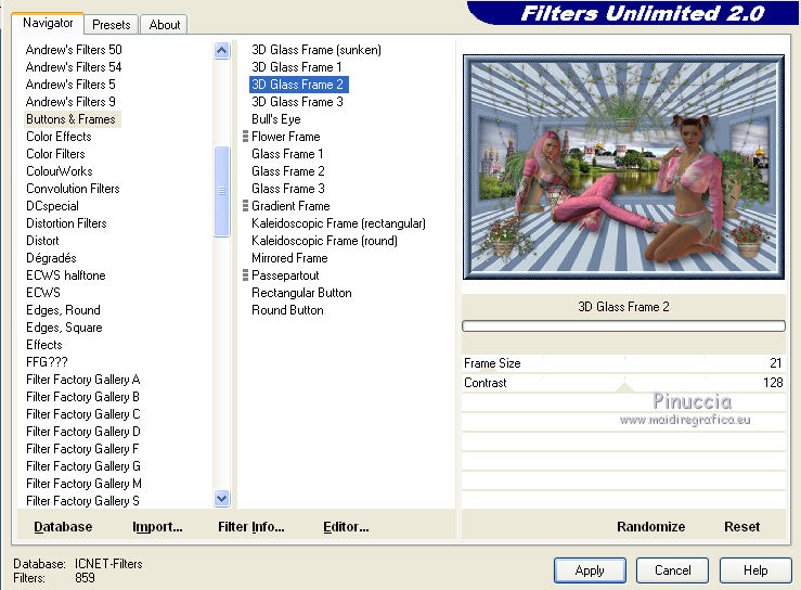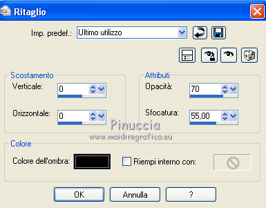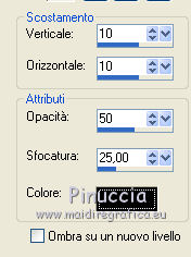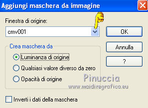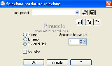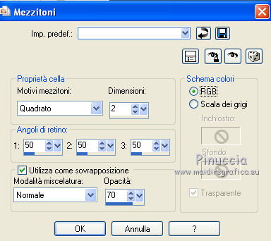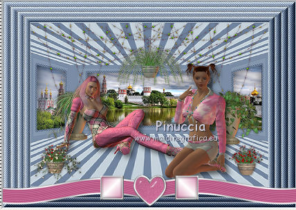 qui puoi trovare qualche risposta ai tuoi dubbi. Se l'argomento che ti interessa non è presente, ti prego di segnalarmelo. Questo tutorial è stato creato con PSP X2, ma può essere eseguito anche con le altre versioni di PSP. Per tradurlo, ho usato PSP X. Il materiale viene da vari gruppi di condivisione. Il copyright appartiene ai rispettivi autori. Grazie ai creatori dei tubes che mettono a disposizione il loro lavoro in vari gruppi di condivisione. Rispetta il lavoro degli autori, non cambiare il nome del file e non cancellare il watermark. Occorrente: A scelta due tubes principali e tubes accessori. Il resto del materiale qui Per i tubes utilizzati grazie Sissy. Filtri: Filters Unlimited 2.0 qui Apri la maschera in PSP e minimizzala con il resto del materiale. 1. Scegli dal tube di sfondo un colore chiaro per il colore di primo piano, e un colore scuro per il colore di sfondo. Apri una nuova immagine trasparente 800 x 550 pixels, e riempila con il colore di sfondo.Livelli>Nuovo livello raster. Riempi con il colore di primo piano.Livelli>Nuovo livello maschera>Da immagine. Apri il menu sotto la finestra di origine e vedrai la lista dei files aperti. Seleziona la maschera cmv001, con i seguenti settaggi. ![]() Livelli>Unisci>Unisci gruppo. Effetti>Effetti di bordo>Aumenta. 2. Attiva lo strumento Selezione , rettangolo,e seleziona l'interno della maschera, come nell'esempio. ![]() Premi sulla tastiera il tasto CANC. Apri il tube lunapaisagem1662 e vai a Modifica>Copia. Torna al tuo lavoro e vai a Modifica>Incolla come nuovo livello. Livelli>Disponi>Sposta giù. Posiziona il tube nell'area selezionata.Selezione>Inverti. Premi sulla tastiera il tasto CANC. Selezione>Deseleziona. Regola>Messa a fuoco>Metti a fuoco. 3. Attiva lo strumento Selezione a mano libera , da punto a punto,e seleziona i riquadri a destra e a sinistra. ![]() Premi sulla tastiera il tasto CANC. Modifica>Incolla come nuovo livello (il tube del paesaggio è ancora in memoria). Posiziona il tube lasciando nel riquadro a sinistra quello che vuoi rimanga visibile.Selezione>Inverti. Premi sulla tastiera il tasto CANC. Mantieni selezionato. Modifica>Incolla come nuovo livello (il tube del paesaggio è ancora in memoria). Posiziona il tube lasciando nel riquadro a destra ciò che vuoi rimanga visibile.Premi sulla tastiera il tasto CANC. Selezione>Deseleziona. 4. Su entrambi i livelli dei tube: Regola>Messa a fuoco>Metti a fuoco. Attiva il livello della maschera. Attiva lo strumento Bacchetta magica ![]() ![]() Clicca sui tre riquadri per selezionarli. ![]() Livelli>Nuovo livello raster. Selezione>Modifica>Seleziona bordature selezione. ![]() Riempi la selezione con il colore di sfondo.Effetti>Effetti artistici>Mezzitoni. ![]() Selezione>Deseleziona. Attiva nuovamente il livello della maschera. Clicca nuovamente sui tre riquadri con la bacchetta magica ![]() Livelli>Nuovo livello raster. Livelli>Disponi>Sposta giù. Effetti>Effetti 3D>Ritaglio. ![]() Selezione>Deleziona. 5. Copia e incolla sul tuo lavoro i tuoi tubes decorativi (per il mio esempio ho usato tube di piante). Immagine>Ridimensiona, se e quanto necessario. Regola>Messa a fuoco>Metti a fuoco. Posiziona i tubes a tuo piacimento.Su questi livelli: Effetti>Effetti 3D>Sfalsa ombra. ![]() Copia e incolla i tuoi tube dei personaggi e vai a Modifica>Copia. Torna al tuo lavoro e vai a Modifica>Incolla come nuovo livello. Immagine>Ridimensiona, quanto necessario, tutti i livelli non selezionato. Regola>Messa a fuoco>Metti a fuoco. Posiziona i tubes a tuo piacimento.Su entrambi i livelli: Effetti>Effetti 3D>Sfalsa ombra. ![]() 6. Livelli>Unisci>Unisci tutto. Immagine>Aggiungi bordatura, 2 pixels, simmetriche, con il colore di primo piano. Immagine>Aggiungi bordatura, 20 pixels, simmetriche, con il colore di sfondo. Immagine>Aggiungi bordatura, 2 pixels, simmetriche, con il colore di primo piano. Seleziona il bordo da 20 pixels con la bacchetta magica ![]() Effetti>Effetti artistici>Mezzitoni, con i settaggi precedenti. Effetti>Plugins>Filters Unlimited - Buttons and Frames - 3D Glass Frame 2. ![]() Selezione>Deseleziona. Livelli>Innalza livello di sfondo. Livelli>Duplica. Immagine>Ridimensiona, al 95%, tutti i livelli non selezionato. Livelli>Duplica. Immagine>Ridimensiona, al 95%, tutti i livelli non selezionato. Livelli>Duplica. Immagine>Ridimensiona, al 95%, tutti i livelli non selezionato. 7. Copia il livello "Raster 4" del file "PlayingwPinks". Torna al tuo lavoro e vai a Modifica>Incolla come nuovo livello. Spostalo in basso a destra, sul bordo.Livelli>Duplica. Immagine>Rifletti. Posiziona i due nastri, unendoli al centro.Attiva il livello superiore. Livelli>Unisci>Unisci giù. Copia il livello Raster 7 del file "PlayingwPinks". Torna al tuo lavoro e vai a Modifica>Incolla come nuovo livello. Sposta il cuore al centro del nastro.Copia il livello Raster 6 del file "PlayingwPinks". Torna al tuo lavoro e vai a Modifica>Incolla come nuovo livello. Posiziona l'elemento accanto al cuore.Livelli>Duplica. Immagine>Rifletti. ![]() Livelli>Unisci>Unisci giù - 3 volte, per avere gli elementi su un unico livello. Effetti>Effetti 3D>Sfalsa ombra. ![]() Immagine>Ridimensiona, all'85%, tutti i livelli non selezionato. Livelli>Duplica. Sposta questo duplicato contro il bordo superiore.Aggiungi il tuo nome e/o il tuo watermark su un nuovo livello, senza dimenticare eventuali copyright delle immagini usate. Livelli>Unisci>Unisci tutto. Immagine>Ridimensiona, a 800 pixels di larghezza, tutti i livelli selezionato. Salva in formato jpg. ![]() Se hai problemi o dubbi, o trovi un link non funzionante, o anche soltanto per un saluto, scrivimi 2 Marzo 2012 |