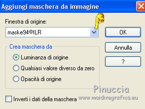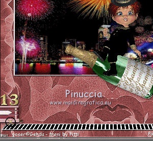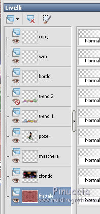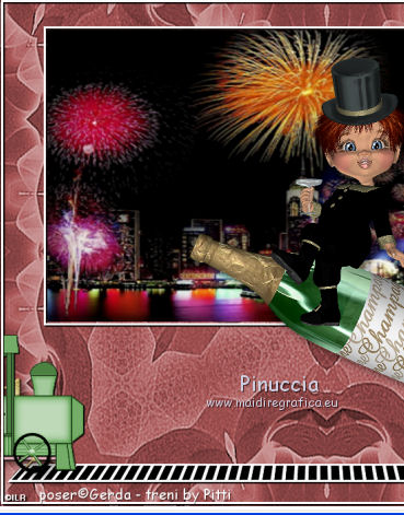 qui puoi trovare qualche risposta ai tuoi dubbi. Se l'argomento che ti interessa non è presente, ti prego di segnalarmelo. Questo tutorial è stato creato con PSP X2, ma può essere eseguito anche con le altre versioni di PSP. Per tradurlo, ho usato PSP X. Se stai usando le nuove versioni di PSP, a proposito delle funzioni Rifletti/Capovolgi, vedi la mia scheda qui Grazie ai creatori dei tubes che mettono a disposizione il loro lavoro in vari gruppi di condivisione. Rispetta il lavoro degli autori, non cambiare il nome del file e non cancellare il watermark. Occorrente: Un tube di sfondo e un personaggio. Il resto del materiale qui Per i poser usati grazie Gerda. qui. (I tubes per realizzare il trenino sono Per il frattale grazie http://www.baerbel-murnau.de/ Bärbel Filtri: Xero - Improver qui Animation Shop qui Apri la maschera in PSP e minimizzala con il resto del materiale. 1. Scegli due colori dai tuoi tubes. Imposta il colore di primo piano con il colore chiaro, e il colore di sfondo con il colore scuro. Per il mio esempio. ![]() Apri una nuova immagine trasparente 900 x 700 pixels, e riempila con il colore di sfondo.Livelli>Nuovo livello raster. Riempi con il colore di primo piano.Livelli>Nuovo livello maschera>Da immagine. Apri il menu sotto la finestra di origine e vedrai la lista dei files aperti. Seleziona la maschera "maske94©ILR", con i seguenti settaggi. ![]() Livelli>Unisci>Unisci gruppo. 2. Apri "Apophysis-213-bd-28-8-13" e vai a Modifica>Copia. Torna al tuo lavoro e vai a Modifica>Incolla come nuovo livello. Livelli>Disponi>Sposta giù. Cambia la modalità di miscelatura di questo livello in Luminanza. Effetti>Effetti di bordo>Aumenta. Livelli>Unisci>Unisci giù. Attiva il livello superiore. Effetti>Effetti 3D>Sfalsa ombra. ![]() 3. Attiva lo strumento Bacchetta magica ![]() e clicca sul ritaglio della maschera. ![]() Selezione>Modifica>Espandi - 3 pixels. ![]() Livelli>Nuovo livello raster. Livelli>Disponi>Sposta giù. Riempi con il colore di sfondo.(o, come nel mio esempio, con il colore nero). Livelli>Nuovo livello raster. Apri il tuo tube di sfondo e vai a Modifica>Copia. Torna al tuo lavoro e vai a Modifica>Incolla nella selezione. Selezione>Deseleziona. (oppure, come ho fatto io: Modifica>Incolla come nuovo livello. Immagine>Ridimensiona, se e quanto necessario, tutti i livelli non selezionato. Selezione>Inverti. Premi sulla tastiera il tasto CANC. Selezione>Deseleziona). Livelli>Unisci>Unisci giù. 4. Attiva lo strumento Selezione a mano libera ![]() e seleziona la parte inferiore della maschera. ![]() Livelli>Nuovo livello raster. Porta questo livello sotto il livello della maschera. Riempi la selezione con il colore di sfondoo, come nel mio esempio, con il colore nero Selezione>Deseleziona. Attiva il livello della maschera. Livelli>Unisci>Unisci giù. Attiva il livello superiore. Apri il tuo tube e vai a Modifica>Copia. Torna al tuo lavoro e vai a Modifica>Incolla come nuovo livello. Immagine>Ridimensiona, se e quanto necessario, tutti i livelli non selezionato. Effetti>Plugins>Xero - Improver. ![]() Effetti>Effetti 3D>Sfalsa ombra. ![]() Posiziona correttamente il tube.Apri il tuo treno. (il mio treno è composto da diverse parti e ha una dimensione di 810 x 190 pixels). Modifica>Copia. Torna al tuo lavoro e vai a Modifica>Incolla come nuovo livello. Livelli>Duplica, o usa un secondo treno. Sposta i treni sulle rotaie.Non preoccuparti troppo per la posizione, li sistemerai meglio più tardi. Attiva lo strumento Testo , font Britanic o quello che preferisci.Imposta il colore di sfondo con un motivo o con il tuo colore di sfondo. Chiudi il colore di primo piano. Scrivi "Goodbye2013" (regola le dimensioni in base alla versione di PSP che stai usando). Livelli>Converti in livello raster. Effetti>Effetti 3D>Smusso a incasso. ![]() Posiziona il testo sul treno.Livelli>Unisci>Unisci giù. Effetti>Effetti 3D>Sfalsa ombra, con i settaggi precedenti. Rinomina questo livello "treno 1". 6. Scrivi ora "Welcome 2014". Livelli>Converti in livello raster. Effetti>Effetti 3D>Smusso a incasso, con i settaggi precedenti. Attiva il livello del secondo treno. Immagine>Rifletti. Posiziona il testo sul treno.Livelli>Unisci>Unisci giù. Effetti>Effetti 3D>Sfalsa ombra, con i settaggi precedenti. Rinomina questo livello "treno 2" e chiudilo. Selezione>Seleziona tutto. Selezione>Modifica>Contrai - 10 pixels. Selezione>Inverti. Modifica>Copia. Modifica>Incolla come nuovo livello. Selezione>Deseleziona. Aggiungi il tuo nome e/o il tuo watermark su un nuovo livello, senza dimenticare eventuali copyright delle immagini usate. ![]() 7. Animazione. Attiva il livello "treno 1", e spostalo a destra, un po' fuori dai bordi,come nell'esempio. ![]() Chiudi il livello. Modifica>Copia Unione. Apri Animation Shop e vai a Modifica>Incolla>Incolla come nuova animazione. Torna in PSP. Apri il livello "treno 1" già correttamente posizionato. Modifica>Copia Unione. Torna in Animation Shop e vai a Modifica>Incolla>Incolla dopo il fotogramma corrente. Di nuovo in PSP. Effetti>Effetti di immagine>Scostamento. ![]() Modifica>Copia Unione. In Animation Shop: Modifica>Incolla>Incolla dopo il fotogramma corrente. 8. In PSP. Effetti>Effetti di immagine>Scostamento, con i settaggi precedenti. Modifica>Copia Unione. Torna in Animation Shop e vai a Modifica>Incolla>Incolla dopo il fotogramma corrente. 9. Ripeti il punto 8 finchè del treno sarà visibile soltanto la parte finale. ![]() In PSP. Chiudi il livello "treno 1". Modifica>Copia Unione. In Animation Shop: Modifica>Incolla>Incolla dopo il fotogramma corrente. A questo punto dovresti avere un'animazione composta da 13 fotogrammi. 10. In PSP. Apri il livello "treno 2", e posiziona il treno a sinistra,in modo che sia visibile soltanto la parte iniziale. ![]() Modifica>Copia Unione. In Animation Shop: Modifica>Incolla>Incolla dopo il fotogramma corrente. 11. In PSP. Effetti>Effetti di immagine>Scostamento. ![]() Modifica>Copia Unione. In Animation Shop: Modifi
