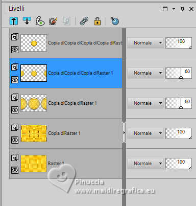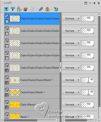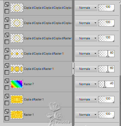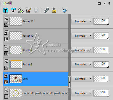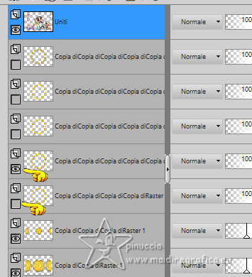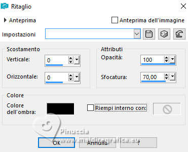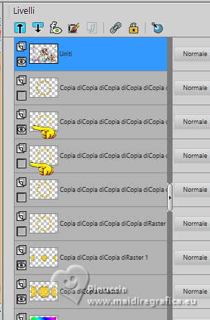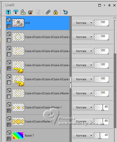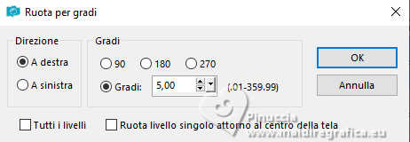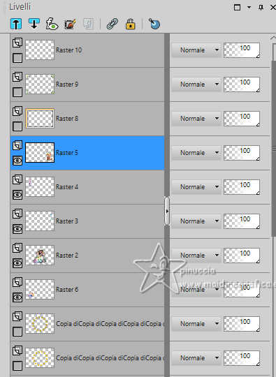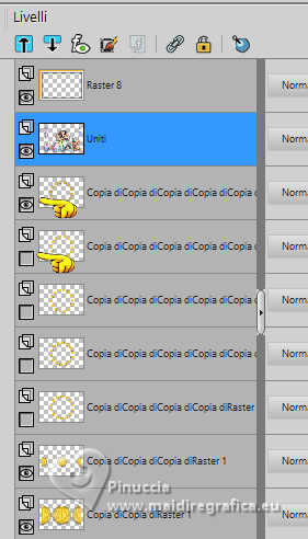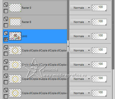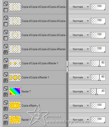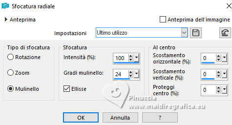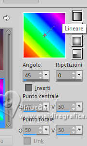 qui puoi trovare qualche risposta ai tuoi dubbi. Se l'argomento che ti interessa non è presente, ti prego di segnalarmelo. Questo tutorial è stato realizzato con PSP2019 e tradotto con PSPX9 e PSP2020, ma può essere realizzato anche con le altre versioni di PSP. Dalla versione X4, il comando Immagine>Rifletti è stato sostituito con Immagine>Capovolgi in orizzontale, e il comando Immagine>Capovolgi con Immagine>Capovolgi in verticale. Nelle versioni X5 e X6, le funzioni sono state migliorate rendendo disponibile il menu Oggetti. Con la nuova versione X7, sono tornati Rifletti>Capovolgi, ma con nuove varianti. Vedi la scheda sull'argomento qui Grazie ai creatori dei tubes che mettono a disposizione il loro lavoro in vari gruppi di condivisione. Rispetta il lavoro degli autori, non cambiare il nome del file e non cancellare il watermark. traduzione francese qui traduzione inglese qui Le vostre versioni qui![]() Occorrente: Tube a scelta (il tube usato da Inge-Lore è sotto licenza) Il resto del materiale ![]() Per il mio esempio ho usato un tube di AigenbyCaz. (in questa pagina trovi i links ai siti dei creatori di tubes) ![]() in caso di dubbi, ricorda di consultare la mia sezione filtri qui Filters Unlimited 2.0 qui FM Tile Tools - Saturation Emboss qui Mehdi - Sorting Tiles qui Alien Skin Eye Candy 5 Impact - Glass qui Simple - Blintz, Top Left Mirror qui Mura's Meister - Copies qui AAA Frames - Foto Frame qui I filtri Simple si possono usare da soli o importati in Filters Unlimited (come fare vedi qui) Se un filtro fornito appare con questa icona Animation Shop qui ![]() non esitare a cambiare modalità di miscelatura e opacità secondo i colori utilizzati. ![]() Metti il gradiente Rainbow.jgd nella cartella Gradienti. Scegli dai tuoi tubes un colore chiaro e un colore scuro. ![]() 1. Apri una nuova immagine trasparente 1000 x 650 pixels. Selezione>Seleziona tutto. Riempi con uno dei tuoi colori.Livelli>Nuovo livello raster. Apri paper1 ![]() Modifica>Copia. Torna al tuo lavoro e vai a Modifica>Incolla nella selezione. Selezione>Deseleziona. Cambia la modalità di miscelatura di questo livello in Luminanza (esistente). Livelli>Unisci>Unisci giù. Effetti>Effetti di immagine>Motivo unico, con i settaggi standard. ![]() 2. Regola>Sfocatura>Sfocatura radiale. ![]() Effetti>Plugins>FM Tile Tools - Saturation Emboss, con i settaggi standard. ![]() Effetti>Plugins>Filters Unlimited 2.0 - Paper Texture - Structure Paper 2, con i settaggi standard. ![]() Effetti>Plugins>Mehdi - Sorting Tiles. ![]() Livelli>Duplica. Effetti>Plugins>Simple - Blintz. Modifica>Ripeti Blintz. 3. Effetti>Effetti di riflesso>Specchio rotante. ![]() Ripeti Effetti>Effetti di riflesso>Specchio rotante. ![]() Effetti>Effetti di bordo>Aumenta. Livelli>Duplica. Effetti>Plugins>Flaming Pear - Flexify 2. ![]() Immagine>Ridimensiona, al 70%, tutti i livelli non selezionato. Effetti>Effetti 3D>Sfalsa ombra, colore nero. ![]() 4. Effetti>Plugins>Alien Skin Eye Candy 5 Impact - Glass. ![]() Livelli>Duplica. Attiva il livello sottostante dell'originale. Effetti>Effetti di immagine>Motivo unico ![]() Attiva il livello superiore. Immagine>Ridimensiona, al 50%, tutti i livelli non selezionato. Livelli>Duplica. Attiva nuovamente il livello sottostante. Effetti>Effetti di immagine>Motivo unico, con i settaggi precedenti. ![]() 5. Abbassa l'opacità dei livelli Copia (2) e Copia (3) di Raster 1 al 60%. ![]() Attiva il livello superiore: Immagine>Ridimensiona, al 30%, tutti i livelli non selezionato. Effetti>Plugins>Mura's Meister - Copies. ![]() 6. Livelli>Duplica. Immagine>Ruota per gradi - 5 gradi a destra. ![]() Livelli>Duplica. Immagine>Ruota per gradi - 5 gradi a destra. Livelli>Duplica. Immagine>Ruota per gradi - 5 gradi a destra. Livelli>Duplica. Immagine>Ruota per gradi - 5 gradi a destra. Chiudi i livelli delle 4 copie. ![]() 7. Apri il tube principale e vai a Modifica>Copia. Torna al tuo lavoro e vai a Modifica>Incolla come nuovo livello. Immagine>Ridimensiona, quanto necessario, tutti i livelli non selezionato. Regola>Messa a fuoco>Metti a fuoco. Effetti>Effetti 3D>Sfalsa ombra, colore nero. ![]() Copia/incolla come nuovo livello i tubes accessori. ![]() Immagine>Ridimensiona, quanto necessario, tutti i livelli non selezionato. Regola>Messa a fuoco>Metti a fuoco. Effetti>Effetti 3D>Sfalsa ombra, colore nero. ![]() 8. Passa il colore di primo piano a Gradiente e seleziona il gradiente Rainbow, stile Lineare. ![]() Attiva il livello copia di Raster 1. Livelli>Nuovo livello raster. Riempi il livello con il gradiente.Abbassa l'opacità di questo livello al 40%. Attiva il livello superiore. Livelli>Nuovo livello raster. Selezione>Seleziona tutto. Effetti>Effetti 3D>Ritaglio. ![]() 9. Immagine>Dimensioni tela - 1100 x 750 pixels. ![]() Selezione>Inverti. Passa il colore di primo piano a Colore. Riempi con il colore chiaro.Selezione>Modifica>Contrai - 10 pixels. Passa nuovamente il colore di primo piano a Gradiente, e cambia i settaggi ![]() Riempi con il gradiente.Effetti>Plugins>AAA Frames - Foto Frame. ![]() Selezione>Deseleziona. 10. Apri deco 1 ![]() Modifica>Copia. Torna al tuo lavoro e vai a Modifica>Incolla come nuovo livello. Spostalo nell'angolo in alto a sinistra.Effetti>Plugins>Simple - Top Left Mirror. ![]() Immagine>Ridimensiona, 1000 pixels di larghezza, tutti i livelli selezionato. Firma il tuo lavoro su un nuovo livello. Chiudi i 6 livelli inferiori e i 3 o 4 (se hai aggiunto i watermarks) livelli superiori. Le 4 copie del cerchio sono ancora chiuse. Sono visibili soltanto i livelli del tube e degli accessori ![]() ![]() Rimani posizionato sull'ultimo livello visibile. Livelli>Unisci>Unisci visibile. ![]() Riapri i 6 livelli inferiori e i 4 livelli superiori (le 4 copie del cerchio sono sempre chiuse) ![]() ![]() 11. Modifica>Copia Speciale>Copia Unione. Apri Animation Shop e vai a Modifica>Incolla>Incolla come nuova animazione. Torna in PSP. Chiudi il livello Copia (4) di Raster 1. Apri il livello Copia (5) di