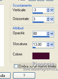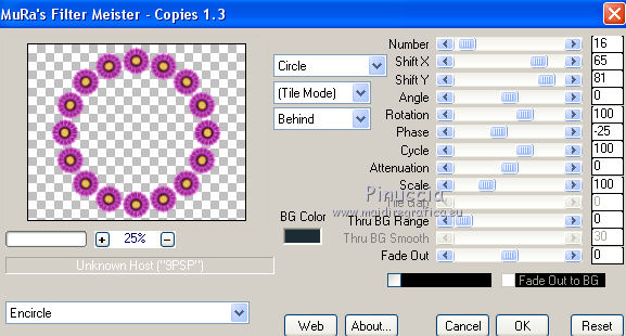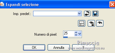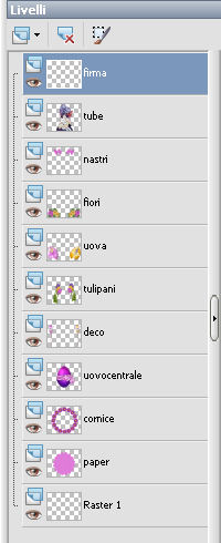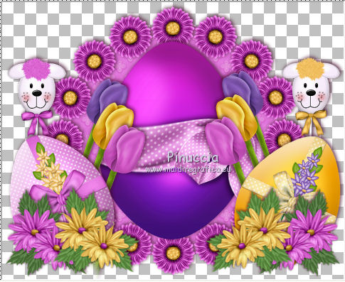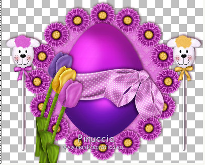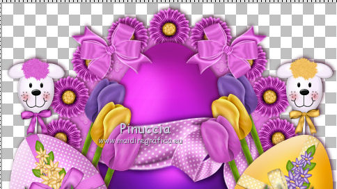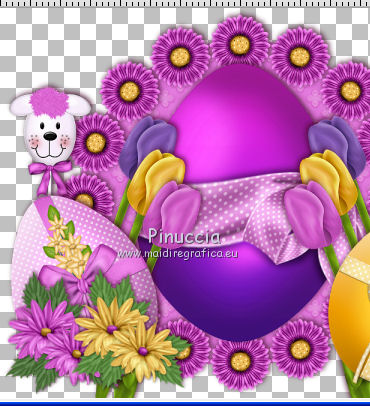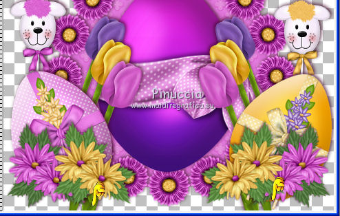 qui puoi trovare qualche risposta ai tuoi dubbi. Se l'argomento che ti interessa non è presente, ti prego di segnalarmelo. Questo tutorial è stato creato con PSP X5, ma può essere eseguito anche con le altre versioni di PSP. Per tradurlo, ho usato PSP X. Se stai usando le nuove versioni di PSP, a proposito delle funzioni Rifletti/Capovolgi, vedi la mia scheda qui Grazie ai creatori dei tubes che mettono a disposizione il loro lavoro in vari gruppi di condivisione. Rispetta il lavoro degli autori, non cambiare il nome del file e non cancellare il watermark. Occorrente: Un tube a scelta. Gli elementi scrap sono una creazione di Sylvie Gli elementi usati nel tutorial qui Per il bel tube usato grazie Gabry. Filtri: Mura's Meister - Copies qui Il materiale fornito può essere colorizzato. Prendi nota dei valori di Tonalità (H) e Saturazione (S) del colore scelto, Regola>Tonalità e Saturazione>Viraggio, e trascrivi i valori annotati nelle rispettive caselle. ![]() Se il risultato visibile nella finestra di anteprima non ti soddisfa, puoi giocare con il valore di Saturazione. ***** 1. Per colorizzare, scegli un colore medio dal tuo tube. Apri una nuova immagine trasparente 800 x 650 pixels. Apri "FM-Sweet-Easter-Element 14" e vai a Modifica>Copia. Torna al tuo lavoro e vai a Modifica>Incolla come nuovo livello. Immagine>Ridimensiona, 2 volte al 70% e una volta all'80%, tutti i livelli non selezionato. Effetti>Plugins>Mura's Meister - Copies. ![]() Regola>Messa a fuoco>Metti a fuoco. 2. Attiva lo strumento Bacchetta magica ![]() e clicca al centro della cornice per selezionarla. Selezione>Modifica>Espandi - 25 pixels. ![]() Apri Paper20 e vai a Modifica>Copia. Torna al tuo lavoro e vai a Modifica>Incolla come nuovo livello. Livelli>Disponi>Sposta giù. Selezione>Inverti. Premi sulla tastiera il tasto CANC ![]() Selezione>Deseleziona. Attiva il livello superiore della cornice. Effetti>Effetti 3D>Sfalsa ombra, con un colore molto scuro scelto dalla tua immagine. ![]() Apri "element 73" e vai a Modifica>Copia. Torna al tuo lavoro e vai a Modifica>Incolla come nuovo livello. Regola>Messa a fuoco>Metti a fuoco. Effetti>Effetti 3D>Sfalsa ombra, con i settaggi precedenti. 3. Apri Element 64 e vai a Modifica>Copia. Torna al tuo lavoro e vai a Modifica>Incolla come nuovo livello. Immagine>Ridimensiona, al 70%, tutti i livelli non selezionato. Sposta l'elemento a sinistra.Regola>Messa a fuoco>Metti a fuoco. Effetti>Effetti 3D>Sfalsa ombra, con i settaggi precedenti. Apri Element 65 e vai a Modifica>Copia. Torna al tuo lavoro e vai a Modifica>Incolla come nuovo livello. Immagine>Ridimensiona, al 70%, tutti i livelli non selezionato. Regola>Messa a fuoco>Metti a fuoco. Effetti>Effetti 3D>Sfalsa ombra, con i settaggi precedenti. Sposta l'elemento a destra.![]() Livelli>Unisci>Unisci giù. 4. Copia e incolla sul tuo lavoro i tre tulipani - element 67, 68, 69. Immagine>Ridimensiona, al 70%, tutti i livelli non selezionato. Regola>Messa a fuoco>Metti a fuoco. Effetti>Effetti 3D>Sfalsa ombra, con i settaggi precedenti. Posiziona i fiori a sinistra.![]() Assicurati di essere posizionato sul livello superiore. Livelli>Unisci>Unisci giù - 2 volte. Livelli>Duplica. Immagine>Rifletti. Posiziona correttamente questi tulipani a destra.Livelli>Unisci>Unisci giù. Apri element76 e vai a Modifica>Copia. Torna al tuo lavoro e vai a Modifica>Incolla come nuovo livello. Immagine>Ridimensiona, al 70%, tutti i livelli non selezionato. Immagine>Ruota per gradi - 25 gradi a sinistra. ![]() Regola>Messa a fuoco>Metti a fuoco. Effetti>Effetti 3D>Sfalsa ombra, con i settaggi precedenti. Sposta l'elemento a sinistra.5. Apri element77 e vai a Modifica>Copia. Torna al tuo lavoro e vai a Modifica>Incolla come nuovo livello. Immagine>Ridimensiona, al 70%, tutti i livelli non selezionato. Immagine>Ruota per gradi - 25 gradi a destra. ![]() Regola>Messa a fuoco>Metti a fuoco. Effetti>Effetti 3D>Sfalsa ombra, con i settaggi precedenti. Sposta l'elemento a destra.Livelli>Unisci>Unisci giù. Apri Element5 e vai a Modifica>Copia. Torna al tuo lavoro e vai a Modifica>Incolla come nuovo livello. Immagine>Ridimensiona, 2 volte al 70%, tutti i livelli non selezionato. Immagine>Ruota per gradi - 25 gradi a sinistra. ![]() Regola>Messa a fuoco>Metti a fuoco. Effetti>Effetti 3D>Sfalsa ombra, con i settaggi precedenti. Sposta l'elemento nell'angolo in basso a sinistra.Regola>Messa a fuoco>Metti a fuoco. Effetti>Effetti 3D>Sfalsa ombra, con i settaggi precedenti. Apri Element7 e vai a Modifica>Copia. Torna al tuo lavoro e vai a Modifica>Incolla come nuovo livello. Immagine>Ridimensiona, 2 volte al 70%, tutti i livelli non selezionato. Immagine>Ruota per gradi - 25 gradi a sinistra. ![]() Regola>Messa a fuoco>Metti a fuoco. Effetti>Effetti 3D>Sfalsa ombra, con i settaggi precedenti. Sposta l'elemento a sinistra, accanto all'elemento precedente.![]() 6. Livelli>Unisci>Unisci giù. Livelli>Duplica. Immagine>Rifletti. Posiziona correttamente questi fiori a destra.Livelli>Unisci>Unisci giù. Attiva lo strumento Gomma ![]() Posizionati sul livello dei tulipani e cancella la parte visibile sotto i fiori. ![]() Dovresti avere questo. ![]() Attiva nuovamente il livello superiore. Apri Element49 e vai a Modifica>Copia. Torna al tuo lavoro e vai a Modifica>Incolla come nuovo livello. Immagine>Ridimensiona, una volta al 50% e una volta al 70%, tutti i livelli non selezionato. Immagine>Ruota per gradi - 25 gradi a sinistra. ![]() Regola>Messa a fuoco>Metti a fuoco. Effetti>Effetti 3D>Sfalsa ombra, con i settaggi precedenti. Sposta l'elemento in alto a sinistra.Livelli>Duplica. Immagine>Rifletti. Posiziona correttamente il nastro a destra.![]() Livelli>Unisci>Unisci giù. Apri il tuo tube e vai a Modifica>Copia. Torna al tuo lavoro e vai a Modifica>Incolla come nuovo livello. Immagine>Ridimensiona, se e quanto necessario, tutti i livelli non selezionato. Regola>Messa a fuoco>Metti a fuoco. Effetti>Effetti 3D>Sfalsa ombra, con i settaggi precedenti. Aggiungi i