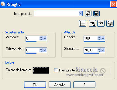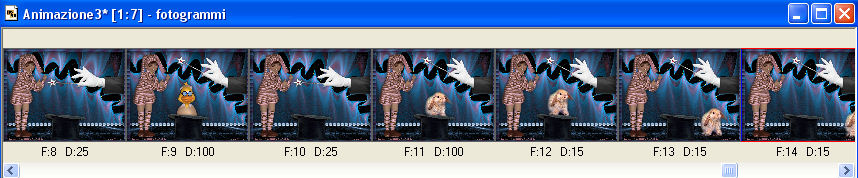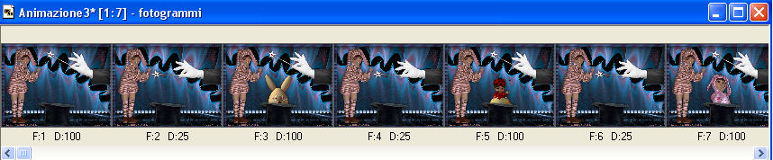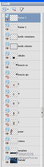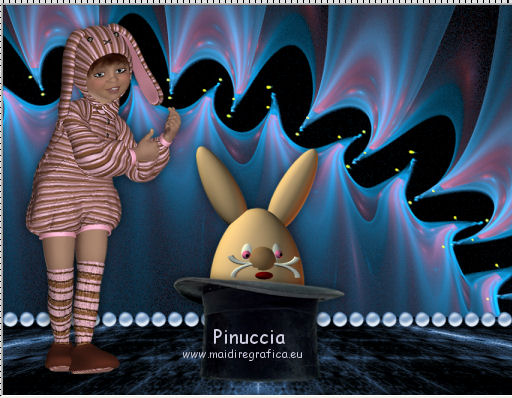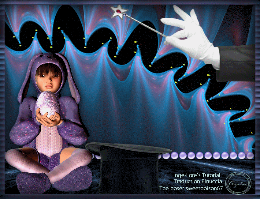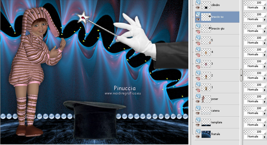 qui puoi trovare qualche risposta ai tuoi dubbi. Se l'argomento che ti interessa non è presente, ti prego di segnalarmelo. Questo tutorial è stato creato con PSP X5, ma può essere eseguito anche con le altre versioni di PSP. Per tradurlo, ho usato PSP X. Se stai usando le nuove versioni di PSP, a proposito delle funzioni Rifletti/Capovolgi, vedi la mia scheda qui Grazie ai creatori dei tubes che mettono a disposizione il loro lavoro in vari gruppi di condivisione. Rispetta il lavoro degli autori, non cambiare il nome del file e non cancellare il watermark. Occorrente: A scelta tubes accessori in tema, e un personaggio. Il resto del materiale qui Grazie per il tube Gerda, per il frattale Bärbel e per il braccio Mentali Filtri: Xero - Improver qui Mura's Meister - Perspective Tiling qui Animation Shop qui *** Il materiale fornito può essere colorizzato. Prendi nota dei valori di Tonalità (H) e Saturazione (S) del colore scelto, Regola>Tonalità e Saturazione>Viraggio, e trascrivi i valori annotati nelle rispettive caselle. ![]() Se il risultato visibile nella finestra di anteprima non ti soddisfa, puoi giocare con il valore di Saturazione. ***** 1. Scegli un colore medio dal tuo materiale. Apri una nuova immagine trasparente 850 x 650 pixels. Selezione>Seleziona tutto. Apri "fire-fractal-103-bd-17-9-13" e vai a Modifica>Copia. Torna al tuo lavoro e vai a Modifica>Incolla nella selezione. Selezione>Deseleziona. Apri "template-51-bd-18-10-13" e vai a Modifica>Copia. Torna al tuo lavoro e vai a Modifica>Incolla come nuovo livello. Effetti>Plugins>Mura's Meister - Perspective Tiling ![]() Apri "06_077" e vai a Modifica>Copia. Torna al tuo lavoro e vai a Modifica>Incolla come nuovo livello. Spostalo in basso, sulla linea del filtro Mura's.![]() 2. Apri "Top_Hat" (cilindro) e vai a Modifica>Copia. Torna al tuo lavoro e vai a Modifica>Incolla come nuovo livello. Immagine>Ridimensiona, al 75%, tutti i livelli non selezionato. Spostalo in basso al centro,non troppo attaccato al bordo. ![]() Regola>Messa a fuoco>Metti a fuoco. Effetti>Effetti 3D>Sfalsa ombra. ![]() Apri il primo tube, che più tardi dovrà uscire dal cilindro. Modifica>Copia. Torna al tuo lavoro e vai a Modifica>Incolla come nuovo livello. Immagine>Ridimensiona, se e quanto necessario, tutti i livelli non selezionato. Livelli>Disponi>Sposta giù. Posiziona il tube dietro al cilindro.![]() Effetti>Plugins>Xero - Improver. ![]() Effetti>Effetti 3D>Sfalsa ombra, con i settaggi precedenti. Rinomina questo livello "1", e rimani su questo livello. Copia e incolla il tube successivo. Immagine>Ridimensiona, se e quanto necessario. Spostalo ditro il cilindro.Effetti>Plugins>Xero - Improver, con i settaggi precedenti. Effetti>Effetti 3D>Sfalsa ombra, con i settaggi precedenti. Rinomina questo livello "2". Ripeti il passaggio con altri due tube. Apri il quinto tube - fornito con il materiale - "Hase" Modifica>Copia. Torna al tuo lavoro e vai a Modifica>Incolla come nuovo livello. Immagine>Ridimensiona, a tuo piacimento. Posiziona il tube dietro al cilindro.Effetti>Plugins>Xero - Improver, con i settaggi precedenti. Effetti>Effetti 3D>Sfalsa ombra, con i settaggi precedenti. Rinomina questo livello "5", Chiudi i livelli questi 5 livelli. Apri il tuo tube per la parte sinistra, e vai Modifica>Copia. Torna al tuo lavoro e vai a Modifica>Incolla come nuovo livello. Immagine>Ridimensiona, se e quanto necessario, tutti i livelli non selezionato. Posiziona il tube dietro al cilindro.Effetti>Plugins>Xero - Improver, con i settaggi precedenti. Effetti>Effetti 3D>Sfalsa ombra, con i settaggi precedenti. Per visualizzare meglio cosa ho ottenuto finora, ho lasciato visibile il livello del primo tube. ![]() 4. Copia e incolla sul tuo lavoro il livello Raster 1 del tube "mentali-paques9". Spostalo a destra.Copia e incolla sul tuo lavoro il livello Raster 2 del tube "mentali-paques9". Spostalo a destra, sopra il primo braccio.Apri e chiudi a ripetizione questi due livelli, per controllare la fluidità del movimento che otterrai con l'animazione, e assicurarti che non ci siano "salti". Su entrambi i livelli ripeti il filtro Improver e l'Effetto Sfalsa ombra. Rinomina i livelli "braccio giù" e "braccio su", e chiudi il livello "braccio giù". ![]() 5. Attiva il livello inferiore. Selezione>Seleziona tutto. Immagine>Ritaglia la selezione. Selezione>Modifica>Contrai - 15 pixels. ![]() Selezione>Inverti. Selezione>Innalza selezione a livello. Livelli>Disponi>Porta in alto. Regola>Sfocatura>Sfocatura gaussiana - raggio 15. ![]() Effetti>Effetti di trama>Veneziana. ![]() Per "illuminare" il bordo: Livelli>Nuovo livello raster. Livelli>Disponi>Sposta giù, e riempi il livello con il tuo colore.Selezione>Inverti. Effetti>Effetti 3D>Ritaglio. ![]() Selezione>Deseleziona. Aggiungi il tuo nome e/o il tuo watermark su un nuovo livello, senza dimenticare eventuali copyright delle immagini usate. ![]() 6. Animazione. Modifica>Copia Unione. Apri Animation Shop e vai a Modifica>Incolla>Incolla come nuova animazione. Animazione>Proprietà fotogramma - e imposta la velocità a 100. ![]() (per semplificare le procedure, applicheremo la velocità per ogni fotogramma). Torna in PSP. Chiudi "braccio su" e apri "braccio giù". Modifica>Copia Unione. Torna in Animation Shop e vai a Modifica>Incolla>Incolla dopo il fotogramma corrente. Animazione>Proprietà fotogramma, e imposta la velocità a 25. ![]() In PSP. Chiudi "braccio giù" e apri "braccio su". Apri il livello "1". Modifica>Copia Unione. In Animation Shop: Modifica>Incolla>Incolla dopo il fotogramma corrente. Animazione>Proprietà fotogramma, e imposta la velocità a 100. 7. In PSP. Chiudi i livelli "braccio su" e "1", e apri il livello "braccio giù". Modifica>Copia Unione. Torna in Animation Shop e vai a Modifica>Incolla>Incolla dopo il fotogramma corrente. Animazione>Proprietà fotogramma, e imposta la velocità a 25. In PSP. Chiudi "braccio giù" e apri i livelli "braccio su" e "2". Modifica>Copia Unione. In Anima