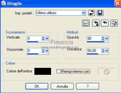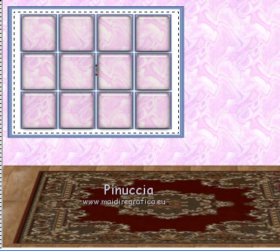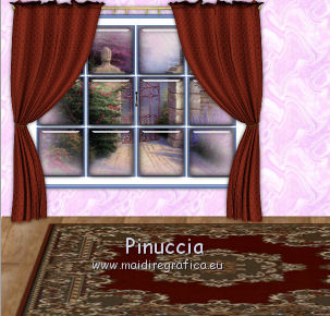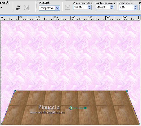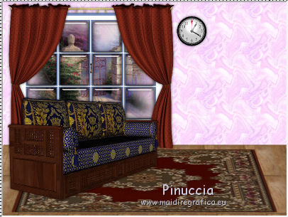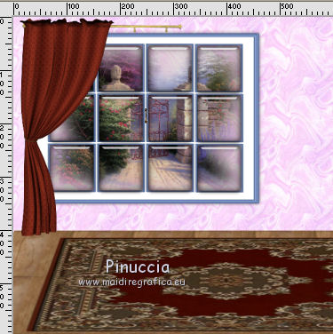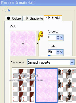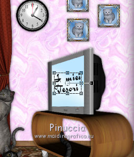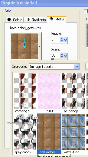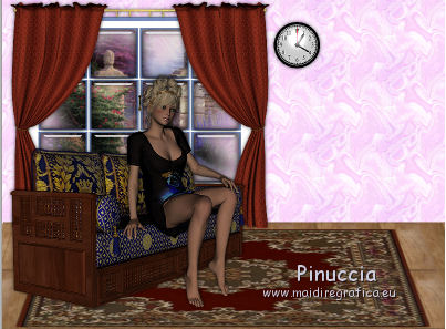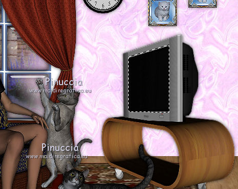 qui puoi trovare qualche risposta ai tuoi dubbi. Se l'argomento che ti interessa non è presente, ti prego di segnalarmelo. Questo tutorial è stato creato con PSP X2, ma può essere eseguito anche con le altre versioni di PSP. Per tradurlo, ho usato PSP X. Il materiale viene da vari gruppi di condivisione. Il copyright appartiene ai rispettivi autori. Grazie ai creatori dei tubes che mettono a disposizione il loro lavoro in vari gruppi di condivisione. Rispetta il lavoro degli autori, non cambiare il nome del file e non cancellare il watermark. Occorrente: Tubes di paesaggi a scelta. Il resto del materiale qui Per i poser utilizzati grazie Lill. Il paesaggio è di Montana Kate. Animation Shop qui Apri i motivi in PSP e minimizzali. Li troverai nella lista dei motivi disponibili quando ti serviranno. Le descrizioni nel tutorial riguardano il materiale usato per l'esempio. Se stai usando materiale diverso, adatta le istruzioni al tuo materiale. 1. Apri una nuova immagine trasparente 800 x 600 pixels. Passa il colore di primo piano a Motivi, apri il menu e nella categoria Immagini aperti seleziona il motivo Muster 2503, con i seguenti settaggi. ![]() Riempi l'immagine trasparente con il motivo.2. Livelli>Nuovo livello raster. Attiva lo strumento Selezione , rettangolo,e traccia un rettangolo in fondo. ![]() Cambia il motivo con Holzhachel gemustert. ![]() Riempi la selezione con il motivo.Selezione>Deseleziona. Premi il tasto K per attivare lo strumento Puntatore ![]() se stai usando PSP 9 il tasto D (valido per tutte le versioni) per attivare lo strumento Deformazione ![]() in modalità Prospettiva spingi verso l'interno il nodo superiore esterno, per dare un senso di prospettiva al "pavimento". ![]() Poi in modalità Scala allarga l'immagine fino ai bordi. ![]() 2. Apri il tube del tappeto "rug" e vai a Modifica>Copia. Torna al tuo lavoro e vai a Modifica>Incolla come nuovo livello. Immagine>Ridimensiona, quanto necessario, e, con il sistema usato per il pavimento, adatta il tappeto, pressappoco come nel mio esempio. ![]() Apri "fenster©ILR" e vai a Modifica>Copia. Torna al tuo lavoro e vai a Modifica>Incolla come nuovo livello. Immagine>Ridimensiona, una volta al 60%, e una volta al 90%, tutti i livelli non selezionato. Sposta la finestra in alto a sinistra.Livelli>Nuovo livello raster. Livelli>Disponi>Sposta giù. Attiva lo strumento Selezione , rettangolo,e traccia una selezione intorno alla finestra ![]() Apri il tuo paesaggio e vai a Modifica>Copia. Torna al tuo lavoro e vai a Modifica>Incolla nella selezione. Selezione>Deseleziona. 3. Apri "vorhang-9.11.2" e vai a Modifica>Copia. Torna al tuo lavoro e vai a Modifica>Incolla come nuovo livello. Immagine>Ridimensiona, al 50%, tutti i livelli non selezionato. Regola>Messa a fuoco>Metti a fuoco. Sposta la tenda a sinistra della finestra.![]() Livelli>Duplica. Immagine>Rifletti. Sposta questa tenda a sinistra.Se necessario seleziona la parte finale![]() Premi sulla tastiera il tasto CANC. Selezione>Deseleziona. ![]() Livelli>Unisci>Unisci giù. Effetti>Effetti 3D>Sfalsa ombra. ![]() Apri Uhr e vai a Modifica>Copia. Torna al tuo lavoro e vai a Modifica>Incolla come nuovo livello. Immagine>Ridimensiona, una volta al 20%, e una volta al 70%, tutti i livelli non selezionato. Sposta l'orologio a destra sul muro.Regola>Messa a fuoco>Metti a fuoco. Effetti>Effetti 3D>Sfalsa ombra, con i settaggi precedenti. ![]() Apri il tube del sofà "moroco-benc-2" e vai a Modifica>Copia. Torna al tuo lavoro e vai a Modifica>Incolla come nuovo livello. Immagine>Ridimensiona, al 50%, tutti i livelli non selezionato. Sposta il divano in basso a sinistra.Regola>Messa a fuoco>Metti a fuoco. Effetti>Effetti 3D>Sfalsa ombra, con i settaggi precedenti. ![]() 4. Apri il tube "a4-honey-10-11-2" e vai a Modifica>Copia. Torna al tuo lavoro e vai a Modifica>Incolla come nuovo livello. Immagine>Ridimensiona, al 50%, tutti i livelli non selezionato. Immagine>Rifletti. Sposta il tube sul divano.Regola>Messa a fuoco>Metti a fuoco. Effetti>Effetti 3D>Sfalsa ombra, con i settaggi precedenti. ![]() Apri il tube "alice5" e vai a Modifica>Copia. Torna al tuo lavoro e vai a Modifica>Incolla come nuovo livello. Immagine>Ridimensiona, al 45%, tutti i livelli non selezionato. Spostalo accanto al tube precedente.Regola>Messa a fuoco>Metti a fuoco. Effetti>Effetti 3D>Sfalsa ombra, con i settaggi precedenti. ![]() Apri il tube della tv "room4-zub-bad27" e vai a Modifica>Copia. Torna al tuo lavoro e vai a Modifica>Incolla come nuovo livello. Immagine>Ridimensiona, al 50%, tutti i livelli non selezionato. Regola>Messa a fuoco>Metti a fuoco. Effetti>Effetti 3D>Sfalsa ombra, con i settaggi precedenti. Sposta il mobile a destra.Premi il tasto K/D e usando, secondo la necessità, la modalità Inclinazione e Scala, dai un senso di prospettiva alla tv. ![]() 5. Apri il tube del gatto "torty-8.11" e vai a Modifica>Copia. Torna al tuo lavoro e vai a Modifica>Incolla come nuovo livello. Immagine>Ridimensiona, al 30%, tutti i livelli non selezionato. Regola>Messa a fuoco>Metti a fuoco. Effetti>Effetti 3D>Sfalsa ombra, con i settaggi precedenti. Sposta il gatto accanto al tube.Nella paletta dei livelli porta questo livello sotto il livello del tube della donna. ![]() Attiva il livello superiore. Apri il tube del secondo gatto "grey-tabby-8.11.2" e vai a Modifica>Copia. Torna al tuo lavoro e vai a Modifica>Incolla come nuovo livello. Immagine>Ridimensiona, al 25%, tutti i livelli non selezionato. Regola>Messa a fuoco>Metti a fuoco. Effetti>Effetti 3D>Sfalsa ombra, con i settaggi precedenti. Sposta il gatto dove preferisci o vedi il mio esempio.![]() Se vuoi aggiungi dei quadretti sulle pareti. Per il mio esempio ho usato "katze-1-bd-3-5-10". ![]() Controlla che tutto sia correttamente posizionato. Se vuoi puoi ancora spostare gli elementi della tua tag per sistemarli meglio. Quando sei soddisfatto: Livelli>Unisci>Unisci visibile. A questo punto scegli le immagini che vuoi vedere nella tua "tv". 6.