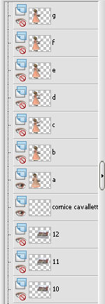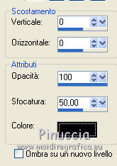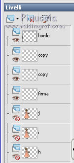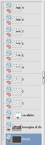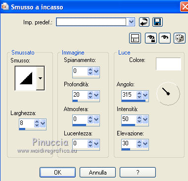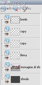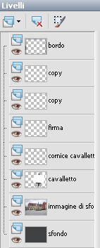 qui puoi trovare qualche risposta ai tuoi dubbi. Se l'argomento che ti interessa non è presente, ti prego di segnalarmelo. Questo tutorial è stato creato con PSP X2 e tradotto con PSPX, ma può essere eseguito anche con le altre versioni di PSP. Dalla versione X4, il comando Immagine>Rifletti è stato sostituito con Immagine>Capovolgi in orizzontale, e il comando Immagine>Capovolgi con Immagine>Capovolgi in verticale. Nelle versioni X5 e X6, le funzioni sono state migliorate rendendo disponibile il menu Oggetti. Con la versione X7 sono tornati i comandi Immagine>Rifletti e Immagine>Capovolgi, ma con nuove funzioni. Vedi la scheda sull'argomento qui traduzione francese qui Le vostre versioni qui Occorrente: Materiale qui Per i poser grazie Batschi Per l'immagine di sfondo grazie Baerbel. Filtri: Xero - Improver qui Animation shop qui ![]() 1. Apri una nuova immagine trasparente 800 x 600 pixels. Scegli un colore chiaro dalla tua immagine di sfondo, e riempi l'immagine trasparente con questo colore.Livelli>Nuovo livello raster. Selezione>Seleziona tutto. Apri "haus-13-bd-12-9-09" e vai a Modifica>Copia. Torna al tuo lavoro e vai a Modifica>Incolla nella selezione. Selezione>Deseleziona. 2. Apri "easelNV0904" e vai a Modifica>Copia. Torna al tuo lavoro e vai a Modifica>Incolla come nuovo livello. Immagine>Ridimensiona, al 90%, tutti i livelli non selezionato. ![]() Sposta il cavalletto un po' più a destra, ma non troppo vicino al bordo.Tieni presente che non potrai più spostarlo. Attiva lo strumento Selezione a mano libera , da punto a punto,e seleziona lo spazio bianco della tela. ![]() Livelli>Nuovo livello raster. Attiva nuovamente l'immagine di sfondo e vai a Modifica>Copia. Torna al tuo lavoro e vai a Modifica>Incolla nella selezione. Livelli>Nuovo livello raster. Selezione>Modifica>Seleziona bordature selezione. ![]() Riempi la selezione con un colore scuro del cavalletto,per il mio esempio ho scelto un grigio scuro. Effetti>Effetti 3D>Smusso a incasso. ![]() Selezione>Deseleziona. 3. Attiva il livello sottostante dell'immagine. Effetti>Plugins>Xero - Improver: ![]() Livelli>Duplica. Attenzione, d'ora in poi dovrai chiudere il livello duplicato e lavorare sul livello sottostante dell'originale. Pertanto, chiudi questo livello e attiva il livello originale. Attiva lo strumento Gomma , dimensione 50,e cancella una piccola parte dell'immagine. ![]() Livelli>Duplica. Chiudi questo livello e attiva il livello sottostante. Cancella e cancella un'altra parte dell'immagine.![]() Livelli>Duplica. Chiudi questo livello e attiva il livello sottostante. Cancella ancora un pezzo dell'immagine.![]() E continua così finchè non rimane visibile soltanto un piccolo angolo dell'immagine. ![]() Rinomina i livelli dal basso in alto; nel mio esempio ho 12 livelli rinominati da 1 a 12. 4. Adesso inizia a copiare i poser della piccola pittrice, usando la tua fantasia. Puoi tenere il poser in una posizione fissa (come nel mio esempio), o puoi farlo muovere e tornare al cavalletto. Se vuoi, puoi anche ridimensionare i poser (nel mio esempio non l'ho fatto). L'ultimo poser da aggiungere è "paint1". Per ogni poser applica l'Effetto Improver, con i settaggi precedenti. E l'Effetto 3D>Sfalsa ombra, con i seguenti settaggi. ![]() Rinomina i livelli dei poser con le lettere dell'alfabeto (mel mio caso da A a J). 5. Quando hai finito, chiudi tutti i livelli dei poser, e attiva il livello dell'immagine di sfondo. Selezione>Seleziona tutto. Selezione>Modifica>Contrai - 15 pixels. ![]() Selezione>Inverti. Modifica>Copia. Attiva il livello superiore. Livelli>Nuovo livello raster. Modifica>Incolla nella selezione. Effetti>Effetti 3D>Sfalsa ombra, con i seguenti settaggi - 2 volte. ![]() Selezione>Deseleziona. Aggiungi il tuo nome e/o il tuo watermark su un nuovo livello, senza dimenticare i copyright delle immagini usate. Questa è la mia paletta dei livelli. ![]() ![]() ![]() La tua dipenderà dal numero e dalle posizioni dei poser che hai usato. 6. Animazione. Chiudi tutti i livelli dei poser, il livello del cavalletto, del bordo del cavalletto, e delle immagini cancellate sul cavalletto. Sono visibili soltanto questi livelli. ![]() Modifica>Copia Unione. Apri Animation Shop e vai a Modifica>Incolla>Incolla come nuova animazione. 7. Torna in PSP. Apri il livello del cavalletto e della cornice. ![]() Modifica>Copia Unione. Torna in Animation Shop e vai a Modifica>Incolla>Incolla dopo il fotogramma corrente. 8. Psp. Attiva il livello del primo poser. Abbassa l'opacità dell'immagine di sfondo al 60% (nel mio esempio non l'ho fatto). Modifica>Copia Unione. Animation Shop: Modifica>Incolla>Incolla dopo il fotogramma corrente. Psp. Chiudi il livello del primo poser, e apri il livello del secondo poser. Modifica>Copia Unione. Animation Shop: Modifica>Incolla>Incolla dopo il fotogramma corrente. In PSP. Adesso puoi iniziare ad aprire i livelli delle immagini cancellate, cominciando dal livello "1". Seguendo il tuo progetto, scegli di volta in volta il livello del poser in modo da creare un'animazione il più possibile realistica. A chiudere l'animazione, l'ultimo livello sarà con il poser "paint1". ![]() Modifica>Seleziona tutto. Animazione>Proprietà fotogramma e imposta la velocità a 45. ![]() Seleziona i primi tre fotogrammi. Animazione>Proprietà fotogramma, e imposta la velocità a 100. Clicca sull'ultimo fotogramma per selezionarlo. Animazione>Proprietà fotogramma e imposta la velocità a 500. Controlla il risultato cliccando su Visualizza e salva in formato gif.![]() Se hai problemi o dubbi, o trovi un link non funzionante, o anche soltanto per un saluto, scrivimi. 2 Ottobre 2010 |