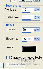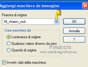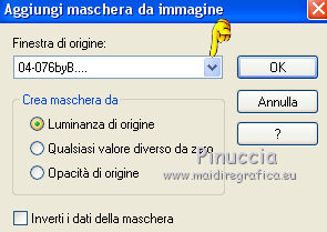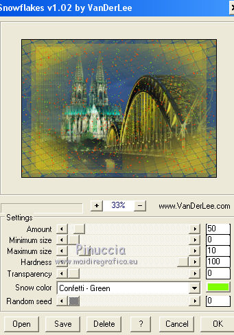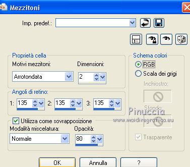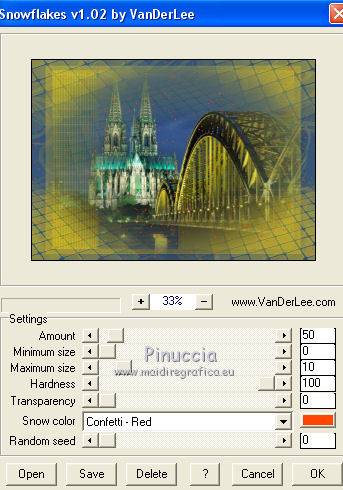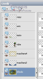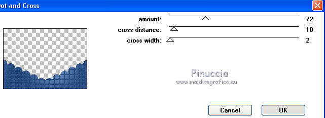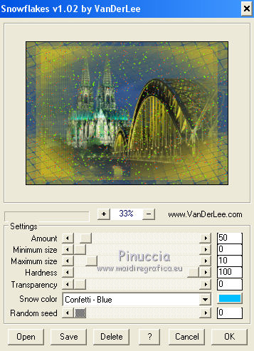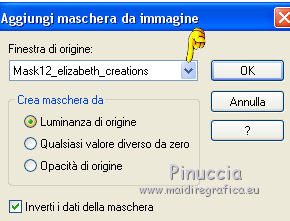 qui puoi trovare qualche risposta ai tuoi dubbi. Se l'argomento che ti interessa non è presente, ti prego di segnalarmelo. Questo tutorial è stato creato con PSP X5, ma può essere eseguito anche con le altre versioni di PSP. Per tradurlo, ho usato PSP X. Se stai usando le nuove versioni di PSP, a proposito delle funzioni Rifletti/Capovolgi, vedi la mia scheda qui Grazie ai creatori dei tubes che mettono a disposizione il loro lavoro in vari gruppi di condivisione. Rispetta il lavoro degli autori, non cambiare il nome del file e non cancellare il watermark. Occorrente: Un tube a scelta. Il resto del materiale qui Per il poser grazie Gerda Filtri: Xero - Improver qui VDL Adrenaline - Snowflakes qui Penta.com - Dot and Cross qui Animation Shop qui Apri le maschere in PSP e minimizzale con il resto del materiale. 1. Scegli due colori dal tuo tube, e imposta il colore di primo piano con il colore chiaro, e il colore di sfondo con il colore scuro. I miei colori. ![]() Apri una nuova immagine trasparente 850 x 600 pixels, e riempila con il colore scuro di sfondo.Livelli>Nuovo livello raster. Riempi con il colore di primo piano.Livelli>Nuovo livello maschera>Da immagine. Apri il menu sotto la finestra di origine e vedrai la lista dei files aperti. Seleziona la maschera 04-076byB, con i seguenti settaggi. ![]() Livelli>Unisci>Unisci gruppo. Effetti>Effetti di bordo>Aumenta. 2. Livelli>Nuovo livello raster. Riempi con il colore di primo piano.Livelli>Nuovo livello maschera>Da immagine. Apri il menu sotto la finestra di origine e seleziona la maschera 34_sharev_msk, con i seguenti settaggi. ![]() Livelli>Unisci>Unisci gruppo. Effetti>Effetti di bordo>Aumenta. Effetti>Effetti di immagine>Motivo unico, con i settaggi standard. ![]() Apri il tuo tube di sfondo e vai a Modifica>Copia. Torna al tuo lavoro e vai a Modifica>Incolla come nuovo livello. Posiziona il tube al centro,in modo che copra tutta l'immagine. 3. Livelli>Nuovo livello raster. Riempi con il colore di sfondo.Livelli>Nuovo livello maschera>Da immagine. Apri il menu sotto la finestra di origine e seleziona la maschera 3Mask12_elisabeth_creation, con i seguenti settaggi. ![]() Livelli>Unisci>Unisci gruppo. Spingi la maschera fino a 425 pixel,(se non visualizzi i righelli, vai a Visualizza>Righelli). ![]() Livelli>Duplica. Immagine>Rifletti. Posiziona correttamente il duplicato.![]() Livelli>Unisci>Unisci giù. 4. Effetti>Plugins>Penta.com - Dot and Cross, con i settaggi standard. ![]() Effetti>Effetti 3D>Sfalsa ombra, con un colore molto scuro scelto dalla tua immagine. ![]() Livelli>Nuovo livello raster. Riempi con il colore di primo piano.Livelli>Nuovo livello maschera>Da immagine. Apri il menu sotto la finestra di origine e seleziona la maschera maske©96ILR, con i seguenti settaggi. ![]() Livelli>Unisci>Unisci gruppo. Effetti>Effetti artistici>Mezzitoni. ![]() Effetti>Effetti 3D>Sfalsa ombra. ![]() 5. Apri il tuo tube e vai a Modifica>Copia. Torna al tuo lavoro e vai a Modifica>Incolla come nuovo livello. Immagine>Ridimensiona, se e quanto necessario, tutti i livelli non selezionato. Sposta il tube a destra.Effetti>Plugins>Xero - Improver. ![]() Effetti>Effetti 3D>Sfalsa ombra, con un colore molto scuro. ![]() Attiva lo strumento Testo , scegli un font,e scrivi un testo. Livelli>Converti in livello raster. Effetti>Effetti 3D>Sfalsa ombra. ![]() Ripeti Effetti>Effetti 3D>Sfalsa ombra, con i seguenti settaggi. ![]() Aggiungi il tuo nome e/o il tuo watermark su un nuovo livello, senza dimenticare eventuali copyright delle immagini usate. ![]() 6. Attiva il livello del tube di sfondo. Livelli>Unisci>Unisci giù 3 volte. ![]() Livelli>Duplica - 2 volte, e rinomina i livelli, dal basso in alto, "1", "2", e "3". Rimani posizionato sul livello "3". Effetti>Plugins>VanDerLee - Snowflakes se stai usando la versione meno recente (il risultato non cambia): Effetti>Plugins>VDL ADrenaline - Snowflakes ![]() Attiva il livello "2". Ripeti l'Effetto Snowflakes, cambiando il settaggio di Random Seed. Attiva il livello "1". Ripeti l'Effetto Snowflakes, cambiando il settaggo di Random Seed. 7. Rimani posizionato sul livello "1". Effetti>Plugins>VanDerLee - Snowflakes, con gli stessi settaggi, ma cambiando Snow color con Confetti-Green. ![]() Attiva il livello "2". Ripeti l'Effetto Snowflakes, cambiando il settaggio di Random Seed. Attiva il livello "3". Ripeti l'Effetto Snowflakes, cambiando il settaggo di Random Seed. 8. Rimani posizionato sul livello "3". Effetti>Plugins>VanDerLee - Snowflakes, con gli stessi settaggi, ma cambiando Snow color con Confetti-Blue. ![]() Attiva il livello "2". Ripeti l'Effetto Snowflakes, cambiando il settaggio di Random Seed. Attiva il livello "1". Ripeti l'Effetto Snowflakes, cambiando il settaggo di Random Seed. 9. Chiudi i livelli "2" e "3". Modifica>Copia Unione. Apri Animation Shop e vai a Modifica>Incolla>Incolla come nuova animazione. Torna in PSP. Chiudi il livello "1" e apri il livello "2". Modifica>Copia Unione. Torna in Animation Shop e vai a Modifica>Incolla>Incolla dopo il fotogramma corrente. Di nuovo in PSP. Chiudi il livello "2" e apri il livello "3". Modifica>Copia Unione. In Animation Shop: Modifica>Incolla>Incolla dopo il fotogramma corrente. 10. Modifica>Seleziona tutto. Animazione>Proprietà fotogramma, e imposta la velocità a 15. ![]() Controlla il risultato cliccando su Visualizza e salva in formato gif.![]() Le vostre versioni. Grazie ![]() Rossella ![]() Se hai problemi o dubbi, o trovi un link non funzionante, o anche soltanto per un saluto, scrivimi. 27 Gennaio 2014 |