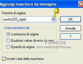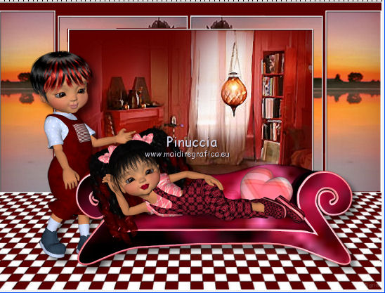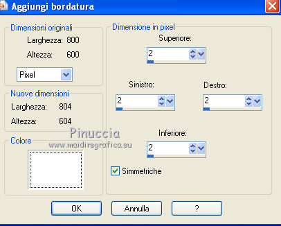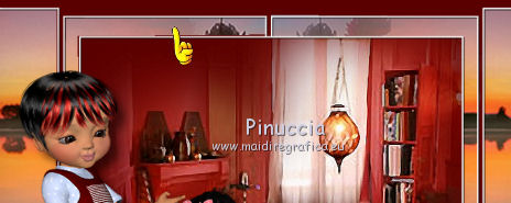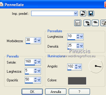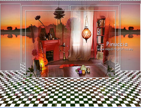 qui puoi trovare qualche risposta ai tuoi dubbi. Se l'argomento che ti interessa non è presente, ti prego di segnalarmelo. Questo tutorial è stato creato con PSP X2, ma può essere eseguito anche con le altre versioni di PSP. Per tradurlo, ho usato PSP X. Il materiale viene da vari gruppi di condivisione. Il copyright appartiene ai rispettivi autori. Grazie ai creatori dei tubes che mettono a disposizione il loro lavoro in vari gruppi di condivisione. Rispetta il lavoro degli autori, non cambiare il nome del file e non cancellare il watermark. Occorrente: Uno o due tubes a scelta. Il resto del materiale qui Per i tubes grazie Wiffiii Filtri Xero - Improver qui Penta.com - Dot and Cross qui ![]() Se intendi usare il font, aprilo e minimizzalo. Lo troverai nella lista dei font disponibili quando ti serviranno. Apri la maschera in PSP e minimizzala con il resto del materiale. 1. Scegli un colore scuro dai tuoi tubes e impostalo come colore di sfondo. imposta il colore di primo piano con il colore bianco. Apri una nuova immagine trasparente 800 x 600 pixels, e riempila con il colore scuro di sfondo.Livelli>Nuovo livello raster. Riempi con il colore bianco.Livelli>Nuovo livello maschera>Da immagine. Apri il menu sotto la finestra di origine e vedrai la lista dei files aperti. Seleziona la maschera maske233_sigrid, con i seguenti settaggi: ![]() Livelli>Unisci>Unisci gruppo. Effetti>Effetti 3D>Sfalsa ombra. ![]() 2. Apri "Paysage 06.11.10.02 tubes & mists Corinne.vicaire" e vai a Modifica>Copia. Torna al tuo lavoro e vai a Modifica>Incolla come nuovo livello. Livelli>Disponi>Sposta giù. Sposta il tube a destra contro il bordo.![]() Livelli>Duplica. Immagine>Rifletti. Rimani su questo livello (il livello della maschera è in cima alla paletta). Apri "12283242558_divers_nikita" e vai a Modifica>Copia. Torna al tuo lavoro e vai a Modifica>Incolla come nuovo livello. Posiziona il tube al centro della maschera.![]() Attiva lo strumento Selezione a mano libera , da punto a punto,![]() e seleziona le parti laterali della maschera, come nell'esempio. ![]() Attiva il livello del tube al centro, e premi sulla tastiera il tasto CANC. Selezione>Inverti. Attiva il livello del primo paesaggio e premi sulla tastiera il tasto CANC. Attiva il livello del secondo paesaggio e premi sulla tastiera il tasto CANC. Selezione>Deseleziona. Risultato. ![]() 3. Copia e incolla uno o due tube sull'immagine. Se necessario ridimensiona. Effetti>Plugins>Xero - Improver: ![]() Effetti>Effetti 3D>Sfalsa ombra. ![]() Attiva nuovamente il livello della maschera. Clicca con la bacchetta magica nello spazio vuoto in alto.![]() Attiva il livello sottostante del tube al centro e premi sulla tastiera il tasto CANC. Selezione>Deseleziona. 4. Attiva il livello del tube del paesaggio di destra. Attiva lo strumento Gomma e cancella le tracce del tube a sinistra.![]() Attiva il livello del paesaggio di sinistra e cancella le tracce a destra.![]() Risultato. ![]() Livelli>Unisci>Unisci visibile. Livelli>Duplica. Immagine>Ridimensiona, all'85%, tutti i livelli non selezionato. Attiva il livello inferiore. Regola>Sfocatura>Sfocatura gaussiana - raggio 5. ![]() Effetti>Effetti tecniche di disegno>Pennellate. ![]() 5. Effetti>Plugins>Penta.com - Dot and Cross. ![]() Attiva nuovamente il livello superiore. Effetti>Effetti 3D>Sfalsa ombra. ![]() Ripeti l'Effetto Sfalsa ombra, cambiando verticale e orizzontale con -10. Apri "ecken" e vai a Modifica>Copia. Torna al tuo lavoro e vai a Modifica>Incolla come nuovo livello. Scrivi un tuo testo o usa il file di testo fornito con il materiale. Aggiungi su un nuovo livello il tuo nome e/o il tuo watermark, senza dimenticare il copyright delle immagini usate. Livelli>Unisci>Unisci tutto. Immagine>Aggiungi bordatura, 2 pixels, simmetriche, con il colore bianco. ![]() Immagine>Ridimensiona, a 800 pixels di larghezza, tutti i livelli selezionato. Salva in formato jpg. ![]() Se hai problemi o dubbi, o trovi un link non funzionante, o anche soltanto per un saluto, scrivimi 17 Luglio 2011 |