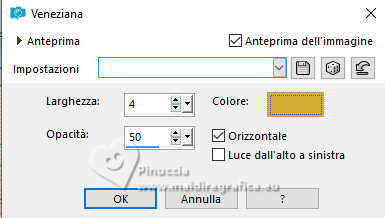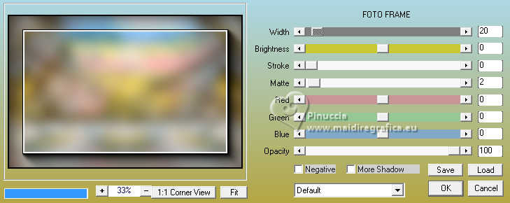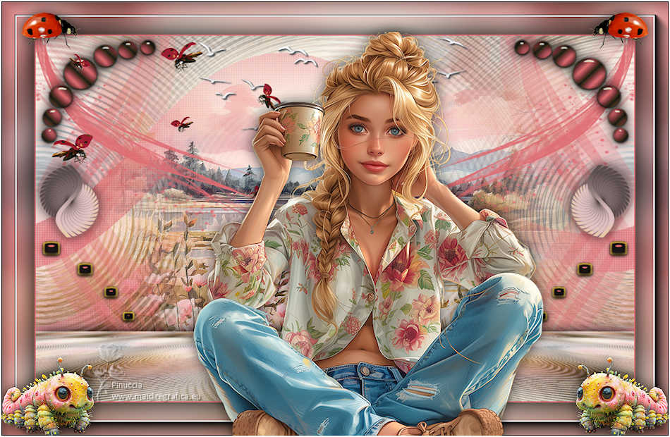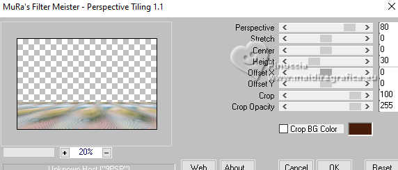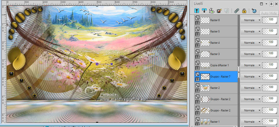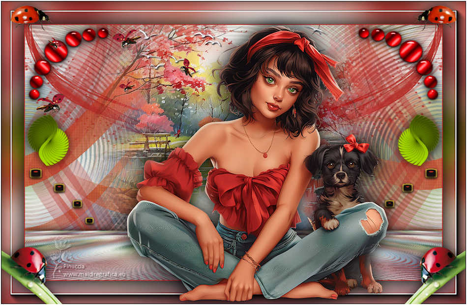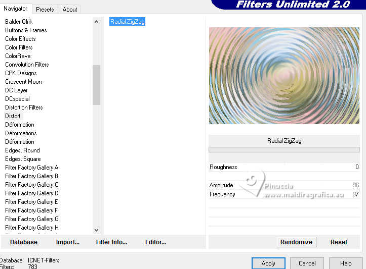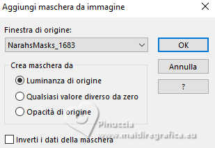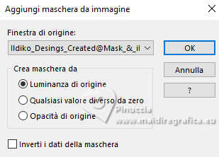 qui puoi trovare qualche risposta ai tuoi dubbi. Se l'argomento che ti interessa non è presente, ti prego di segnalarmelo. Questo tutorial è stato realizzato con PSP2019 e tradotto con PSPX9 e PSP2020, ma può essere realizzato anche con le altre versioni di PSP. Dalla versione X4, il comando Immagine>Rifletti è stato sostituito con Immagine>Capovolgi in orizzontale, e il comando Immagine>Capovolgi con Immagine>Capovolgi in verticale. Nelle versioni X5 e X6, le funzioni sono state migliorate rendendo disponibile il menu Oggetti. Con la nuova versione X7, sono tornati Rifletti>Capovolgi, ma con nuove varianti. Vedi la scheda sull'argomento qui Grazie ai creatori dei tubes che mettono a disposizione il loro lavoro in vari gruppi di condivisione. Rispetta il lavoro degli autori, non cambiare il nome del file e non cancellare il watermark. traduzione francese qui traduzione inglese qui Le vostre versioni qui![]() Occorrente: Tubes a scelta (i tubes usati da Inge-Lore sono sotto licenza) Il resto del materiale ![]() Per il mio esempio ho usato tubes di Adrienne. (in questa pagina trovi i links ai siti dei creatori di tubes) ![]() in caso di dubbi, ricorda di consultare la mia sezione filtri qui Filters Unlimited 2.0 qui Distort - Radial ZigZag - nel materiale, da importare in Unlimited Mura's Meister - Perspective Tiling qui FM Tile Tools - Saturation Emboss qui ![]() non esitare a cambiare modalità di miscelatura e opacità secondo i colori utilizzati. ![]() Apri le maschere in PSP e minizzale con il resto del materiale. 1. Scegli dai tuoi tubes un colore chiaro e un colore scuro. I miei colori ![]() Apri una nuova immagine trasparente 1000 x 650 pixels. Selezione>Seleziona tutto. Apri l'immagine di sfondo Pretty in Pink Paper (4) ![]() Modifica>Copia. Torna al tuo lavoro e vai a Modifica>Incolla nella selezione. Selezione>Deseleziona. Effetti>Effetti di immagine>Motivo unico, con i settaggi standard. ![]() Regola>Sfocatura>Sfocatura da movimento. ![]() Modifica>Ripeti Sfocatura da movimento. 2. Effetti>Plugins>Filters Unlimited 2.0 - Distort - Radial ZigZag, con i settaggi standard ![]() Effetti>Effetti di immagine>Motivo unico. ![]() Livelli>Duplica. Effetti>Plugins>Mura's Meister - Perspective Tiling. ![]() Effetti>Effetti 3D>Sfalsa ombra, colore nero. ![]() Effetti>Effetti di riflesso>Specchio rotante, con i settaggi standard. ![]() 3. Attiva il livello Raster 1. Livelli>Nuovo livello raster. Riempi con il colore scuro.Livelli>Nuovo livello maschera>Da immagine. Apri il menu sotto la finestra di origine e vedrai la lista dei files aperti. Seleziona la maschera 0303 ![]() Effetti>Effetti di bordo>Aumenta. Livelli>Unisci>Unisci gruppo. Effetti>Effetti di trama>Veneziana, colore chiaro. ![]() Ripeti l'Effetto Veneziana, orizzontale non selezionato. ![]() 4. Livelli>Nuovo livello raster. Riempi con il colore scuro.Livelli>Nuovo livello maschera>Da immagine. Apri il menu sotto la finestra di origine e seleziona la maschera Ildiko_Desings_Created@mask_&ildiko(25) ![]() Effetti>Effetti di bordo>Aumenta. Livelli>Unisci>Unisci gruppo. Tasto K per attivare lo strumento Puntatore ![]() in modalità Scala ![]() spingi nodi centrali a destra e a sinistra fino ai bordi ![]() Attiva il livello superiore e spingi il bordo del filtro Mura verso il basso, come nell'esempio ![]() Attiva nuovamente il livello sottostante della maschera. Apri il misted Pretty in Pink Paper (4) ![]() Modifica>Copia. Torna al tuo lavoro e vai a Modifica>Incolla come nuovo livello. Immagine>Ridimensiona, se necessario. Regola>Messa a fuoco>Metti a fuoco. Effetti>Plugins>FM Tile Tools - Saturation Emboss, con i settaggi standard. ![]() 5. Attiva il livello superiore. Apri deco-1 ![]() Modifica>Copia. Torna al tuo lavoro e vai a Modifica>Incolla come nuovo livello. Tasto K per attivare lo strumento Puntatore ![]() e imposta Posizione X: 6,00 e Posizione Y: 6,00. ![]() Livelli>Duplica. Immagine>Rifletti>Rifletti orizzontalmente (Immagine>Rifletti). Livelli>Unisci>Unisci giù. Effetti>Effetti 3D>Sfalsa ombra, colore nero. ![]() Apri deco-2 ![]() Modifica>Copia. Torna al tuo lavoro e vai a Modifica>Incolla come nuovo livello. Strumento Puntatore ![]() e imposta Posizione X: 2,00 e Posizione Y: 223,00. ![]() Livelli>Duplica. Immagine>Rifletti>Rifletti orizzontalmente (Immagine>Rifletti). Livelli>Unisci>Unisci giù. Effetti>Effetti 3D>Sfalsa ombra, con i settaggi precedenti. 6. Apri LA_Deco 1 ![]() Modifica>Copia. Torna al tuo lavoro e vai a Modifica>Incolla come nuovo livello. Oggetti>Allinea>Superiore. Apri deco-3 ![]() Modifica>Copia. Torna al tuo lavoro e vai a Modifica>Incolla come nuovo livello. Strumento Puntatore ![]() e imposta Posizione X: 4,00 e Posizione Y: 360,00. ![]() Livelli>Duplica. Immagine>Rifletti>Rifletti orizzontalmente (Immagine>Rifletti). Livelli>Unisci>Unisci giù. 7. Attiva il livello Raster 2. Livelli>Nuovo livello raster. Riempi il livello con il colore scuro.Livelli>Nuovo livello maschera>Da immagine. Apri il menu sotto la finestra di origine e seleziona la maschera NarahsMasks_1683 ![]() Effetti>Effetti di bordo>Aumenta. Livelli>Unisci>Unisci gruppo. Strumento Puntatore ![]() e imposta Posizione X: -165,00 e Posizione Y: 0,00. ![]() Livelli>Duplica. Immagine>Rifletti>Rifletti orizzontalmente (Immagine>Rifletti). Livelli>Unisci>Unisci giù. La tag e i livelli ![]() 8. Immagine>Aggiungi bordatura, 2 pixels, simmetriche, colore scuro. Modifica>Copia Livelli>Nuovo livello raster. Selezione>Seleziona tutto. Selezione>Modifica>Contrai - 50 pixels. Modifica>Incolla nella selezione Effetti>Effetti 3D>Sfalsa ombra, colore nero. ![]() Selezione>Deseleziona. 9. Attiva il livello inferiore. Regola>Sfocatura>Sfocatura gaussiana - raggio 25. ![]() Effetti>Plugins>AAA Frames - Foto Frame. ![]() Attiva il livello superiore. Apri Annevalerie_strawberryswing_el38 ![]() Modifica>Copia. Torna al tuo lavoro e vai a Modifica>Incolla come nuovo livello. Strumento Puntatore ![]() e imposta Posizione X: 76,00 e Posizione Y: 6