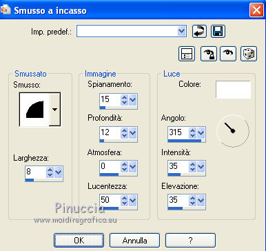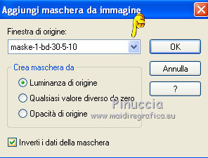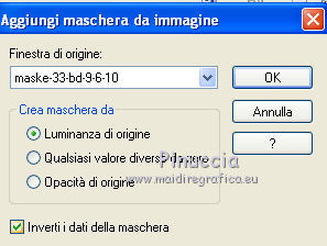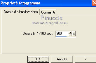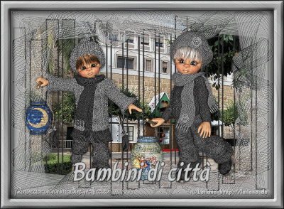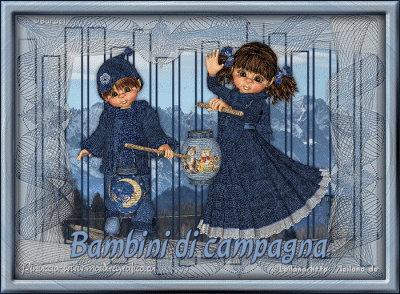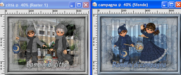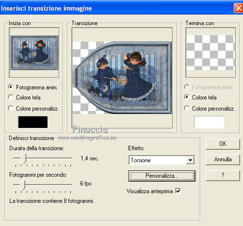 qui puoi trovare qualche risposta ai tuoi dubbi. Se l'argomento che ti interessa non è presente, ti prego di segnalarmelo. Questo tutorial è stato creato con PSP X2, ma può essere eseguito anche con le altre versioni di PSP. Per tradurlo, ho usato PSP X. Il materiale viene da vari gruppi di condivisione. Il copyright appartiene ai rispettivi autori. Grazie ai creatori dei tubes che mettono a disposizione il loro lavoro in vari gruppi di condivisione. Rispetta il lavoro degli autori, non cambiare il nome del file e non cancellare il watermark. Occorrente: Tube a scelta. Il resto del materiale qui Per i bei poser grazie Leilana Per i paesaggi grazie Bärbel Animation Shop qui 1. Città. Imposta il colore di primo piano con un colore chiaro, e il colore di sfondo con un colore scuro. Apri una nuova immagine trasparente 700 x 500 pixels, e riempila con il colore di sfondo.Livelli>Nuovo livello raster. Riempi con il colore di primo piano.Selezione>Seleziona tutto. Apri il tube del paesaggio cittadino bettina-haus-1-tube-bd-29-5-11. Modifica>Copia. Torna al tuo lavoro e vai a Modifica>Incolla nella selezione. Selezione>Deseleziona. Regola>Messa a fuoco>Metti a fuoco. Livelli>Nuovo livello maschera>Da immagine. Apri il menu sotto la finestra di origine e vedrai la lista dei files aperti. Seleziona la maschera "maske-1-bd-30-5-10", con i seguenti settaggi. ![]() Livelli>Unisci>Unisci gruppo. 2. Livelli>Nuovo livello raster. Riempi con il colore di primo piano.Livelli>Nuovo livello maschera>Da immagine. Apri il menu sotto la finestra di origine, e seleziona la maschera 33-bd-9-6-10. ![]() Livelli>Unisci>Unisci gruppo. Effetti>Effetti di bordo>Aumenta. (qui il risultato dipenderà dai colori scelti; dovrai regolarti di conseguenza). Effetti>Effetti 3D>Sfalsa ombra. ![]() Livelli>Duplica. Immagine>Rifletti. Immagine>Capovolgi. 3. Apri il tube del primo personaggio e vai a Modifica>Copia. Torna al tuo lavoro e vai a Modifica>Incolla come nuovo livello. Immagine>Ridimensiona, se e quanto necessario. Regola>Messa a fuoco>Metti a fuoco. Effetti>Effetti 3D>Sfalsa ombra. ![]() Nella paletta dei livelli porta il livello sotto i livelli della maschera, e rimani posizionato su questo livello. Apri il tube del secondo personaggio e vai a Modifica>Copia. Torna al tuo lavoro e vai a Modifica>Incolla come nuovo livello. Immagine>Ridimensiona, se e quanto necessario. Regola>Messa a fuoco>Metti a fuoco. Effetti>Effetti 3D>Sfalsa ombra, con i settaggi precedenti. Posiziona correttamente i due tubes.Attiva il livello superiore. Scrivi il tuo testo e aggiungi il tuo nome e/o il tuo watermark su un nuovo livello, senza dimenticare i copyright delle immagini usate. 4. Controlla che tutto sia correttamente posizionato, quando sei soddisfatto vai a Livelli>Unisci>Unisci tutto. Modifica>Copia. Immagine>Aggiungi bordatura, 2 pixels, simmetriche, con il colore di sfondo. Immagine>Aggiungi bordatura, 25 pixels, simmetriche, con il colore di primo piano. Immagine>Aggiungi bordatura, 25 pixels, simmetriche, con il colore di sfondo. Seleziona il bordo chiaro da 25 pixels con la bacchetta magica ![]() Livelli>Nuovo livello raster. Modifica>Incolla nella selezione. Regola>Sfocatura>Sfocatura radiale. ![]() Effetti>Effetti di bordo>Aumenta. Effetti>Effetti 3D>Sfalsa ombra. ![]() Ripeti l'Effetto Sfalsa ombra, cambiando verticale e orizzontale con -10. Effetti>Effetti 3D>Smusso a incasso. ![]() Selezione>Deseleziona. Livelli>Unisci>Unisci tutto. Immagine>Ridimensiona, a 700 pixels di larghezza, tutti i livelli selezionato. 5. Campagna. Ripeti tutti i passaggi dal punto 1 al punto 4, cambiando colori, paesaggio e personaggi. Alla fine avrai due immagini, che chiameremo "città" e "campagna". ![]() 6. Animazione. Attiva l'immagine "Città" e vai a Modifica>Copia. Apri Animation Shop e vai a Modifica>Incolla>Incolla come nuova animazione. Modifica>Duplica, e ripeti finchè l'animazione avrà 9 fotogrammi. Clicca sul primo fotogramma per selezionarlo e vai Modifica>Seleziona tutto. Torna in PSP. Attiva il lavoro "Campagna" e vai a Modifica>Copia. Torna in Animation Shop e vai a Modifica>Incolla>Incolla come nuova animazione. Effetti>Effetti di transizione immagine - seleziona l'effetto Torsione, con i seguenti settaggi. ![]() Ed ecco la tua animazione composta da 9 fotogrammi. Clicca sul primo fotogramma per selezionarlo e vai a Modifica>Seleziona tutto. Modifica>Copia. Attiva l'animazione della città e vai a Modifica>Incolla>Incolla nel fotogramma selezionato. Posiziona l'immagine esattamente sopra la precedente e, quando sei certo di aver trovato la posizione corretta, rilascia il tasto del mouse. Dovrai fare molta attenzione, perchè deve essere perfettamente centrata, per evitare "salti" nell'animazione. Dovresti avere questo. ![]() 7. Torna in PSP. Copia nuovamente l'immagine "Campagna". In Animation Shop: Modifica>Incolla>Incolla come nuova animazione. Modifica>Duplica, e ripeti finchè l'animazione avrà 9 fotogrammi. Clicca sul primo fotogramma per selezionarlo e vai Modifica>Seleziona tutto. In PSP. Copia nuovamente l'immagine "città" e vai a Modifica>Copia. Apri Animation Shop e vai a Modifica>Incolla>Incolla come nuova animazione. Effetti>Effetti di transizione immagine - effetto Torsione, con i settaggi precedenti. Clicca sul primo fotogramma per selezionarlo e vai a Modifica>Seleziona tutto. Modifica>Copia. Attiva l'animazione della campagna e vai a Modifica>Incolla>Incolla nel fotogramma selezionato. Anche qui fai molta attenzione posizionare perfettamente al centro l'immagine. Dovresti avere questo. ![]() Adesso dovrai unire le due animazioni. Attiva l'animazione della campagna sulla città. ![]() Modifica>Seleziona tutto. Modifica>Copia. Attiva l'animazione della città sulla campagna. Clicca sull'ultimo fotogramma per selezionarlo. ![]() Modifica>Incolla>Incolla dopo il fotogramma corrente. Adesso la tua animazione ha 18 fotogrammi. Clicca sul fotogramma N. 8 per selezionarlo e premi sulla tastiera il tasto CANC.