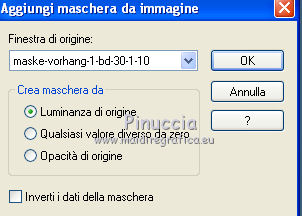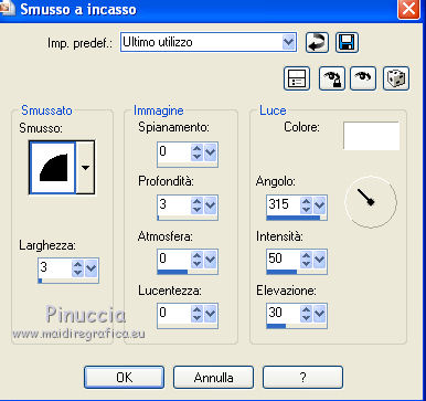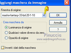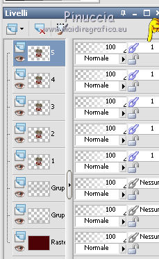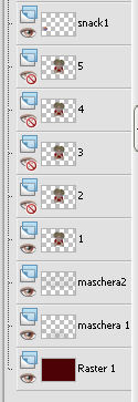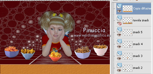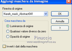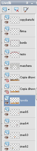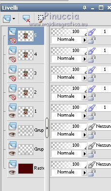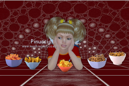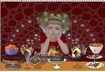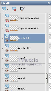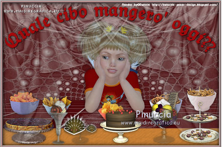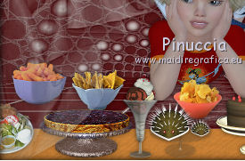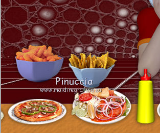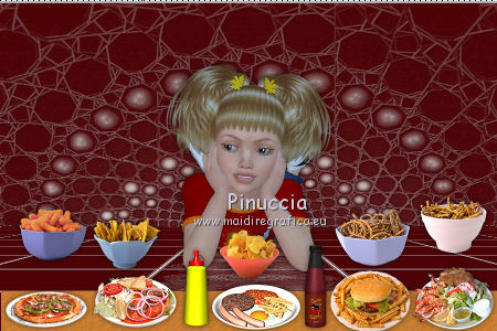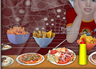 qui puoi trovare qualche risposta ai tuoi dubbi. Se l'argomento che ti interessa non è presente, ti prego di segnalarmelo. Questo tutorial è stato creato con PSP X2, ma può essere eseguito anche con le altre versioni di PSP. Per tradurlo, ho usato PSP X. Il materiale viene da vari gruppi di condivisione. Il copyright appartiene ai rispettivi autori. Grazie ai creatori dei tubes che mettono a disposizione il loro lavoro in vari gruppi di condivisione. Rispetta il lavoro degli autori, non cambiare il nome del file e non cancellare il watermark. Occorrente: Materiale qui Il copyright del materiale è di Batschi e Barbara. I poser di Batschi sono stati creati esclusivamente per Ingelore e questo tutorial. Puoi usarli per la realizzazione, ma non puoi usarli per altri tutorial. Animation Shop qui Trovi i poser dei cibi qui Food-mix - Montag.14.November 2011 Süsses - Donnerstag,20.Oktober 2011 Food 1+2 - Donnerstag, 22.September 2011 Apri le 3 maschere in PSP e minimizzale con il resto del materiale. 1. Scegli dai tuoi tubes un colore chiaro per il colore di primo piano, e un colore scuro per il colore di sfondo. Apri una nuova immagine trasparente 900 x 600 pixels, e riempila con il colore di sfondo.Livelli>Nuovo livello raster. Riempi con il colore di primo piano.Livelli>Nuovo livello maschera>Da immagine. Apri il menu sotto la finestra di origine e vedrai la lista dei files aperti. Seleziona la maschera maske-fantasy-33-bd-20-1-10. ![]() Livelli>Unisci>Unisci gruppo. Effetti>Effetti di bordo>Aumenta. Se non visualizzi il righello, vai a Visualizza>Righelli. Attiva lo strumento Puntatore ![]() se stai usando PSP 9 strumento Deformazione ![]() oppure premi il tasto D, valido per tutte le versioni, e, usando il nodo superiore al centro, spingi l'immagine fino a 400 pixels. ![]() Per liberarti della griglia dello strumento clicca sulla manina ![]() 2. Attiva lo strumento Bacchetta magica ![]() e clicca sulla parte superiore per selezionarla. ![]() Livelli>Nuovo livello raster. Riempi con il colore di primo piano.Livelli>Nuovo livello maschera>Da immagine. Apri il menu sotto la finestra di origine, e seleziona la maschera "Narah_mask_Abstract041". ![]() Livelli>Unisci>Unisci gruppo. Effetti>Effetti di bordo>Aumenta. Su entrambi i livelli delle maschere: Effetti>Effetti 3D>Sfalsa ombra. ![]() Attiva il livello superiore. 3. Apri il poser "laufband1" e vai a Modifica>Copia. Torna al tuo lavoro e vai a Modifica>Incolla come nuovo livello. Immagine>Ridimensiona, al 50%, tutti i livelli non selezionato. Attenzione, questo e i poser successivi devono trovarsi esattamente nella stessa posizione, per non rovinare l'animazione. Un piccolo espediente per averli nella stessa posizione è di non spostarli finchè non li avrai aggiunti tutti. Effetti>Plugins>Xero - Improver. ![]() Effetti>Effetti 3D>Sfalsa ombra. ![]() Ripeti questo passaggio con i poser da "laufband2" a "laufband5". A questo punto, prima di posizionare correttamente i poser ed essere sicuro di averli nella medesima posizione, collega i livelli con lo stesso numero e rinomina da 1 a 5. ![]() Attiva il livello superiore, clicca sull'icona dello strumento Spostamento ![]() e vedrai che spostando il poser superiore gli altri si sposteranno contemporaneamente. Chiudi i livelli da 2 a 5. ![]() 4. Adesso copia e incolla i tubes scelti per la tavola sullo sfondo. Immagine>Ridimensiona, quando necessario, tutti i livelli non selezionato. Effetti>Plugins>Xero - Improver, con i settaggi precedenti. Effetti>Effetti 3D>Sfalsa ombra con i settaggi precedenti. Posizionali da destra a sinistra.![]() Attiva lo strumento Selezione , rettangolo,e traccia una selezione sul riquadro inferiore della maschera. ![]() Livelli>Nuovo livello raster. Imposta il colore di primo piano con un colore in armonia con quelli esistenti, per il mio esempio #c87e33, e riempi la selezione con questo colore.Effetti>Effetti di trama>Trama con una trama a tua scelta. Selezione>Deseleziona. Adesso aggiungi i cibi della tua tavola. Immagine>Ridimensiona, quanto necessario, tutti i livelli non selezionato. Effetti>Plugins>Xero - Improver, con i settaggi precedenti. Effetti>Effetti 3D>Sfalsa ombra con i settaggi precedenti. Disponi i tubes sulla tavola.Questo il mio risultato. ![]() Assicurati di essere posizionato sul livello superiore. Livelli>Unisci>Unisci giù, finchè non avrai i cibi in un unico livello. Attiva il livello della tavola. Livelli>Duplica. Attiva il livello sottostante dell'originale. Livelli>Unisci>Unisci giù. Chiudi questo livello e attiva nuovamente il livello della copia. E avrai nuovamente una tavola da riempire. ![]() Aggiungi altri cibi - per il mio esempio sono tutti dolci, con lo stesso procedimento usato per gli snack. Immagine>Ridimensiona, quanto necessario, tutti i livelli non selezionato. Effetti>Plugins>Xero - Improver, con i settaggi precedenti. Effetti>Effetti 3D>Sfalsa ombra con i settaggi precedenti. Disponi i cibi a tuo piacimento.Per il mio esempio. ![]() Assicurati di essere posizionato sul livello superiore di questi cibi. Livelli>Unisci>Unisci giù, finchè non avrai cibo e tavola su un unico livello. preparati uno scudo nel caso qualcosa vada storto. Duplica i due livelli e chiudili. ![]() Attiva uno alla volta i livelli originali e sposta il livello dei dolci a sinistra, e il livello dei cibi a destra, in modo che il taglio tra le due tavole non sia visibile. un consiglio per evitare sbalzi nell'animazione, per spostare i livelli usa le frecce della tastiera. Attenzione, però: quando cambi livello, ogni volta devi cliccare sull'icona dello Spostamento. ![]() Attiva il livello superiore dei due. Livelli>Unisci>Unisci giù. E lascia visibile soltanto una piccola parte del livello dei dolci. ![]() Attiva il livello superiore dei due. Livelli>Unisci>Unisci giù. 6. Livelli>Nuovo livello raster. Riempi con il colore bianco.Livelli>Nuovo livello maschera>Da immagine. Apri il menu sotto la finestra di origine e seleziona la maschera maske-vor