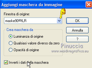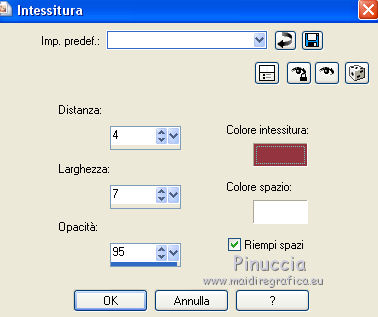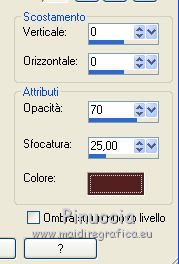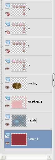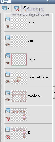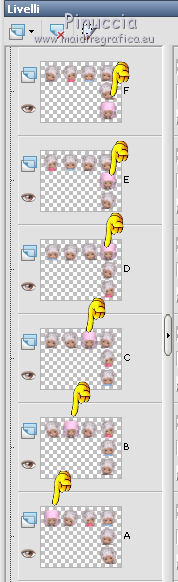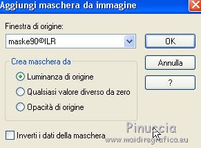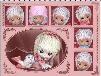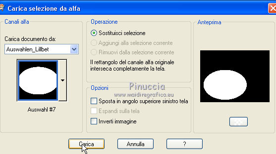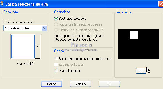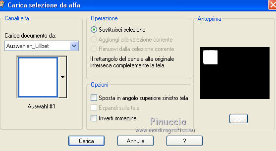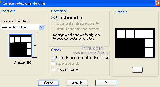 qui puoi trovare qualche risposta ai tuoi dubbi. Se l'argomento che ti interessa non è presente, ti prego di segnalarmelo. Questo tutorial è stato creato con PSP X5, ma può essere eseguito anche con le altre versioni di PSP. Per tradurlo, ho usato PSP X. Se stai usando le nuove versioni di PSP, a proposito delle funzioni Rifletti/Capovolgi, vedi la mia scheda qui Grazie ai creatori dei tubes che mettono a disposizione il loro lavoro in vari gruppi di condivisione. Rispetta il lavoro degli autori, non cambiare il nome del file e non cancellare il watermark. Occorrente: Tubes a scelta. Il resto del materiale qui Per i poser usati grazie Petra Per il frattale grazie Bärbel Filtri: Xero - Improver qui Animation Shop qui Apri la maschera in Psp e minimizzala con il resto del materiale. 1. Scegli due colori dai tuoi tube imposta il colore chiaro come colore di primo piano, e il colore scuro come colore di sfondo. Apri "Auswahldatei". L'immagine, che sarà la base del tuo lavoro, non è vuota, ma contiene le selezioni salvate sul canale alfa. Riempi l'immagine trasparente con il colore di sfondo.Apri "fire-fractal-298-bd-17-9-13 e vai a Modifica>Copia. Torna al tuo lavoro e vai a Modifica>Incolla come nuovo livello. Cambia la modalità di miscelatura di questo livello in Luminanza. Livelli>Nuovo livello raster. Riempi con il colore di primo piano.Livelli>Nuovo livello maschera>Da immagine. Apri il menu sotto la finestra di origine e vedrai la lista dei files aperti. Seleziona la maschera "maske90©ILR", con i seguenti settaggi. ![]() Livelli>Unisci>Unisci gruppo. Rinomina questo livello "maschera 1". 2. Livelli>Nuovo livello raster. Riempi con il colore di primo piano.Livelli>Nuovo livello maschera>Da immagine. Apri il menu sotto la finestra di origine e seleziona nuovamente la maschera "maske90©ILR", questa volta Inverti i dati della maschera non selezionato. ![]() Livelli>Unisci>Unisci gruppo. Effetti>Effetti 3D>Sfalsa ombra, con un colore più scuro del tuo colore di sfondo. ![]() Ripeti l'Effetto Sfalsa ombra, cambiando verticale e orizzontale con -1. Rinomina questo livello "maschera 2". Apri Cherkee_Overlay1 e vai a Modifica>Copia. Torna al tuo lavoro e vai a Modifica>Incolla come nuovo livello. Spostalo nell'ovale, un po' più in basso a sinistra, e porta questo livello sotto il livello della maschera. Selezione>Carica/Salva selezione>Carica selezione da canale alfa. Apri il menu delle selezioni e carica Auswahl#7. ![]() Selezione>Inverti. Premi sulla tastiera il tasto CANC ![]() Selezione>Deseleziona. 3. Apri il tube che hai scelto per l'ovale e vai a Modifica>Copia. Torna al tuo lavoro e vai a Modifica>Incolla come nuovo livello. Immagine>Ridimensiona, se e quanto necessario, tutti i livelli non selezionato. Effetti>Plugins>Xero - Improver. ![]() Effetti>Effetti 3D>Sfalsa ombra, con il colore più scuro che hai scelto con il primo sfalsa ombra. ![]() Posiziona il tube nell'ovale.Attiva il livello "maschera 1". Selezione>Carica/Salva selezione>Carica selezione da canale alfa. Apri il menu delle selezioni e carica Auswahl#8. ![]() Premi sulla tastiera il tasto CANC. Selezione>Deseleziona. 4. Apri uno dei tubes scelti per i riquadri. e vai a Modifica>Copia. Torna al tuo lavoro e vai a Modifica>Incolla come nuovo livello. Immagine>Ridimensiona, se e quanto necessario, tutti i livelli non selezionato. Posizionalo nel primo riquadro in alto a sinistra.Selezione>Carica/Salva selezione>Carica selezione da canale alfa. La selezione Auswahl #1 è subito disponibile. Devi soltanto cliccare Carica. ![]() Selezione>Inverti. Premi sulla tastiera il tasto CANC. Selezione>Deseleziona. Effetti>Plugins>Xero - Improver. ![]() Sposta questo livello sotto il livello "maschera 2", e rinominalo "1". Il livello "maschera 2" deve trovarsi sempre in alto, così, quando scrivo di spingere un livello verso l'alto, intendo sempre sotto la "maschera 2". 5. Apri il tube successivo per il secondo riquadro. Modifica>Copia. Torna al tuo lavoro e vai a Modifica>Incolla come nuovo livello. Immagine>Ridimensiona, se e quanto necessario, tutti i livelli non selezionato. Effetti>Plugins>Xero - Improver, con i settaggi precedenti. Effetti>Effetti 3D>Sfalsa ombra, con i settaggi precedenti. Posiziona il tube nel secondo riquadro,e rinomina il livello "2". Selezione>Carica/Salva selezione>Carica selezione da canale alfa. Apri il menu delle selezioni e carica Auswahl#2. ![]() Selezione>Inverti. Premi sulla tastiera il tasto CANC. Selezione>Deseleziona. Ripeti questo passaggio per tutti gli altri riquadri, e le selezioni del canale alfa 3, 4, 5 e 6. Alla fine dovresti avere questo. ![]() 6. Attenzione adesso a non confondersi. Duplica il livello "1", portalo sopra il livello "6" e chiudilo. Duplica il livello "2", portalo sopra il livello "1" e chiudilo. Duplica il livello "3", portalo sopra il livello "2" e chiudilo. Duplica il livello "4", portalo sopra il livello "3" e chiudilo. Duplica il livello "5", portalo sopra il livello "4" e chiudilo. Duplica il livello "6", portalo sopra il livello "5" e chiudilo. 7. Attiva nuovamente il livello "6" e vai a Livelli>Unisci>Unisci giù - 5 volte, in modo da avere i sei tubes su un unico livello. Rinomina questo livello "A" e chiudilo. 8. Riapri i livelli delle copie e rinominali dal basso in alto da "1" a "6". Come hai fatto prima: Duplica il livello "1", portalo sopra il livello "6" e chiudilo. Duplica il livello "2", portalo sopra il livello "1" e chiudilo. Duplica il livello "3", portalo sopra il livello "2" e chiudilo. Duplica il livello "4", portalo sopra il livello "3" e chiudilo. Duplica il livello "5", portalo sopra il livello "4" e chiudilo. Duplica il livello "6", portalo sopra il livello "5" e chiudilo. Posiziona i tubes dei livelli originali, scalandoli di una posizione, come nell'esempio. ![]() Quando hai finito, attiva il livello 6 e vai a Livelli>Unisci>Unisci giù - 5 volte e avrai i tubes sullo stesso livello. Rinomina questo livello "B" e chiudilo. 9. Ripeti il p